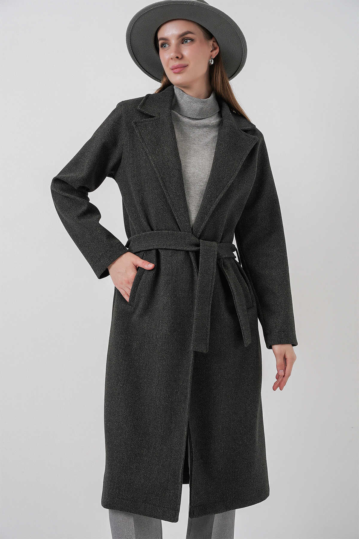 9118 Kruvaze Yaka Kaşe Kaban - Antrasit - Kombin
