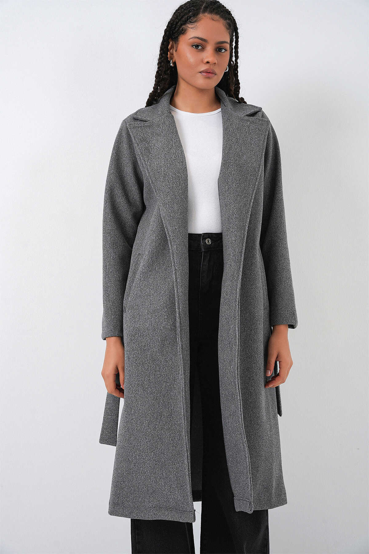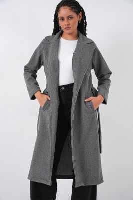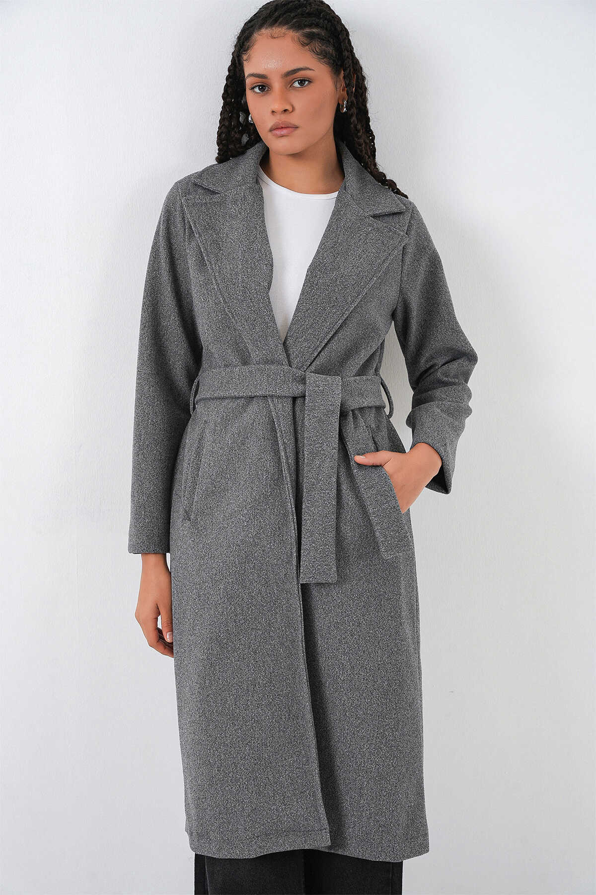 9118 Kruvaze Yaka Kaşe Kaban - Füme - Kombin
