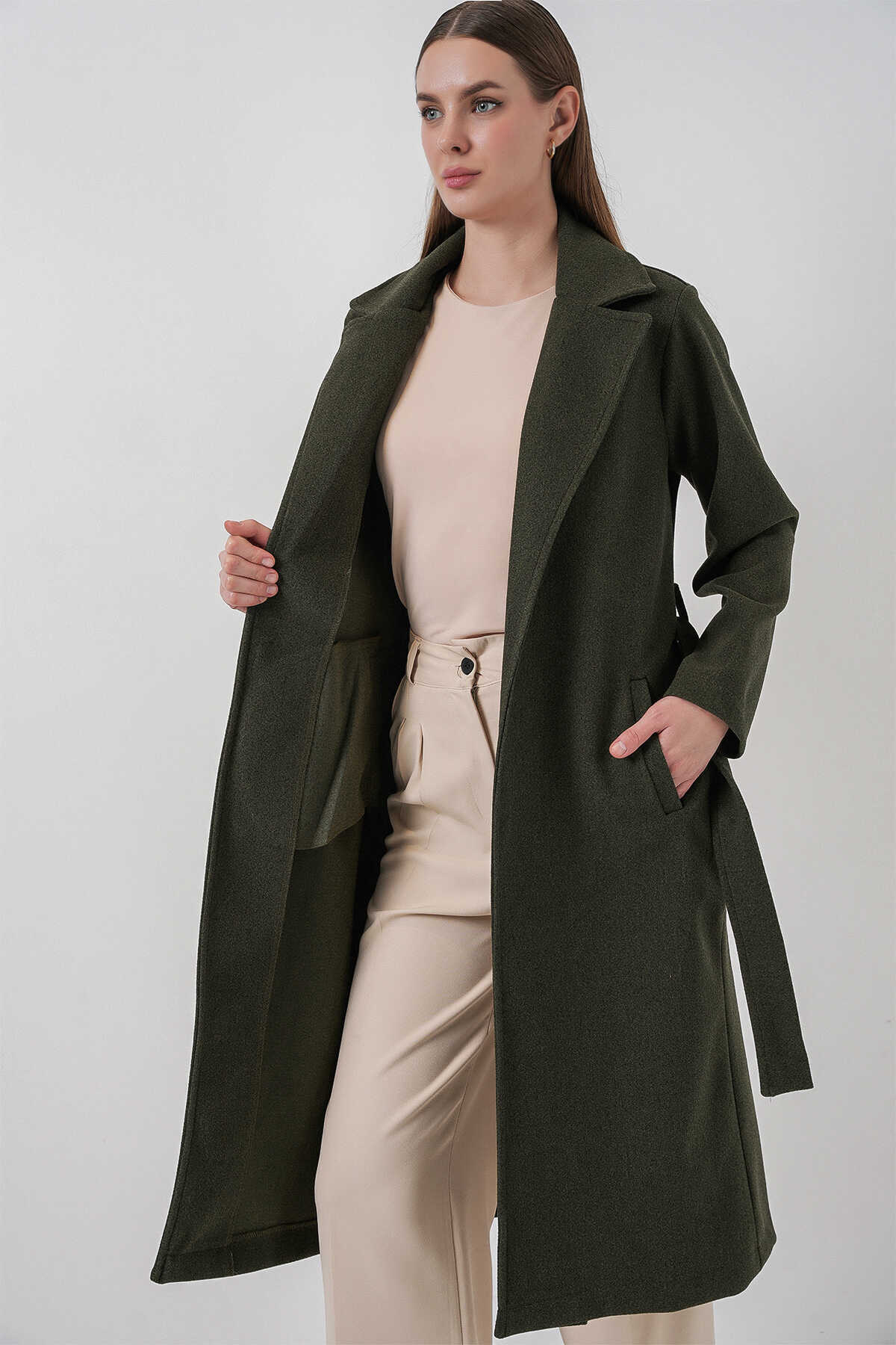 9118 Kruvaze Yaka Kaşe Kaban - Haki - Kombin