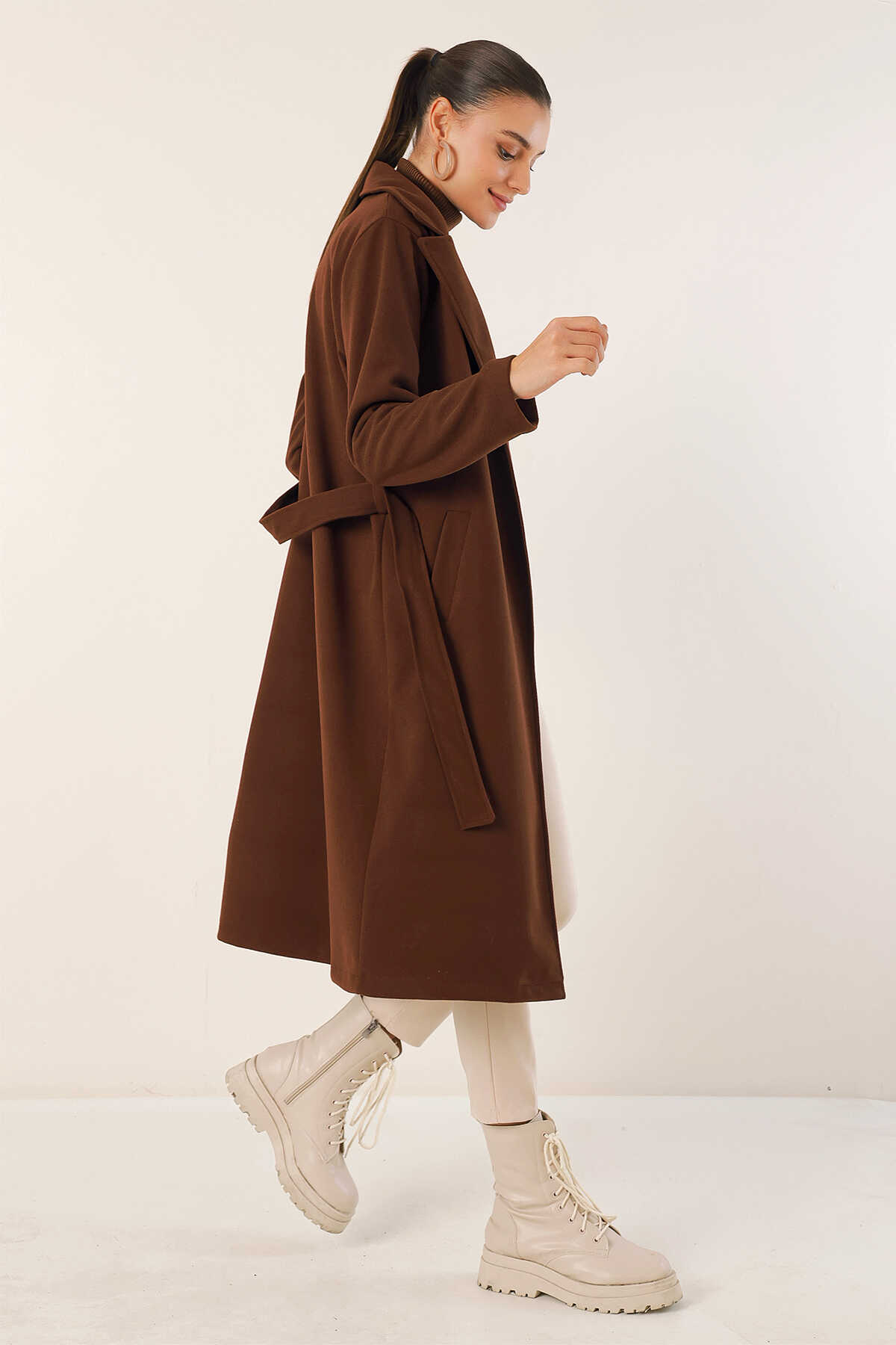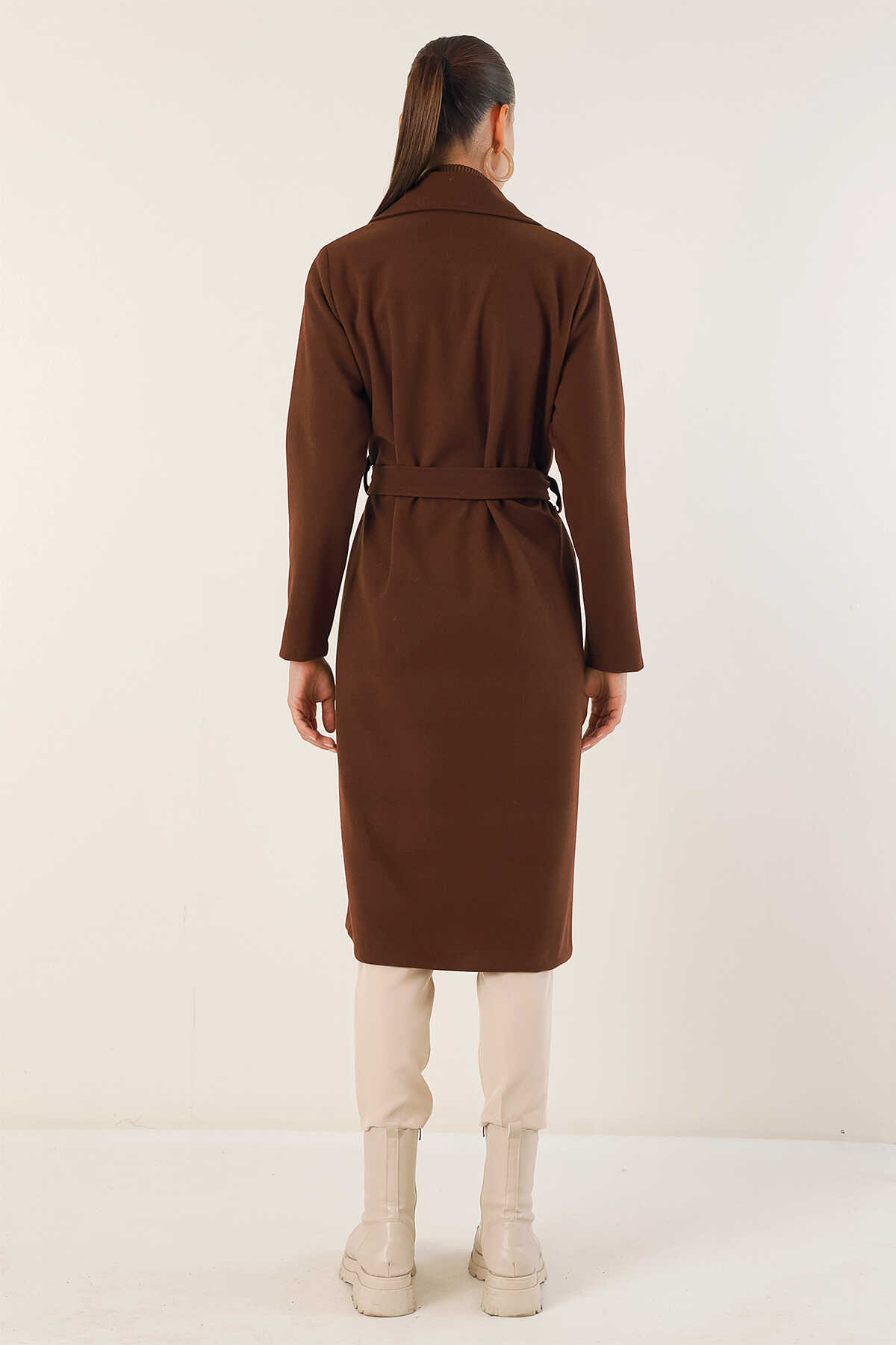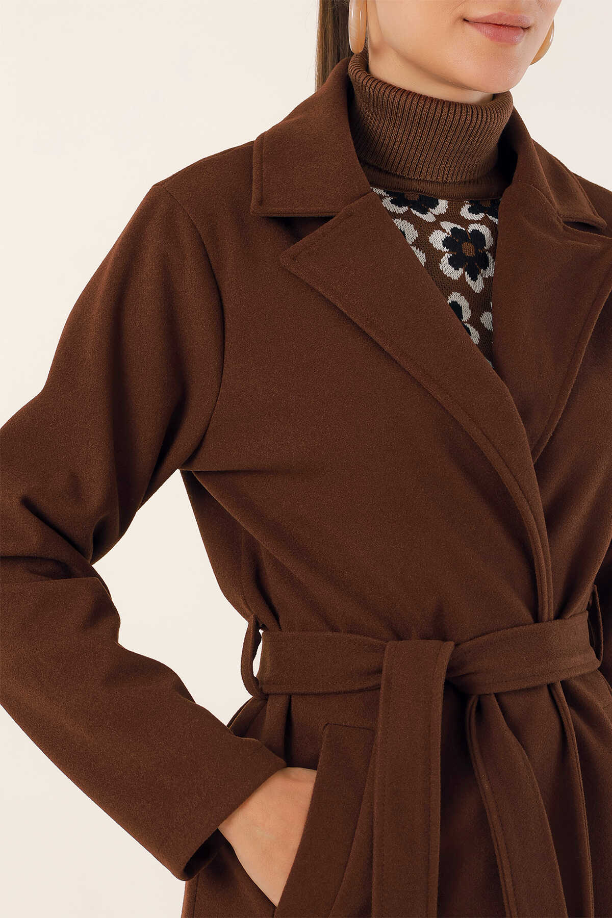 9118 Kruvaze Yaka Kaşe Kaban - Kahverengi