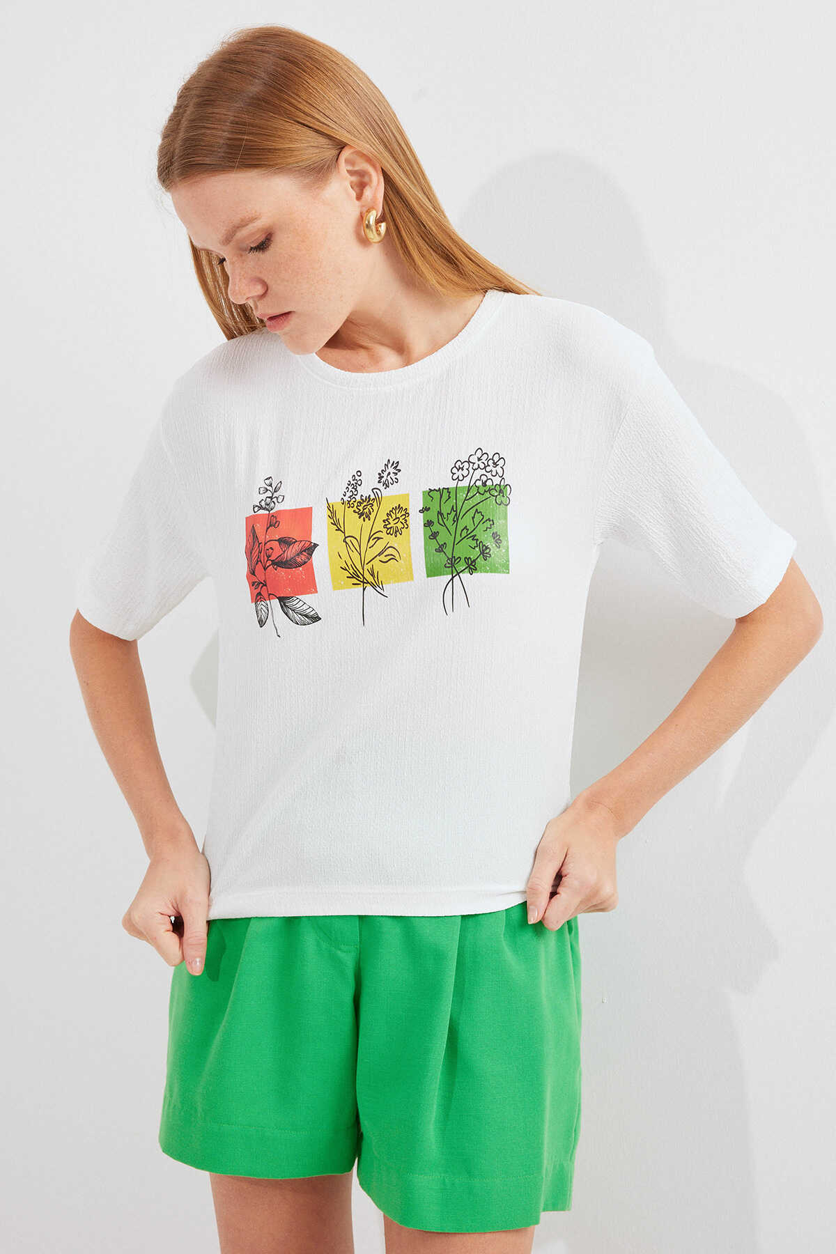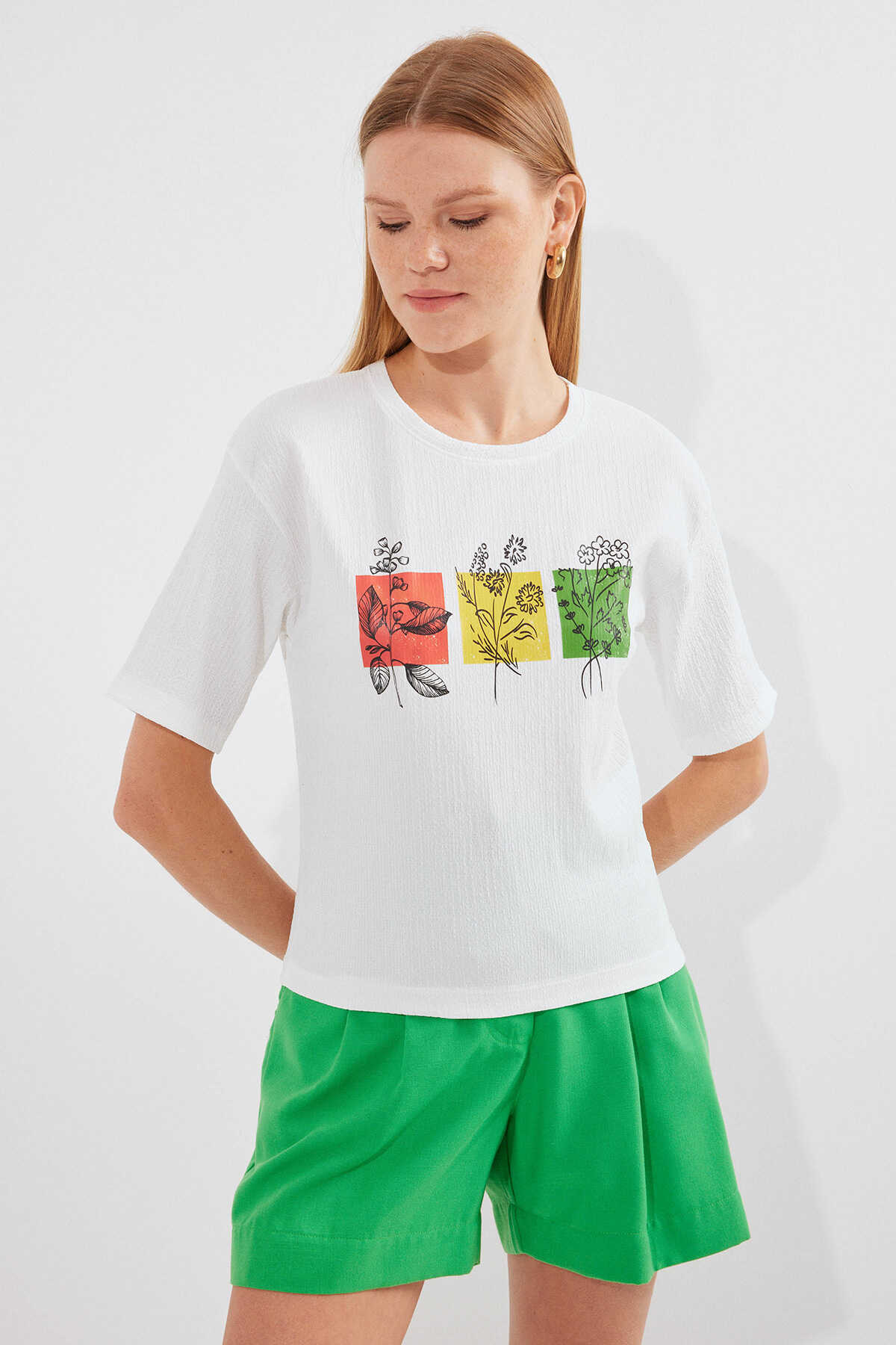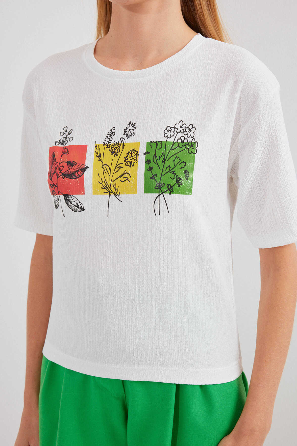 913 Baskılı Örme Basic Tişört - Beyaz - Kombin