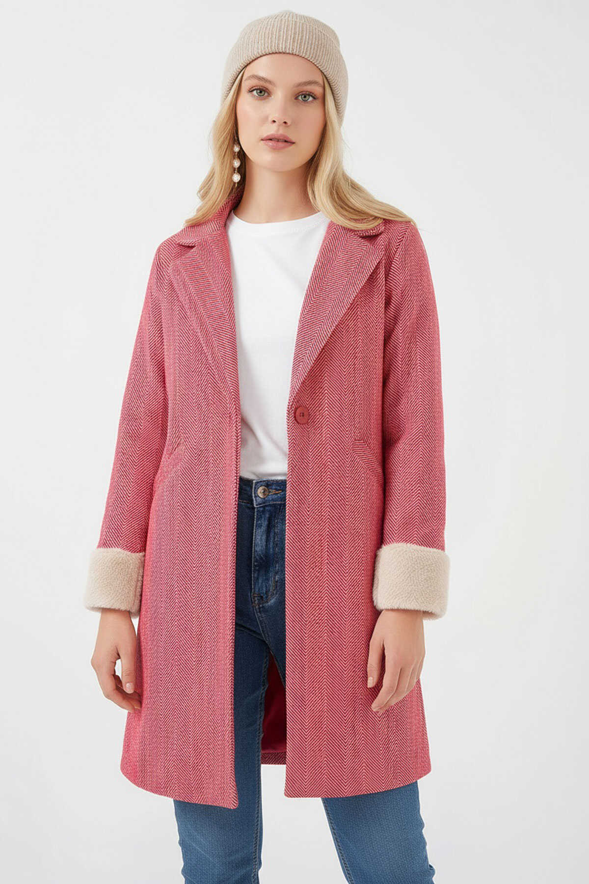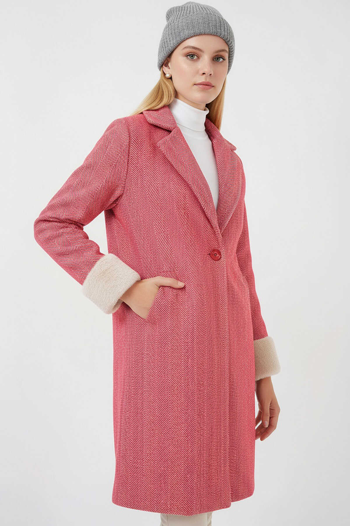 9145 Kadın Kolları Tüylü Balık Sırtı Kaşe Kaban - Kırmızı