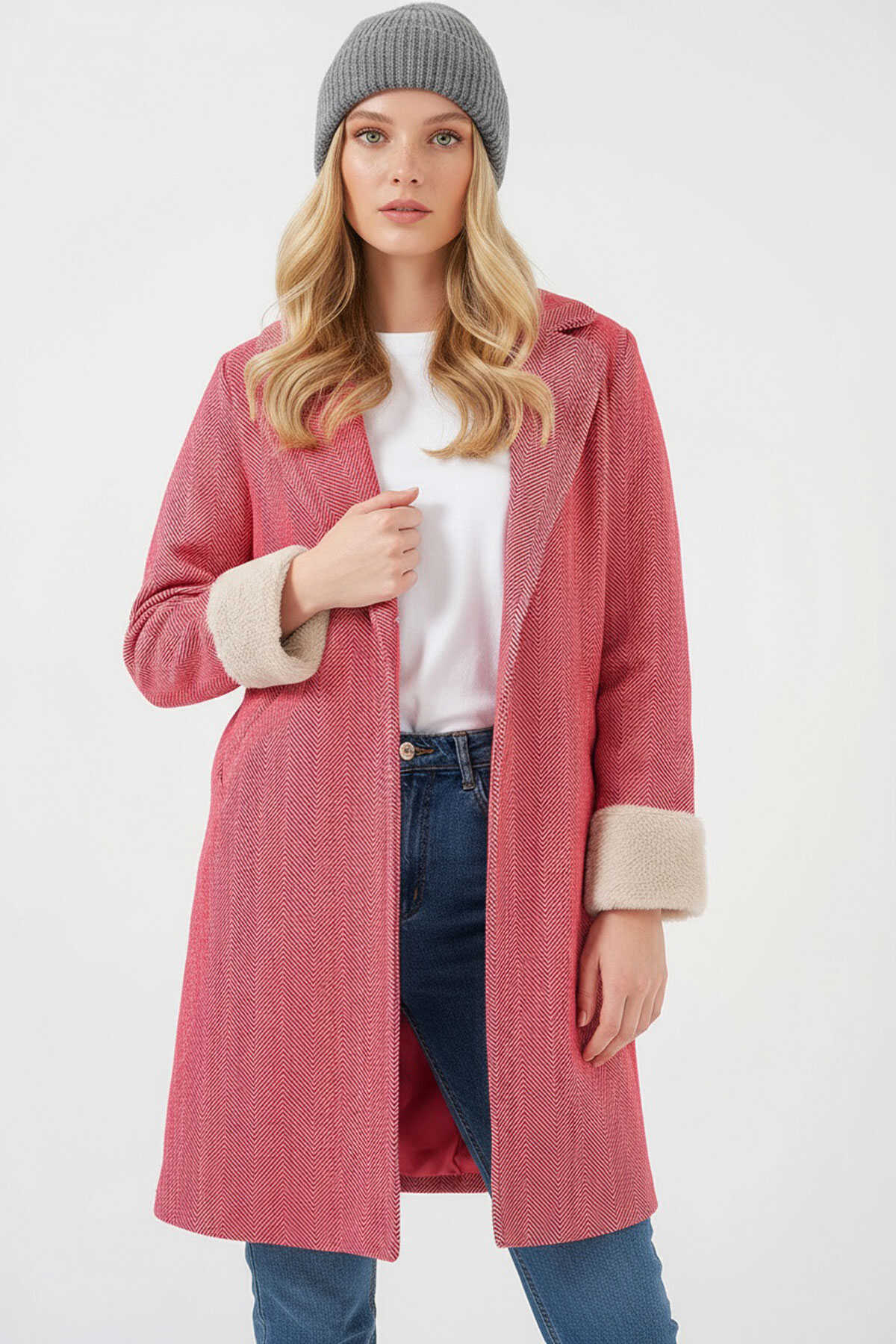 9145 Kadın Kolları Tüylü Balık Sırtı Kaşe Kaban - Kırmızı - Kombin