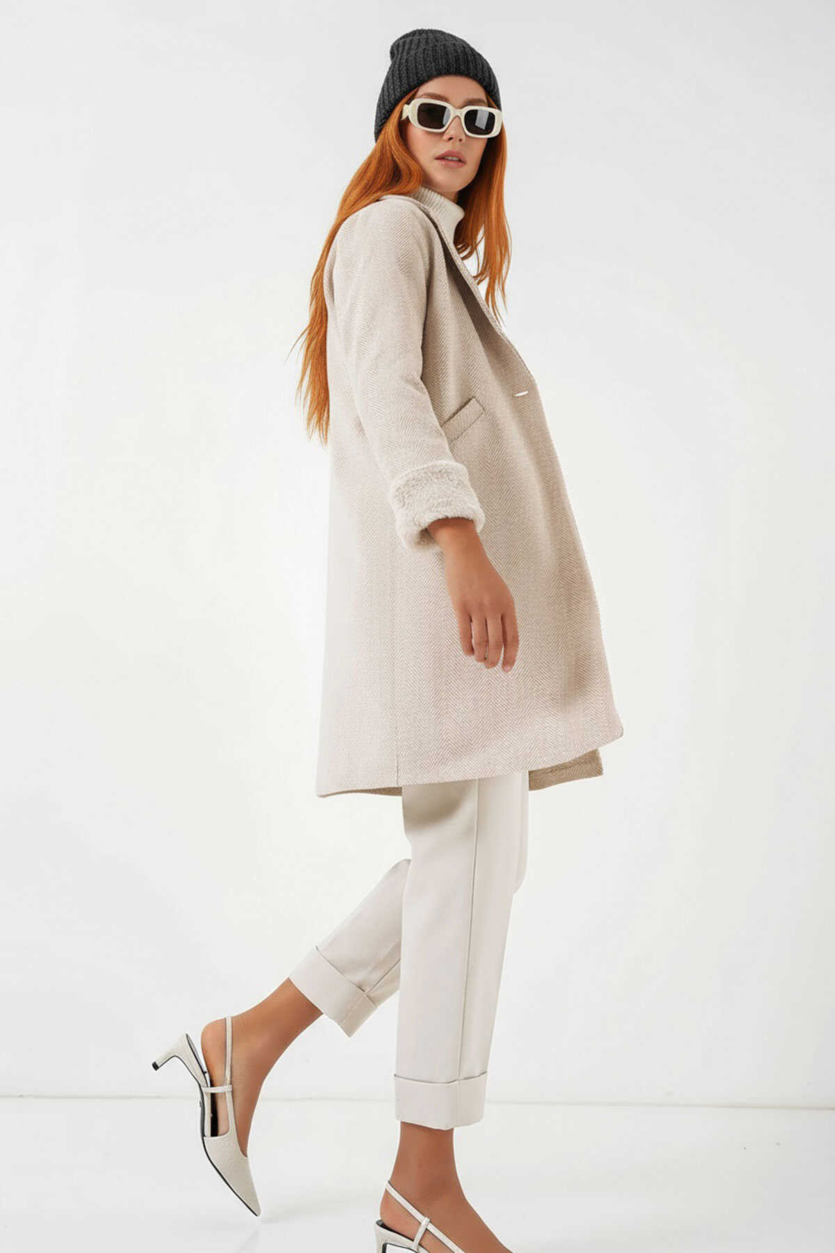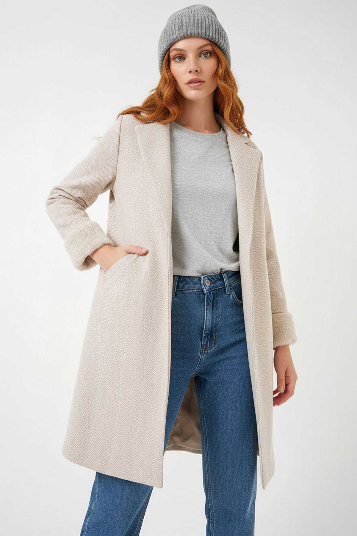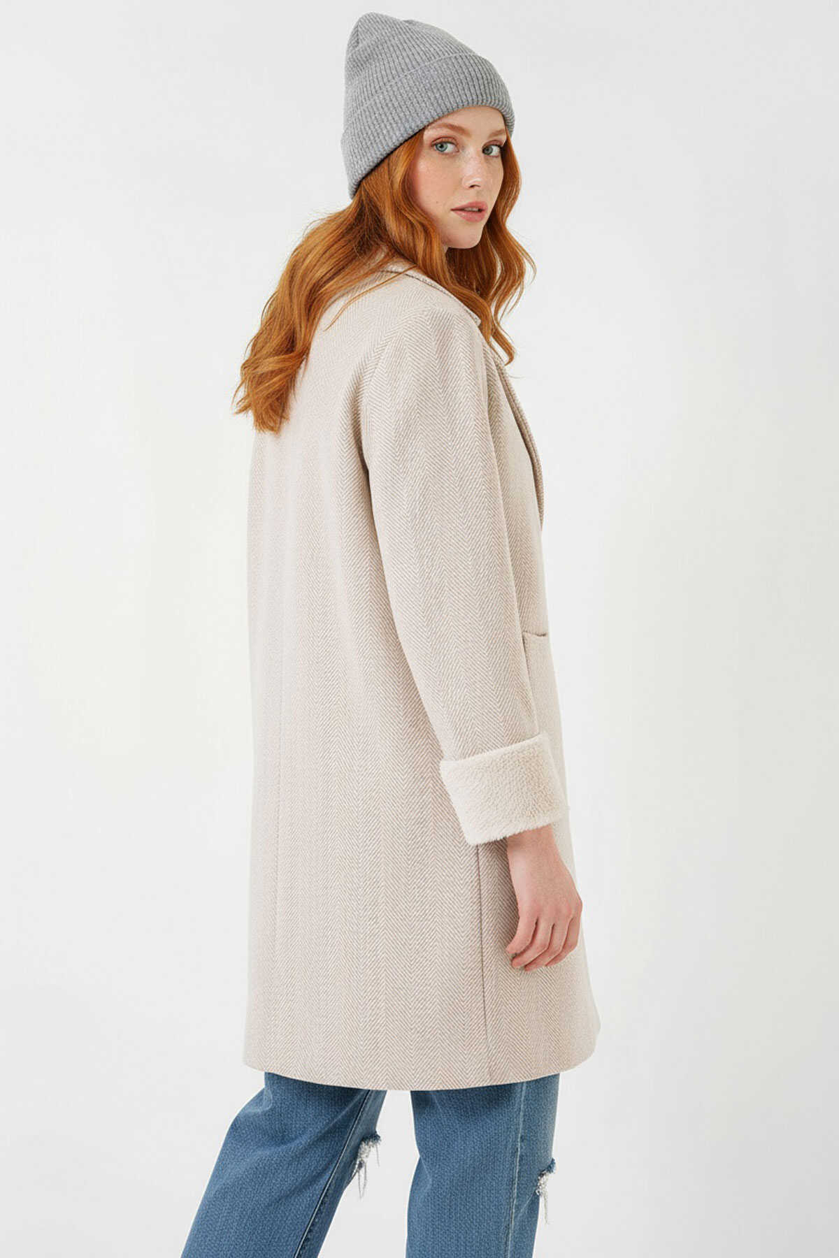 9145 Kadın Kolları Tüylü Balık Sırtı Kaşe Kaban - Krem - Kombin