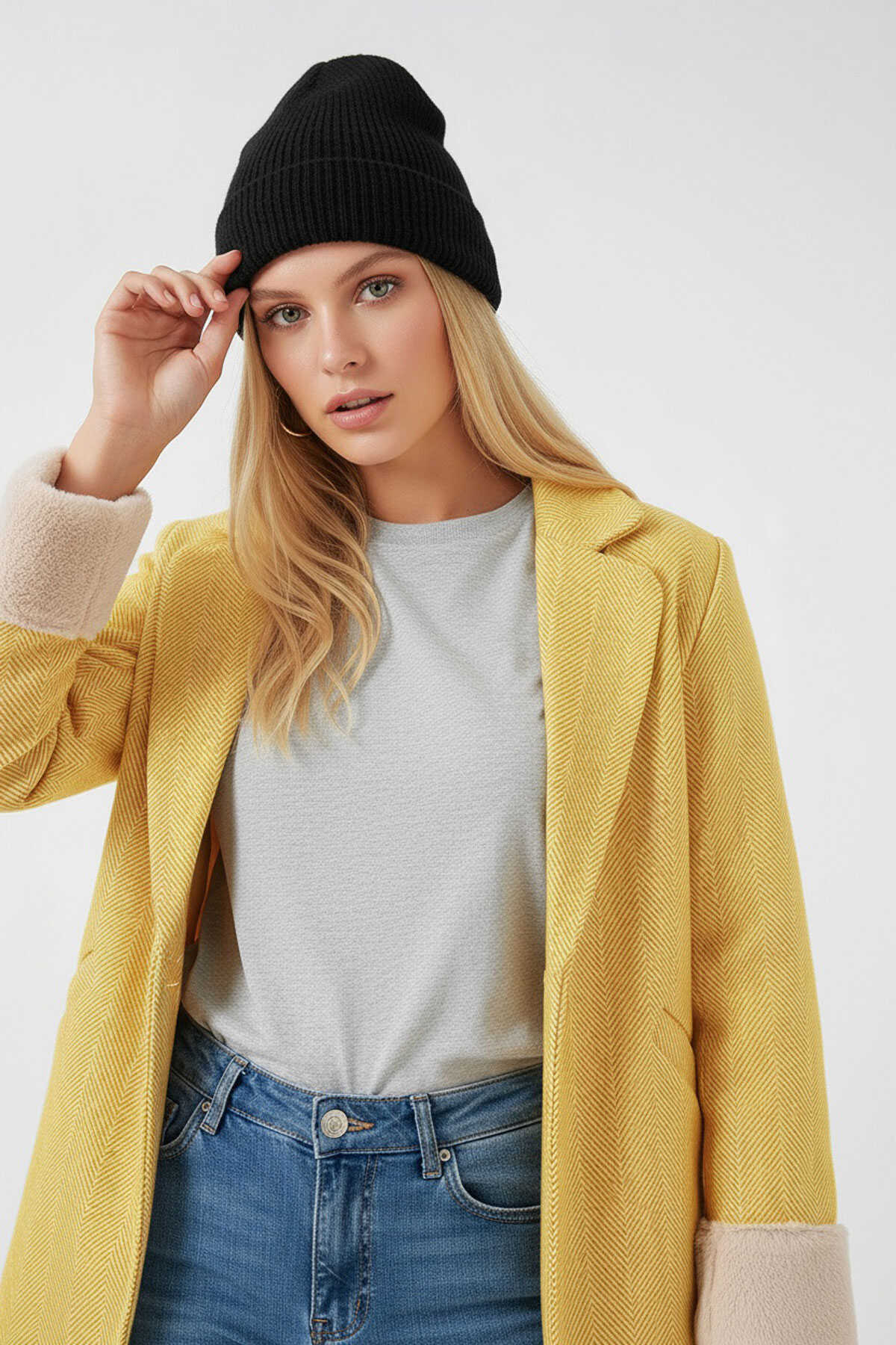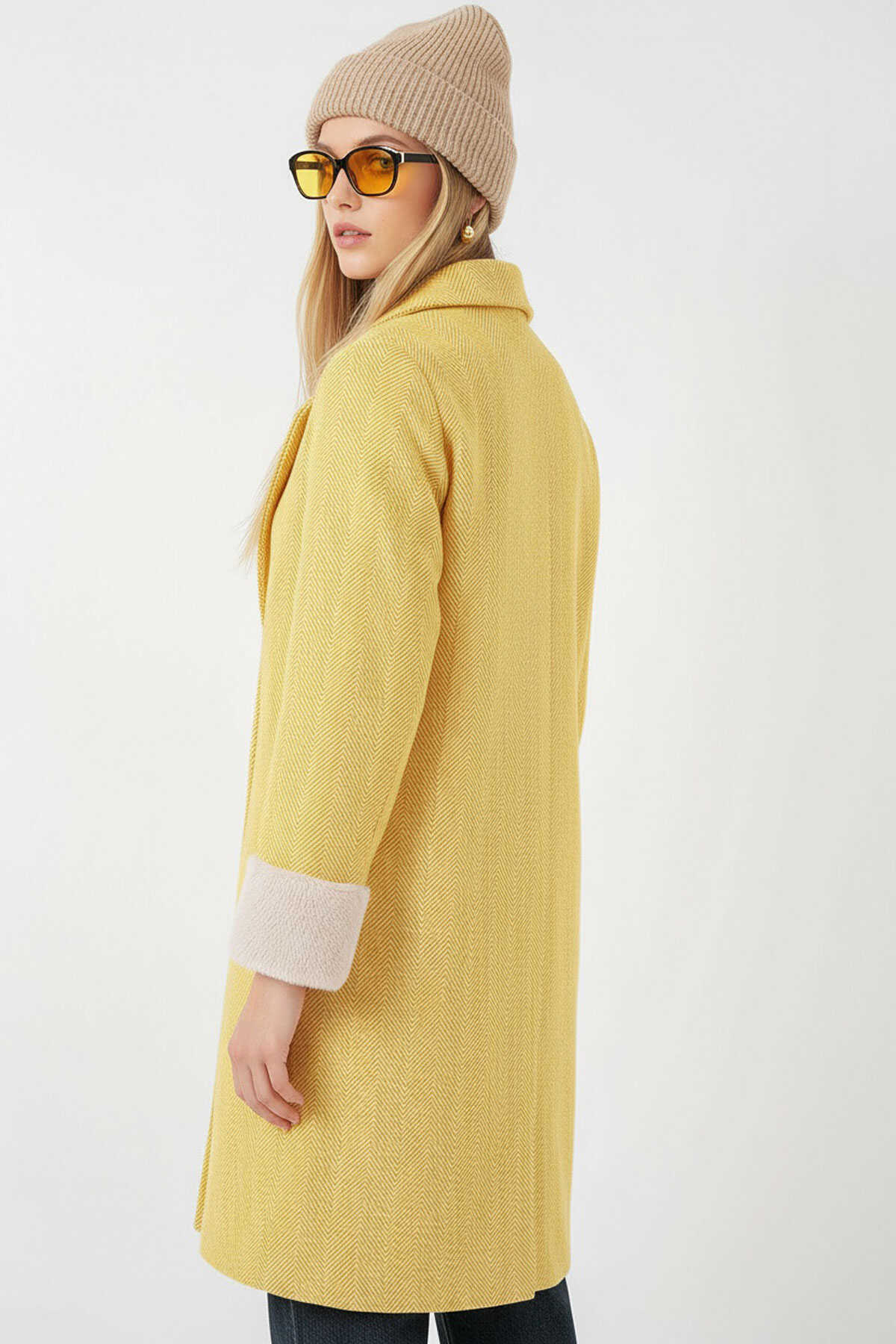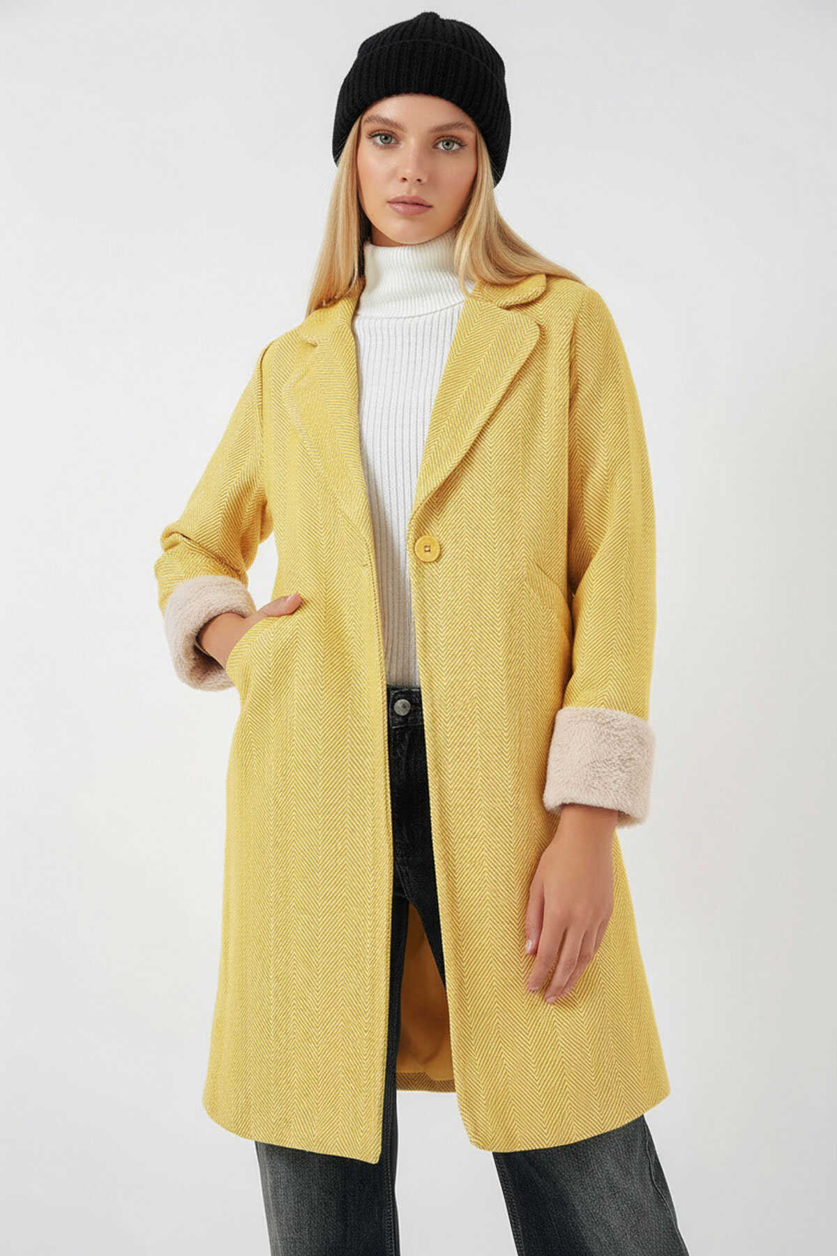 9145 Kadın Kolları Tüylü Balık Sırtı Kaşe Kaban - Sarı - Kombin