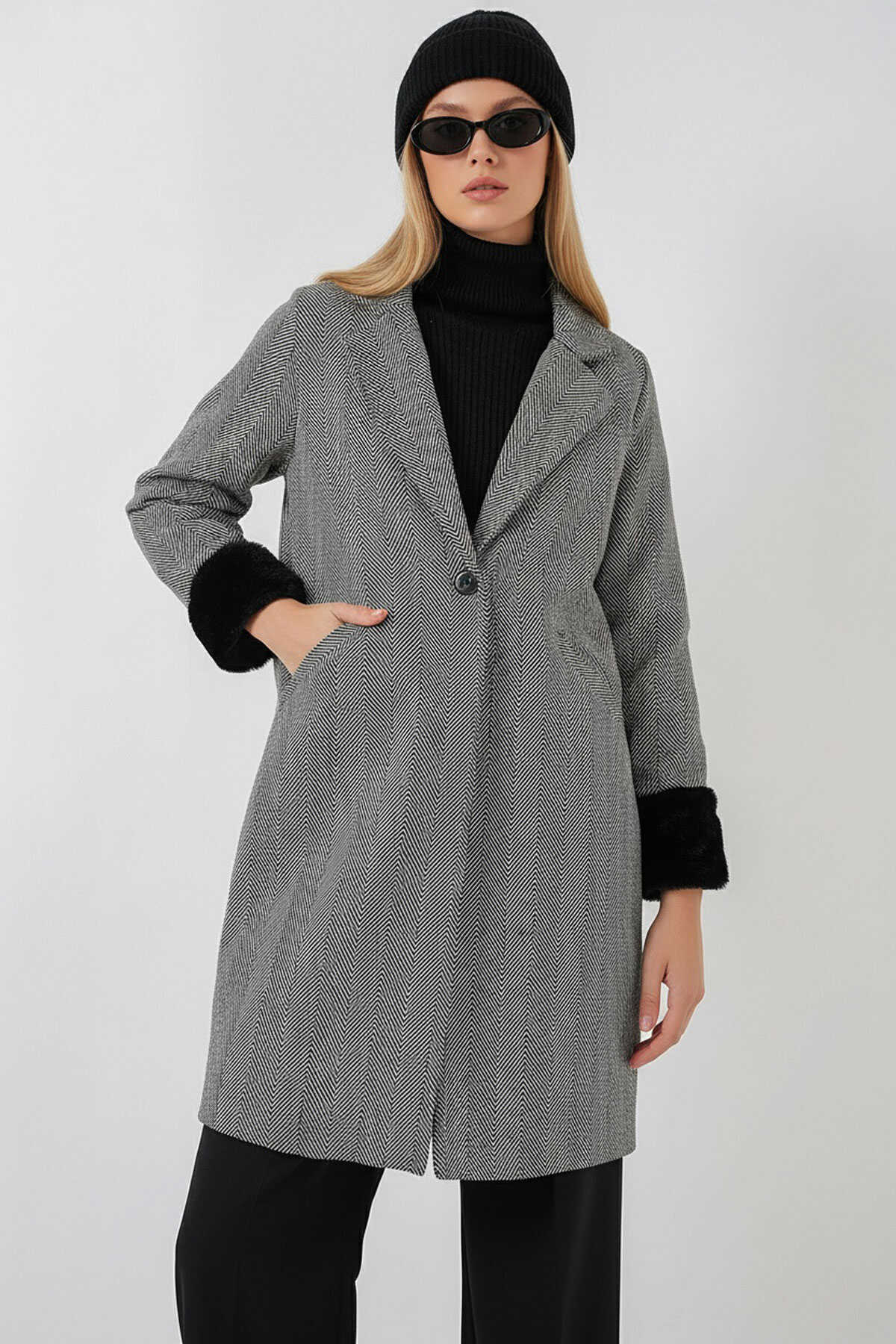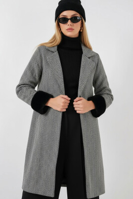 9145 Kadın Kolları Tüylü Balık Sırtı Kaşe Kaban - Siyah