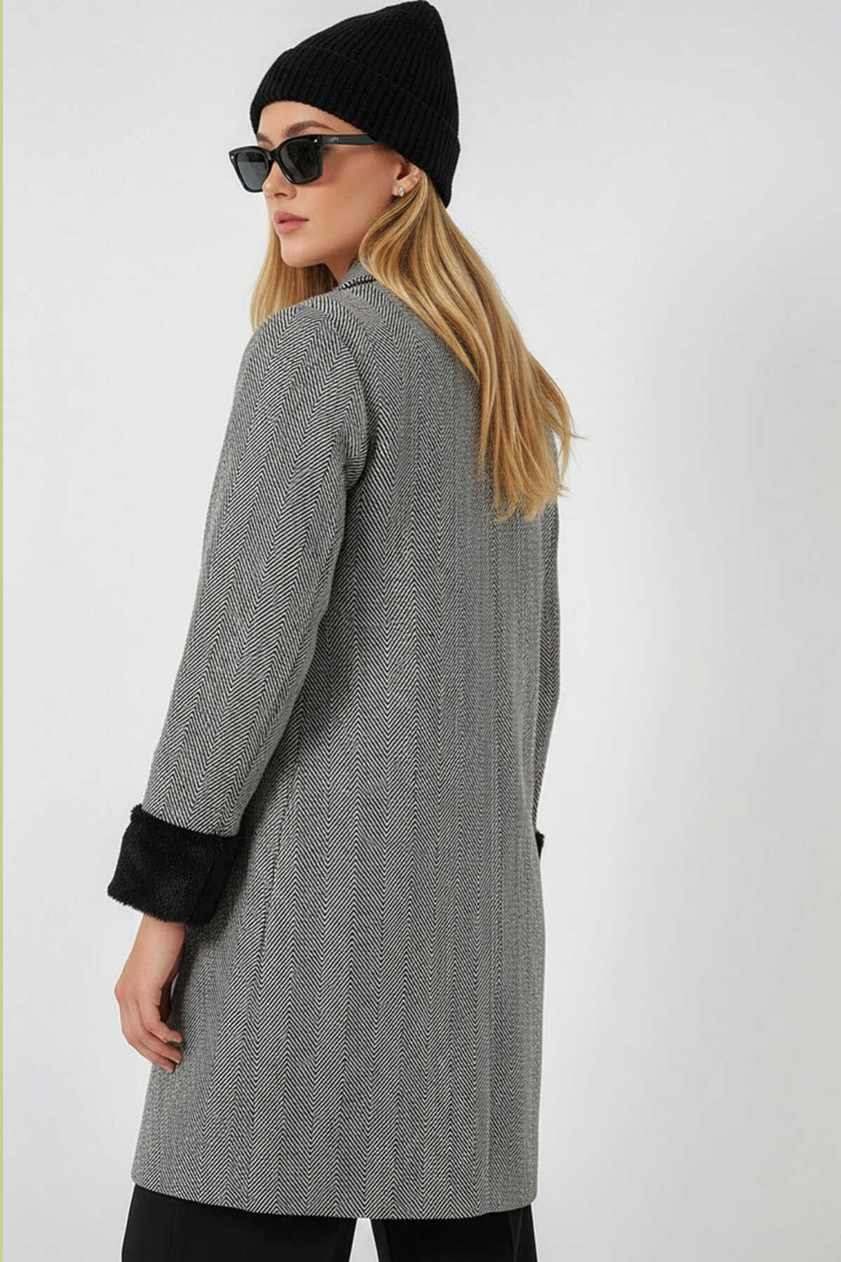 9145 Kadın Kolları Tüylü Balık Sırtı Kaşe Kaban - Siyah - Kombin