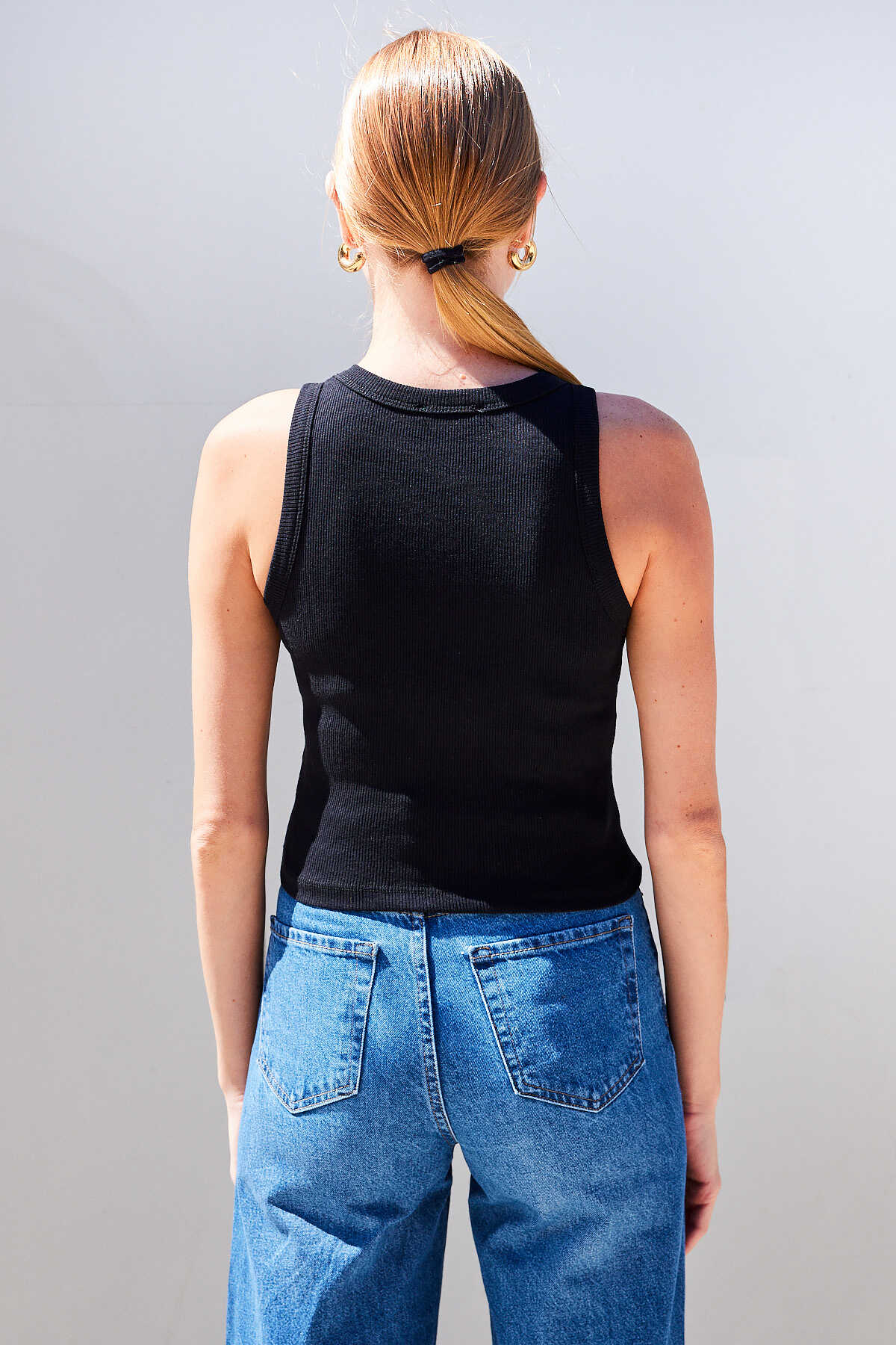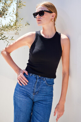 917 Bisiklet Yaka Fitilli Kolsuz Bluz - Siyah - Kombin