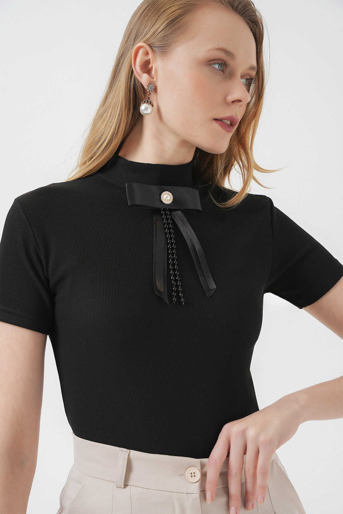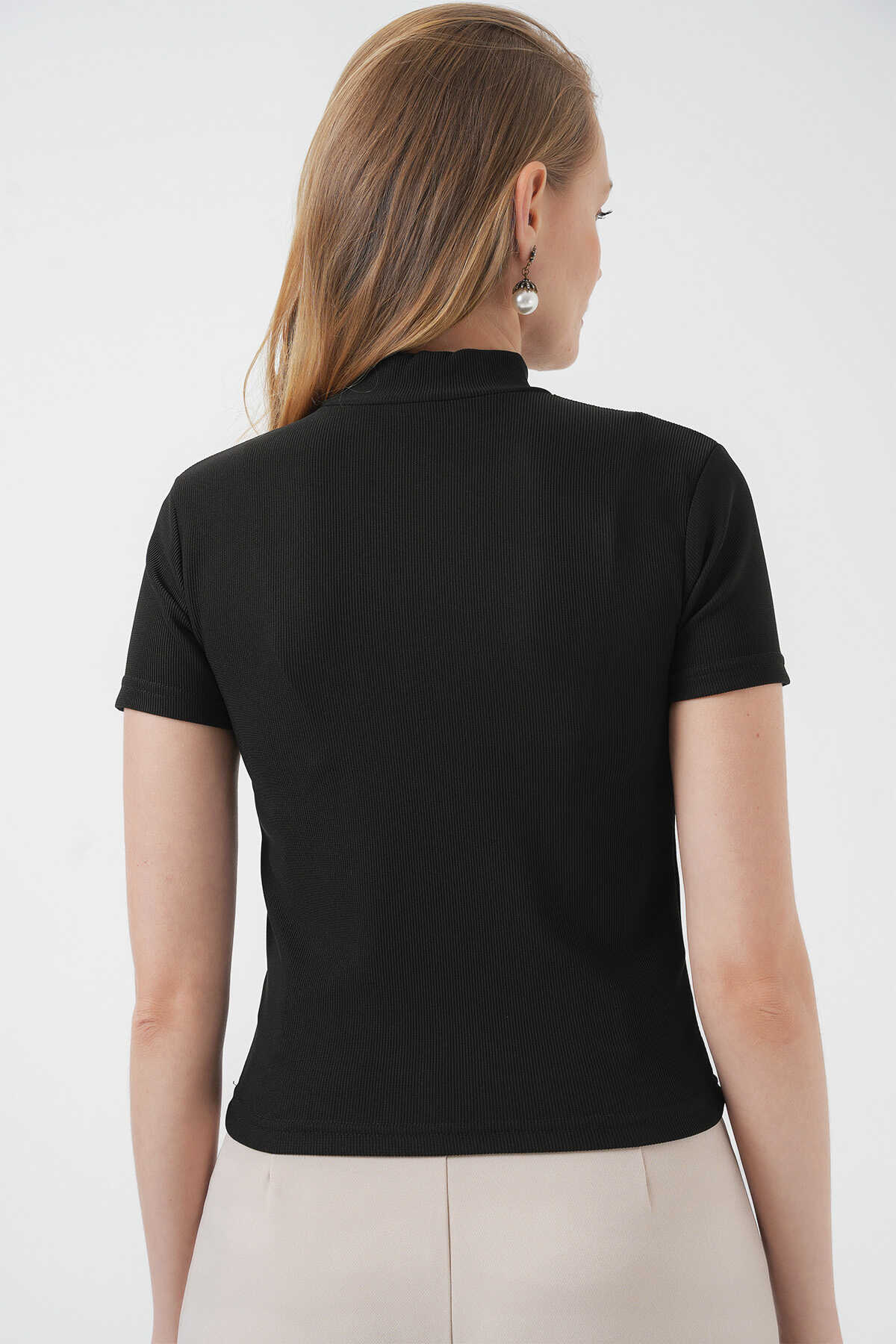 926 Yaka Detaylı Kısa Kol Bluz - Siyah