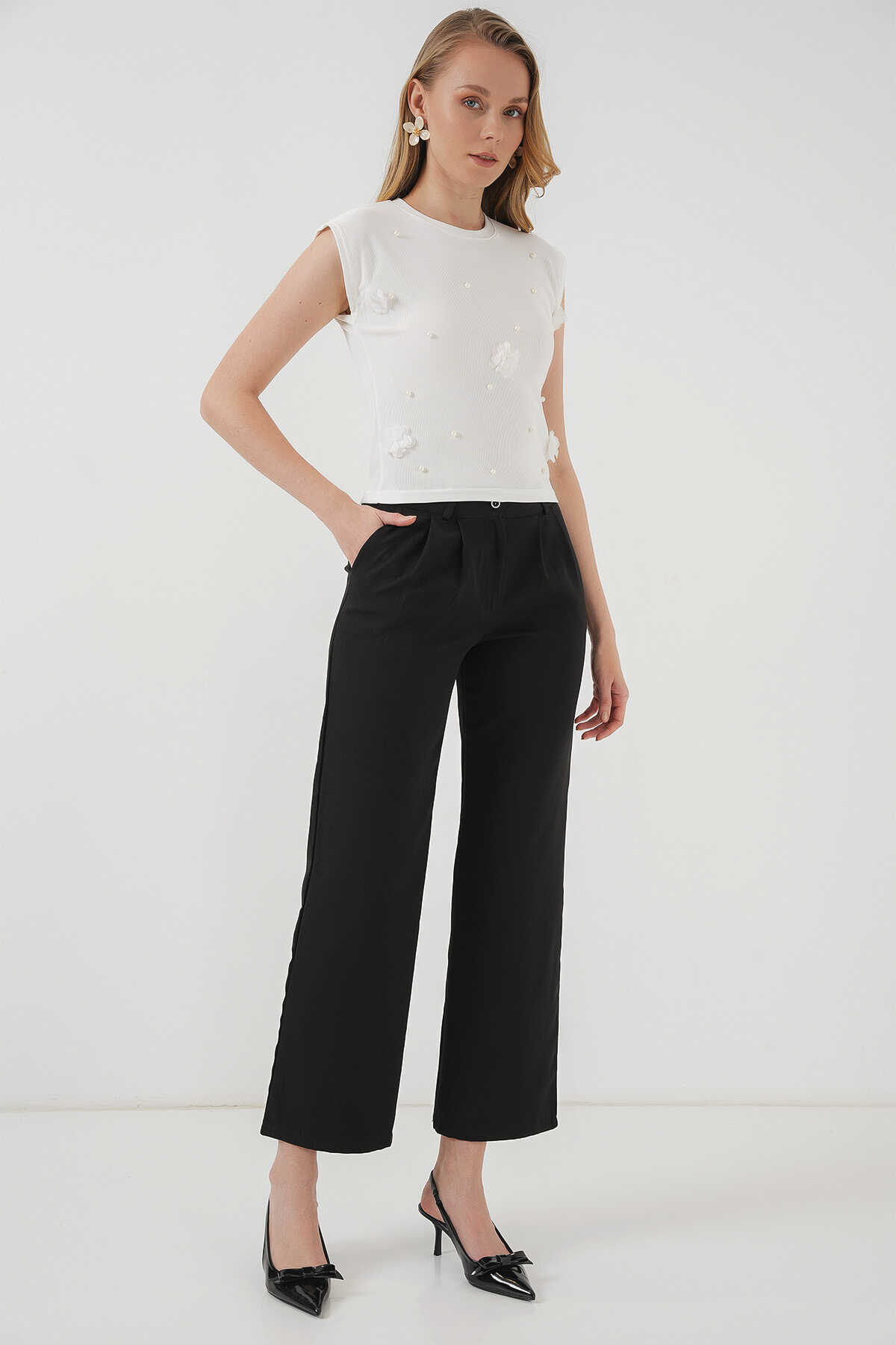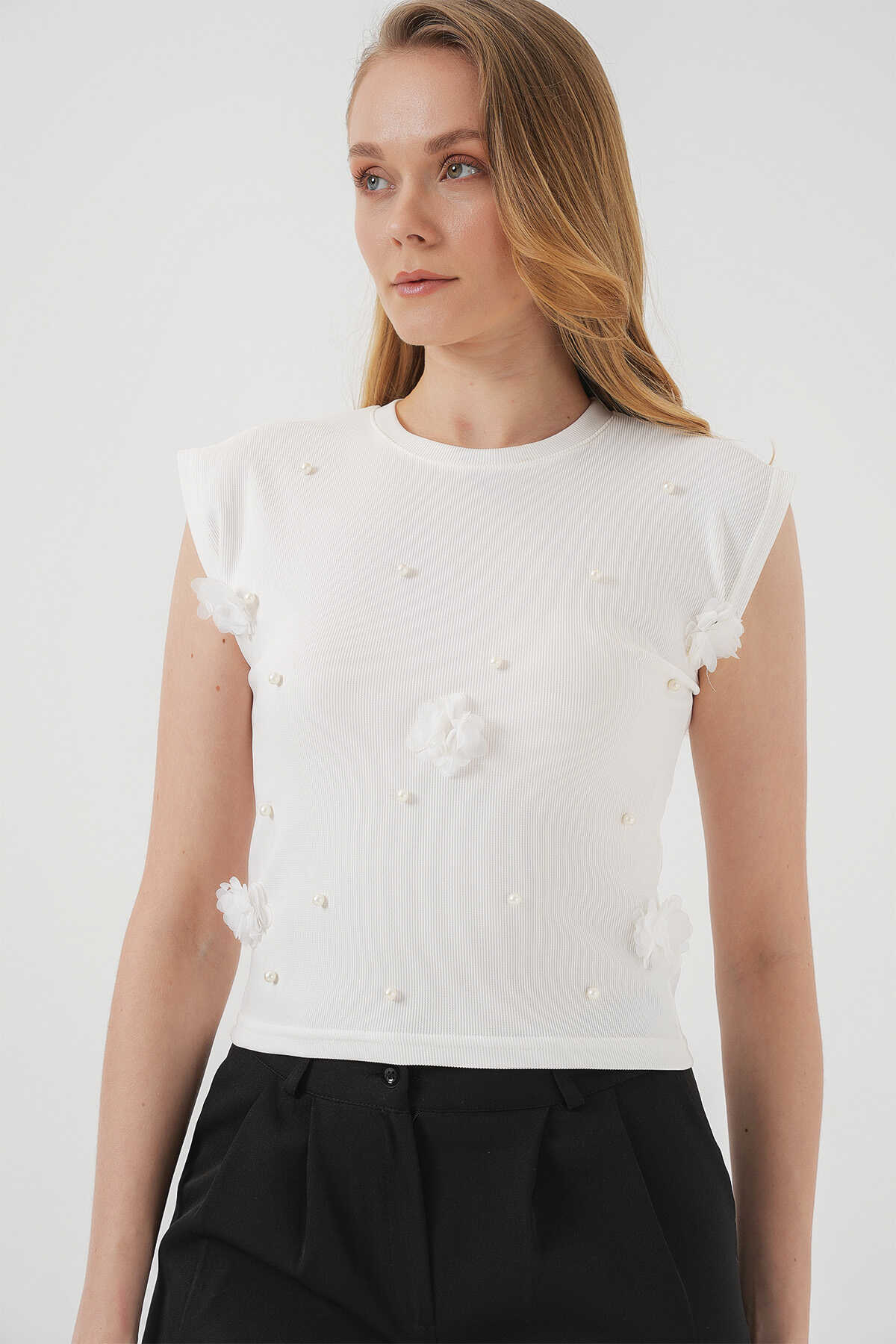 929 Kısa Kol Örme Bluz - Beyaz - Kombin