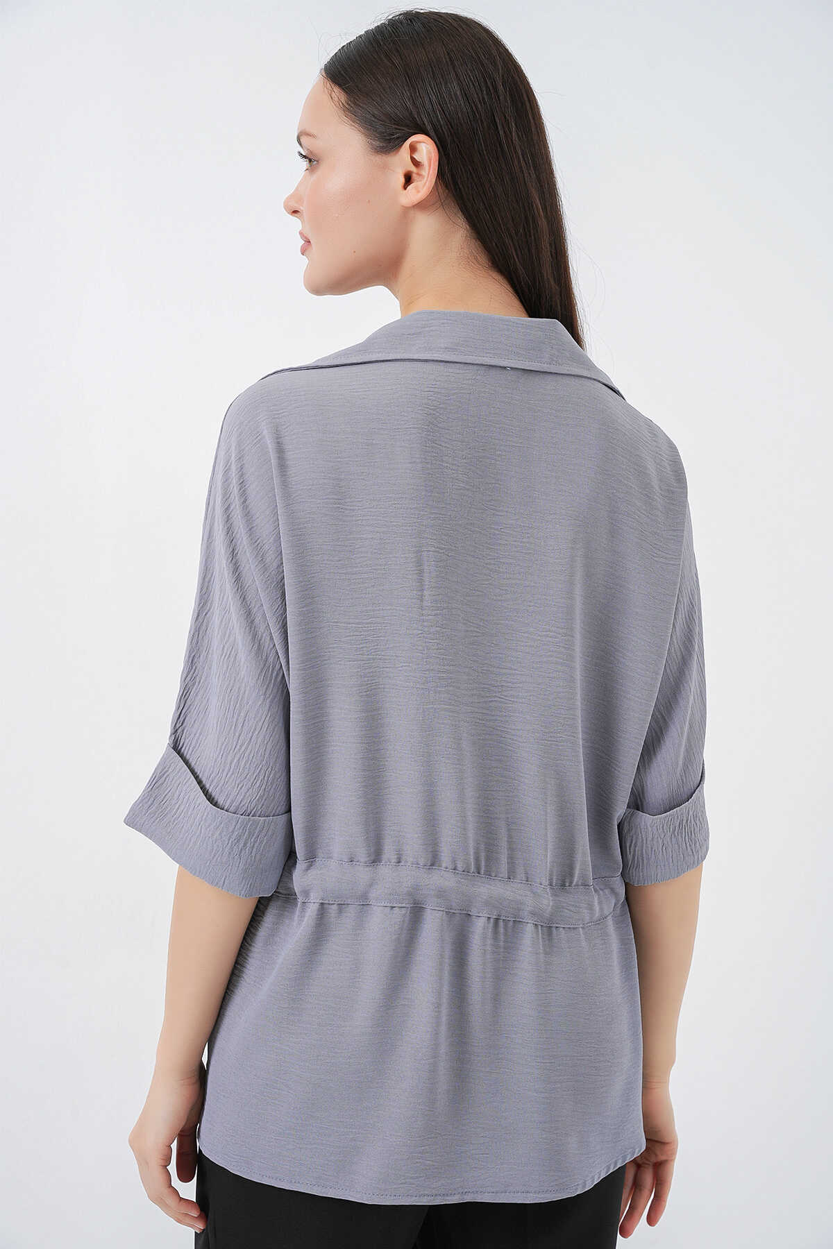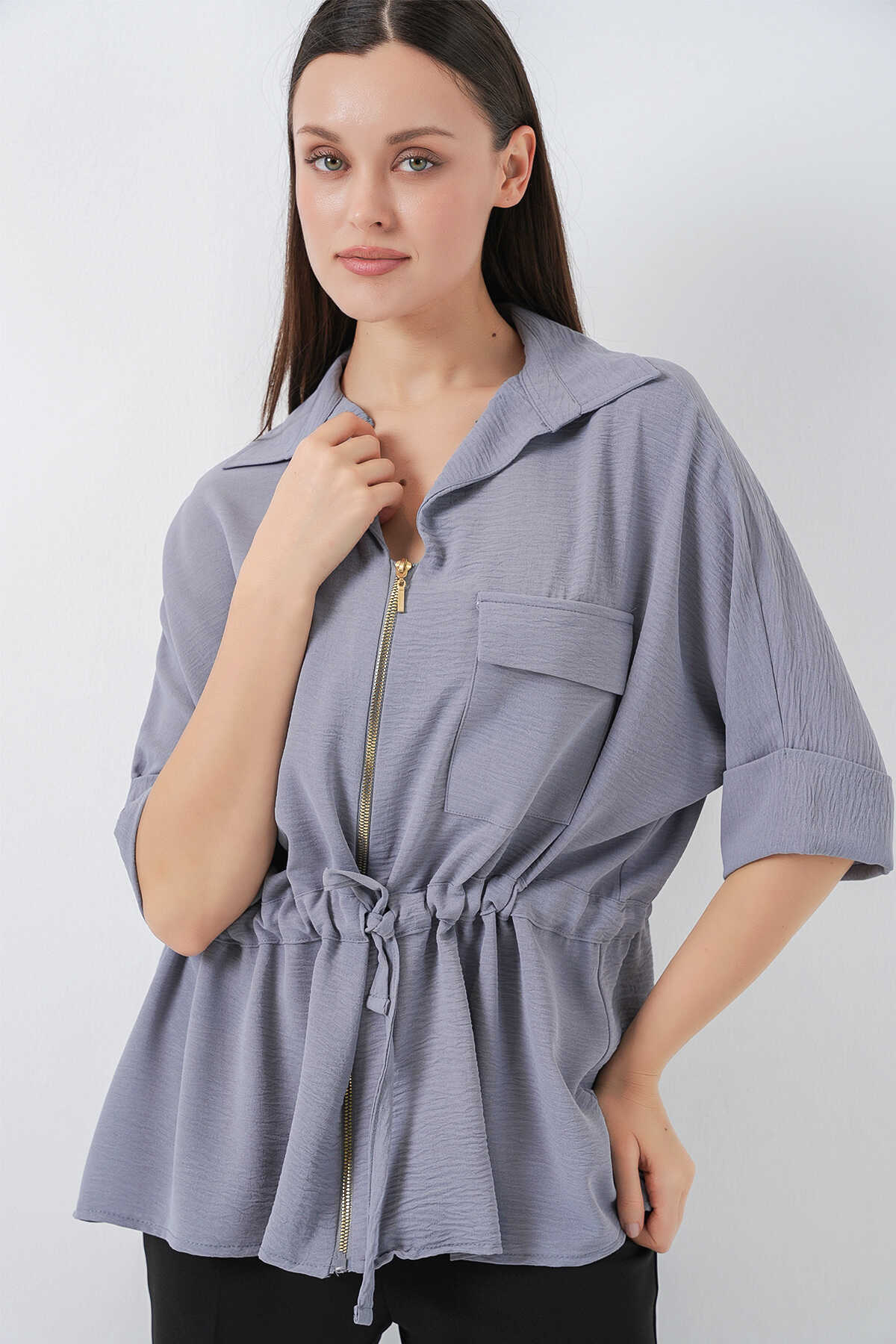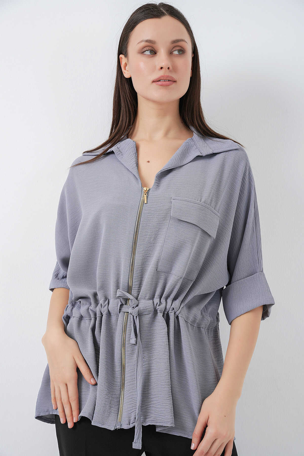 Fermuarlı Kadın Gömlek 0721 - Gri - Kombin