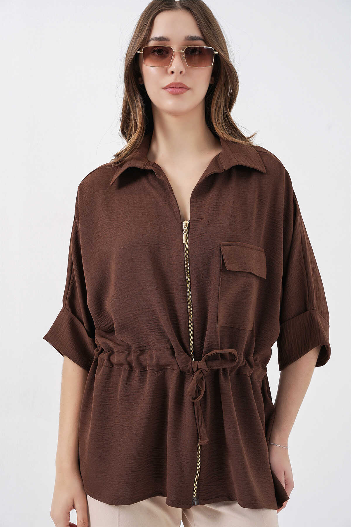 Fermuarlı Kadın Gömlek 0721 - Kahverengi - Kombin