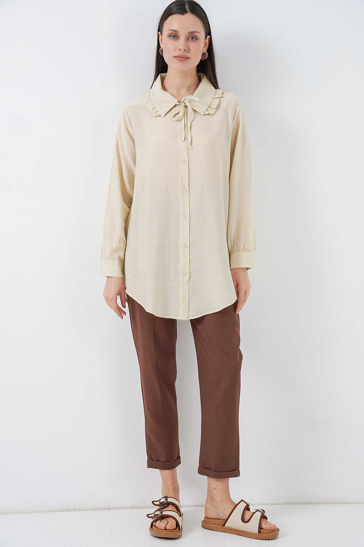 Fırfırlı Uzun Gömlek Tunik 5952 - Ekru - Kombin