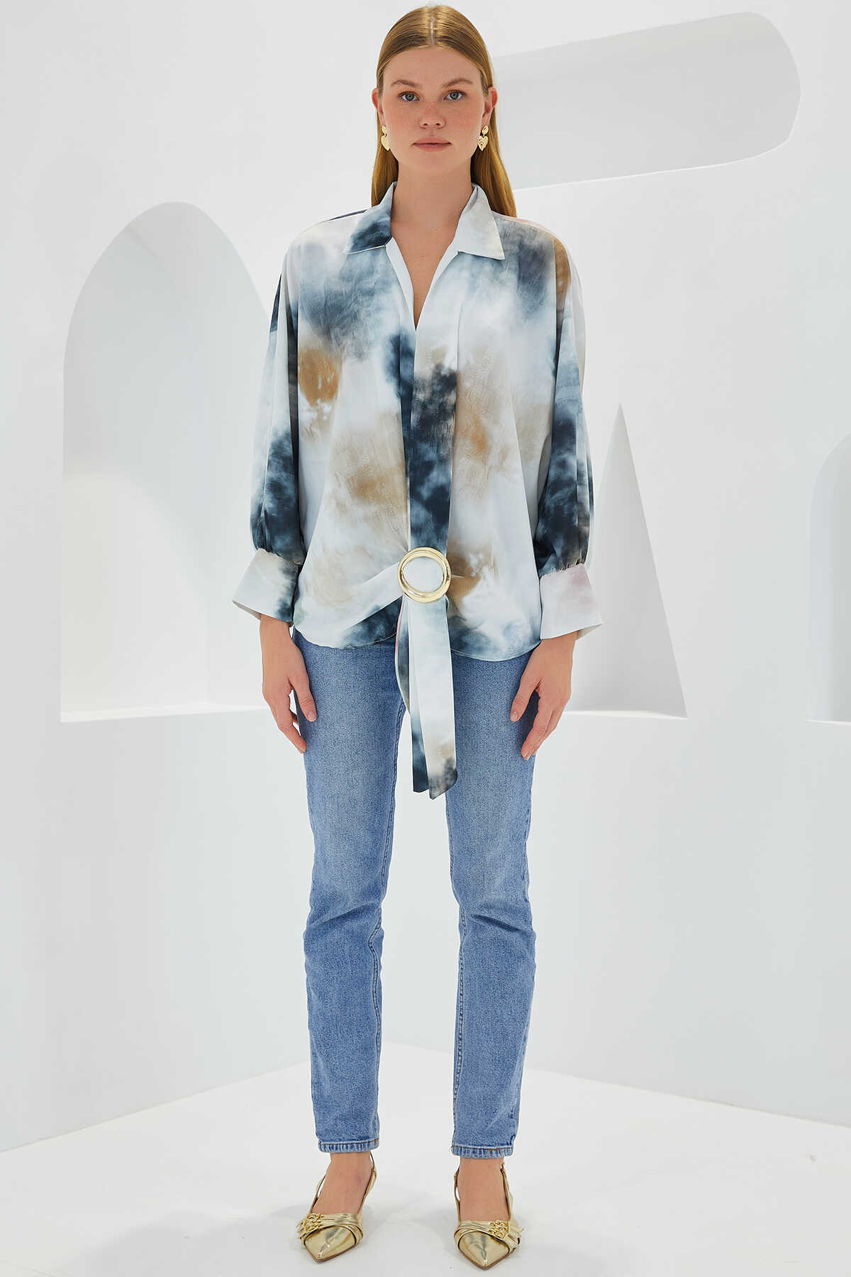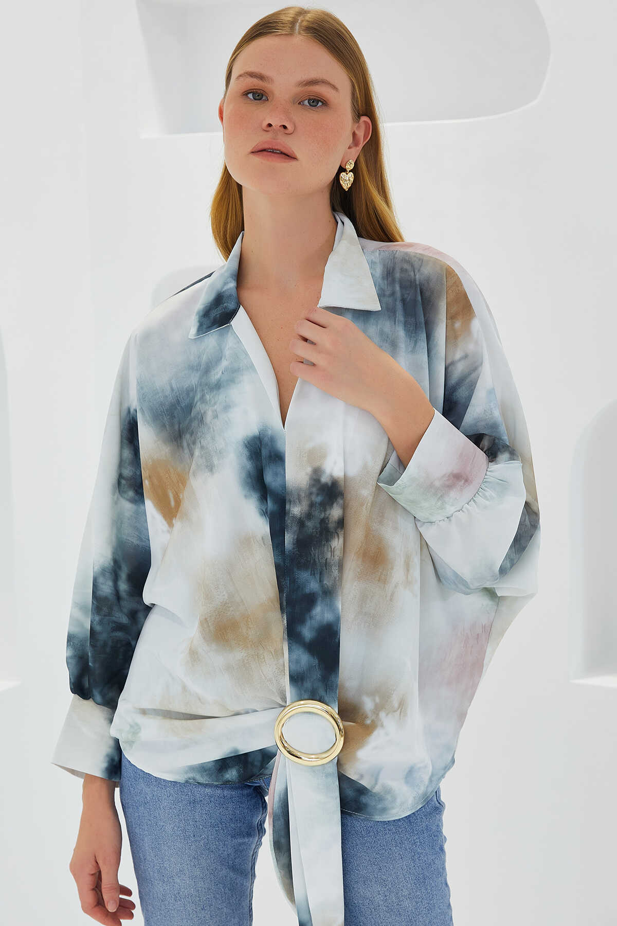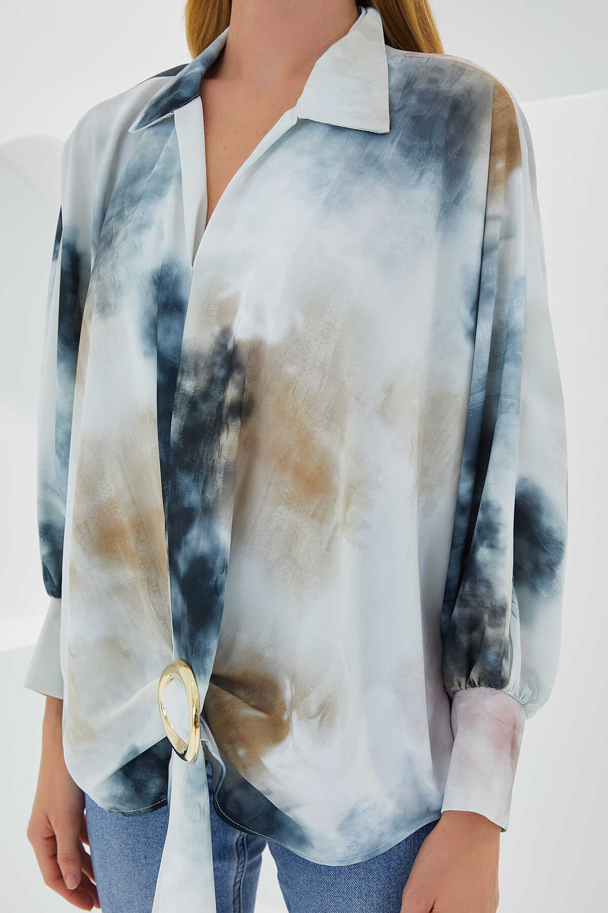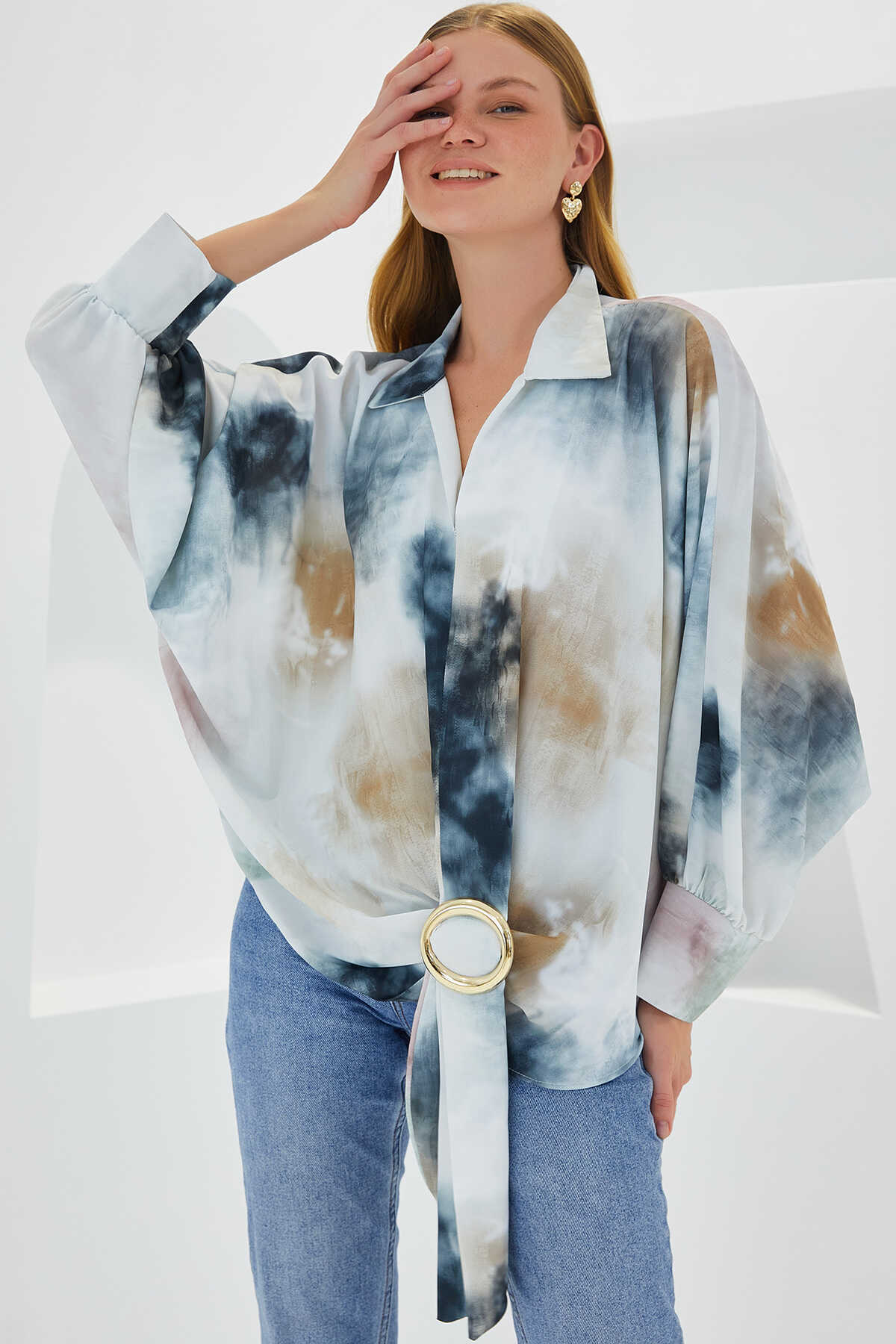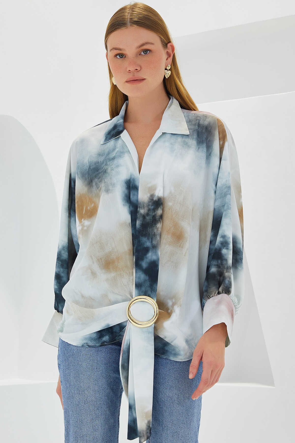 Kadın Antrasit Ekru Oversize Dökümlü Saten Gömlek 907
