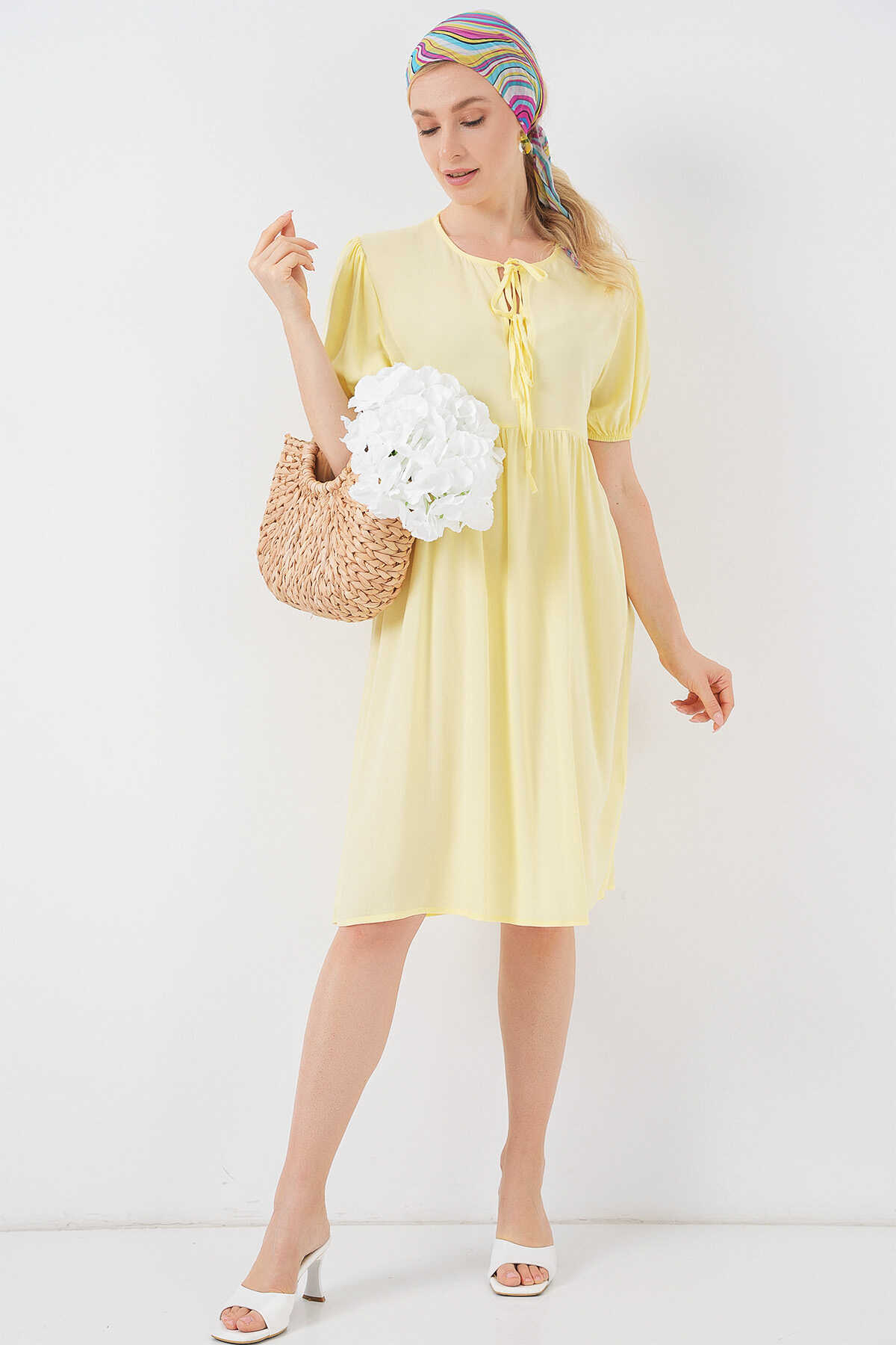 Kadın Bağcıklı Midi Elbise 2575 - Sarı - Kombin