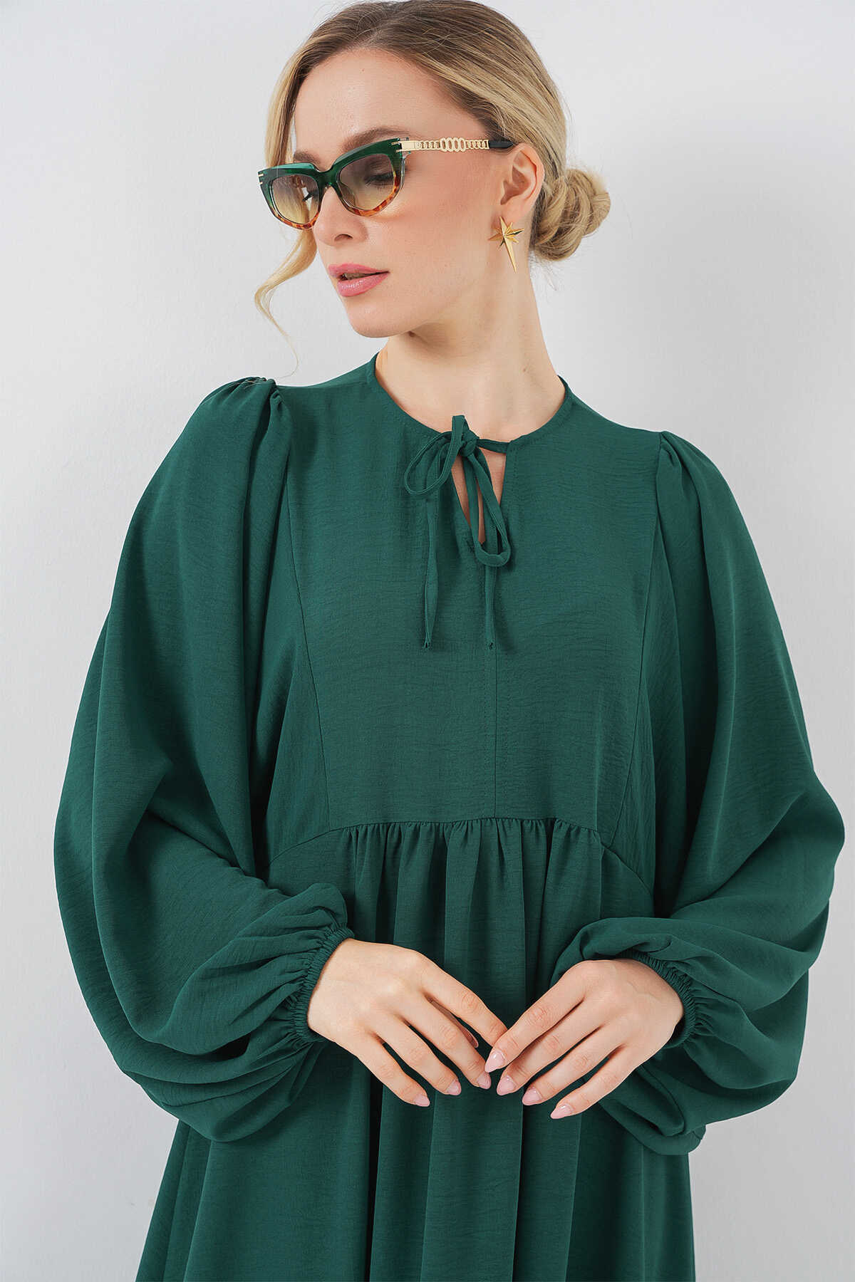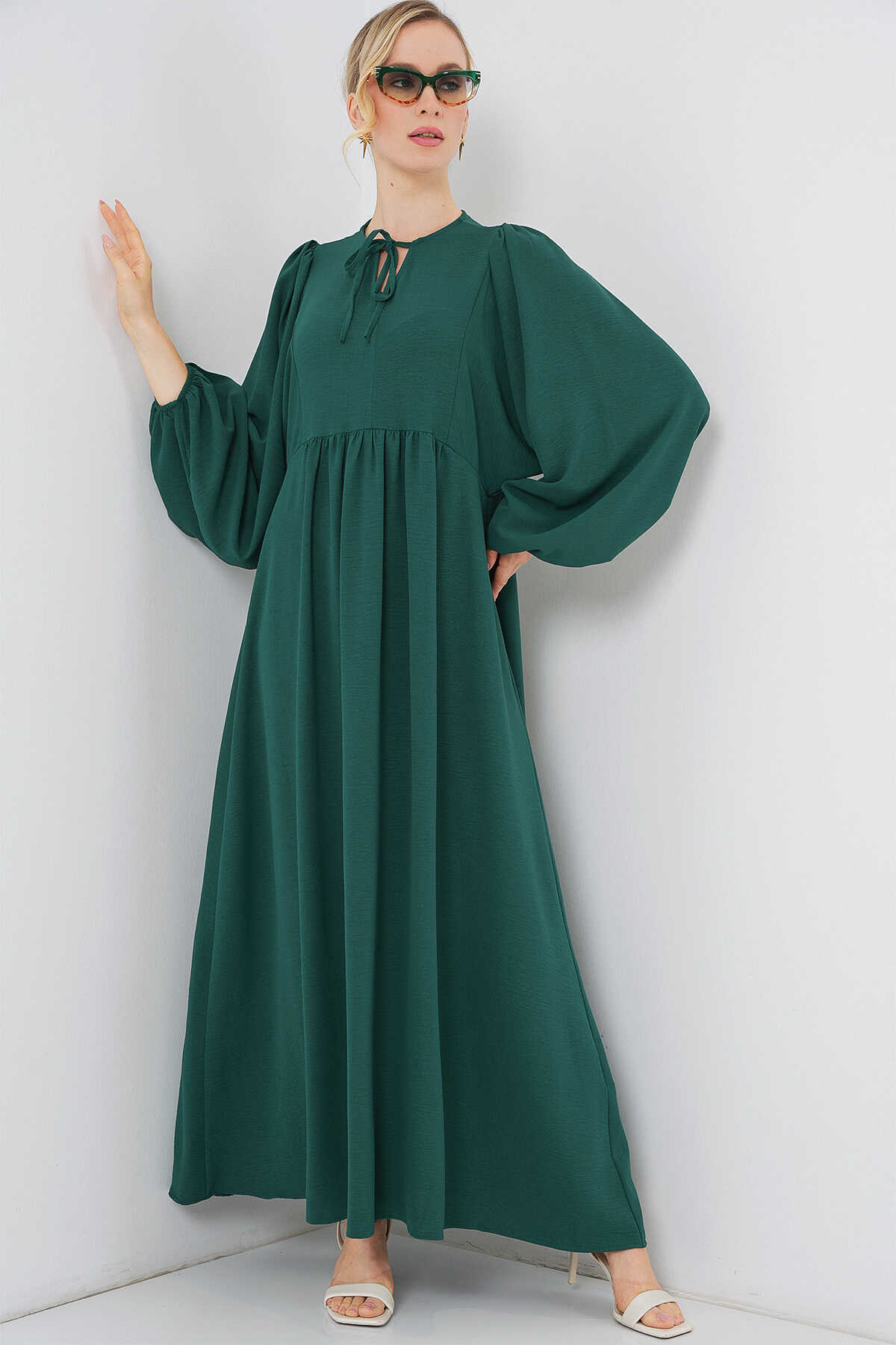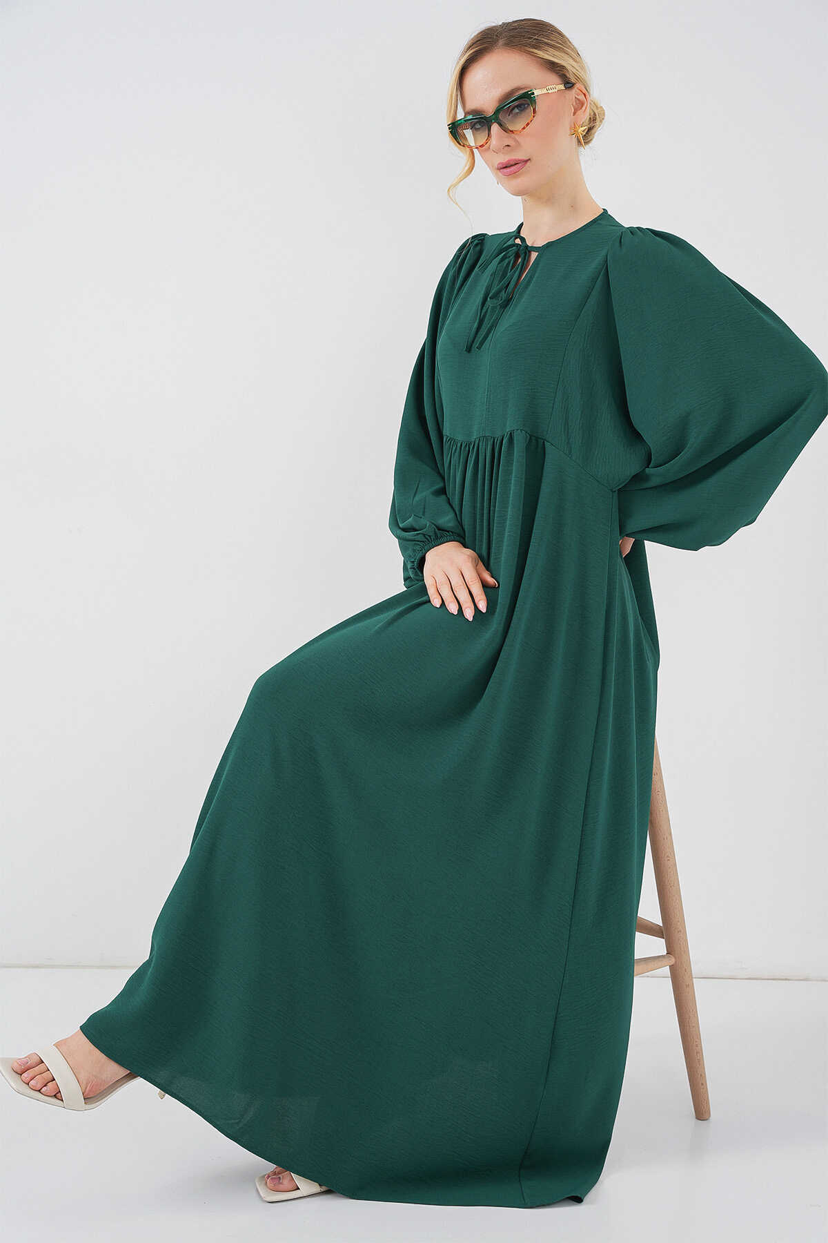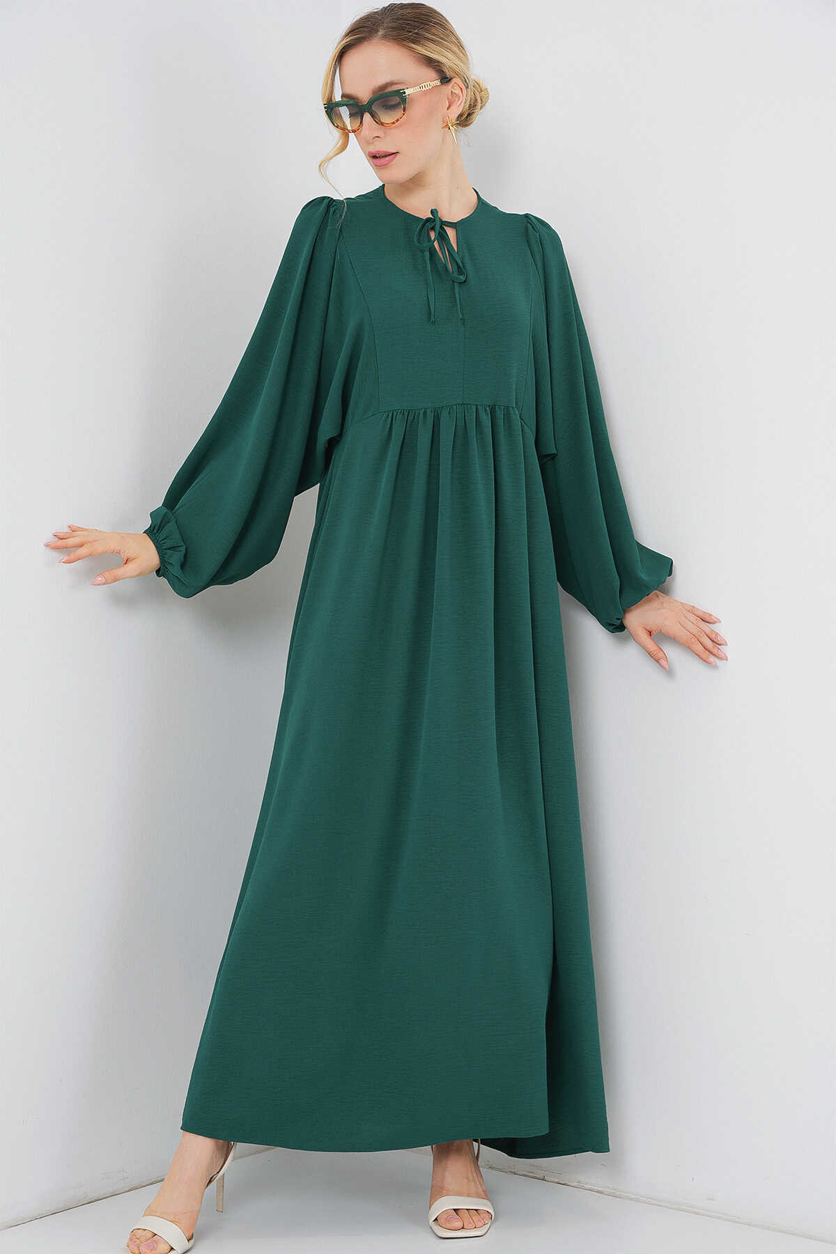 Kadın Balon Kol Uzun Tesettür Elbise 2464 - Zümrüt Yeşili