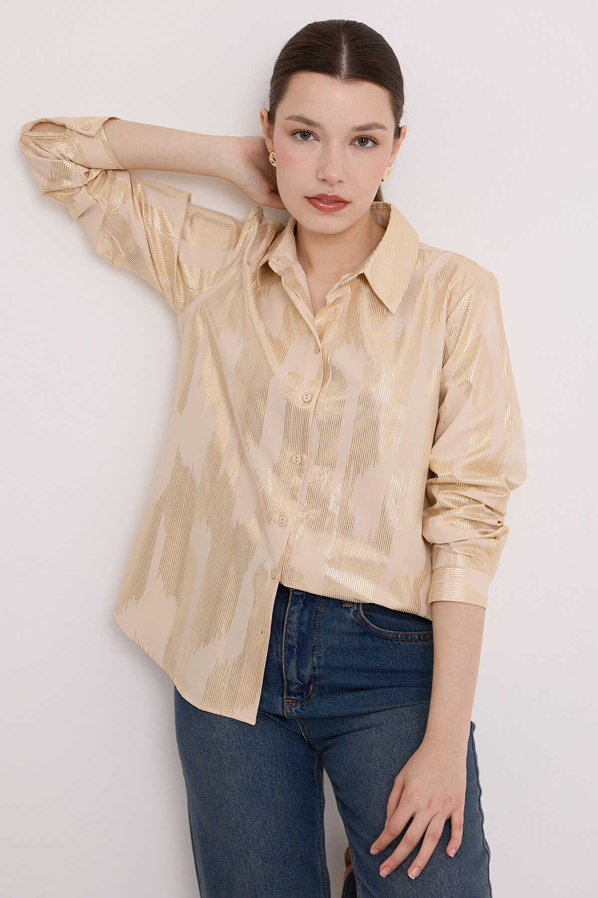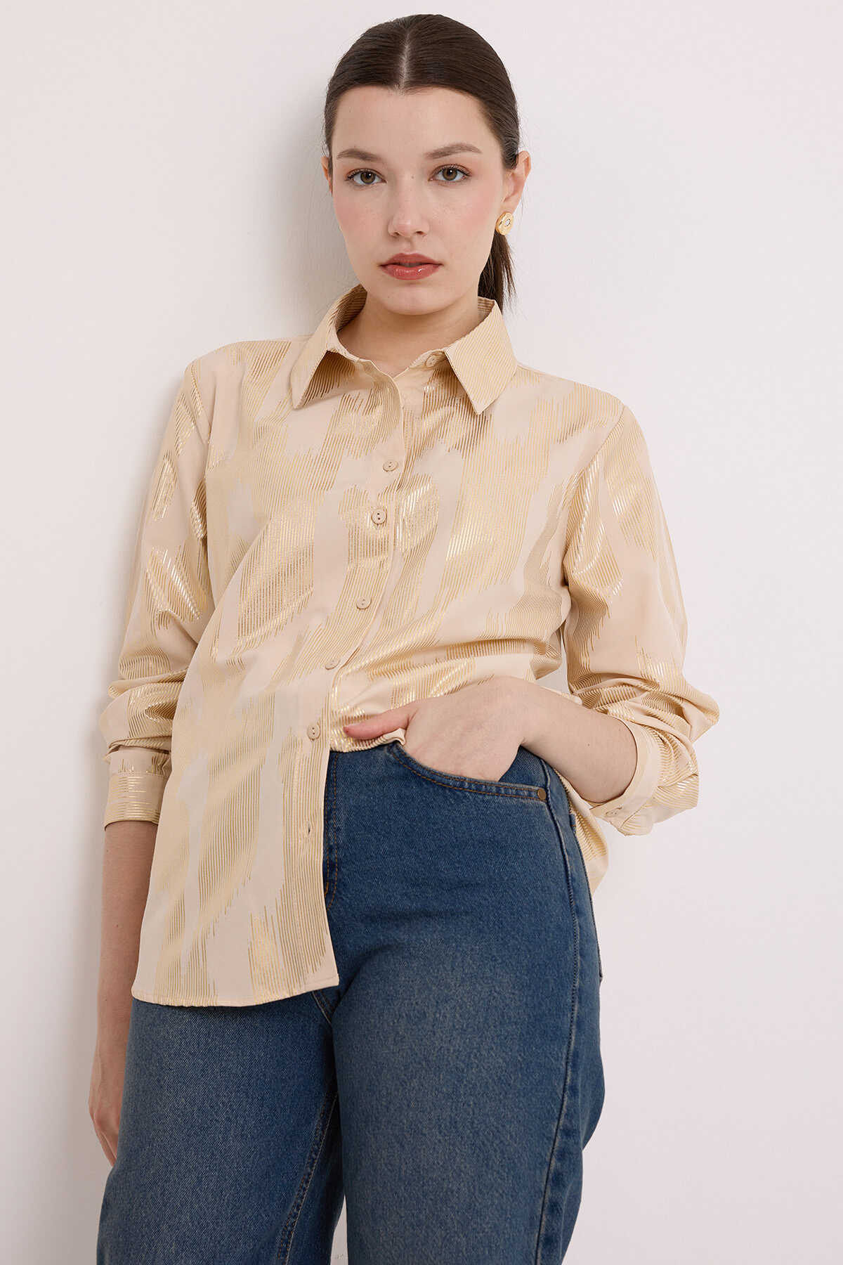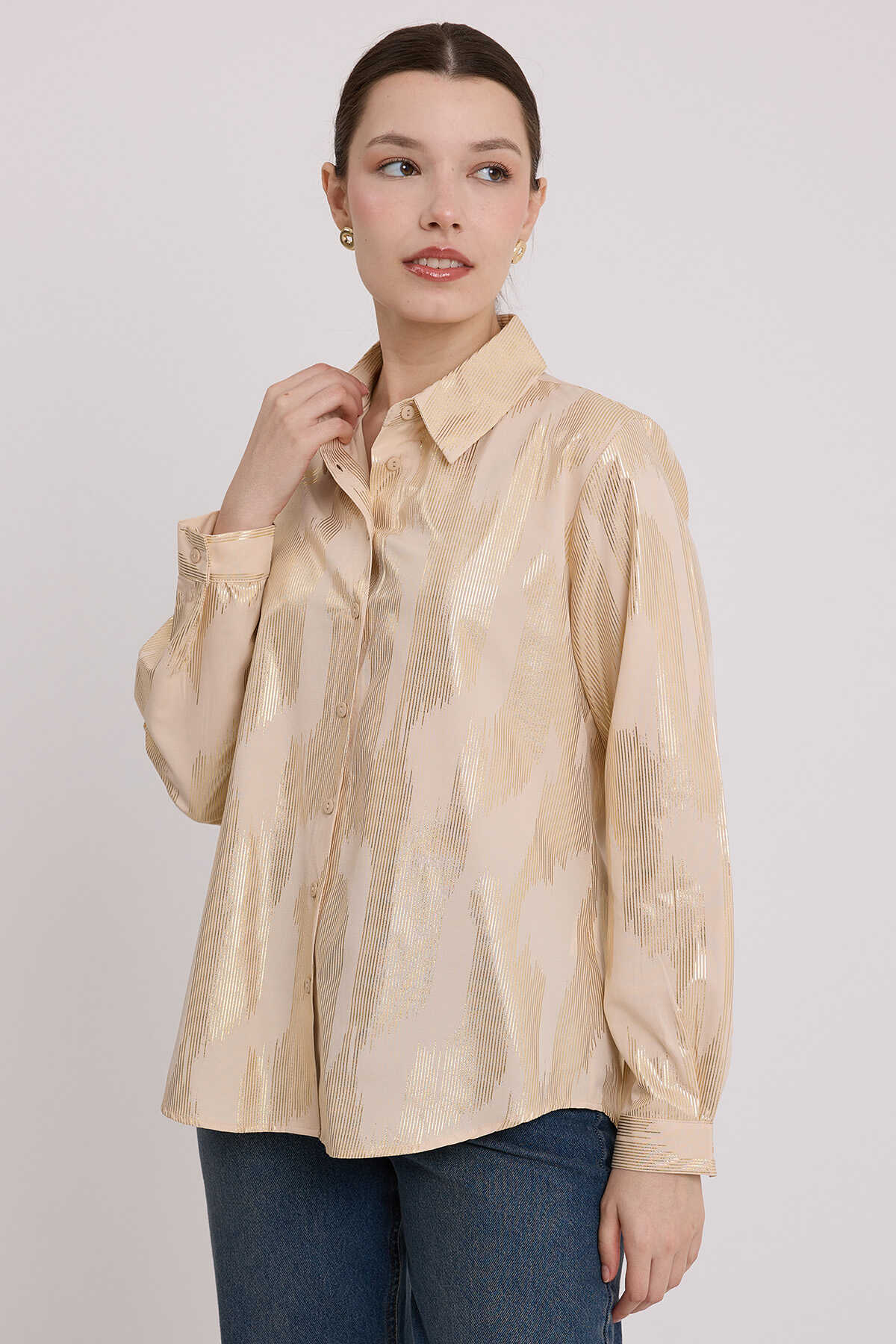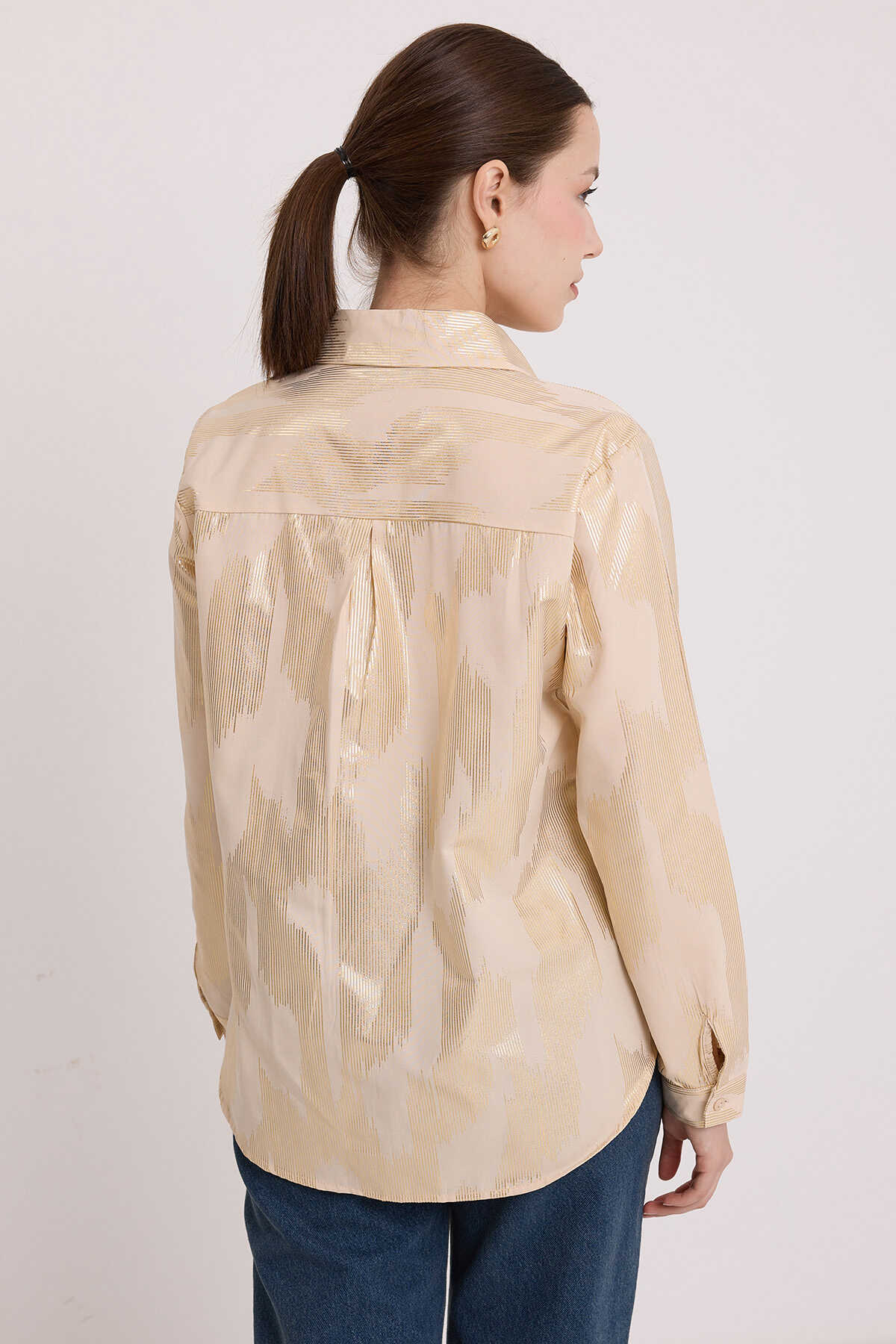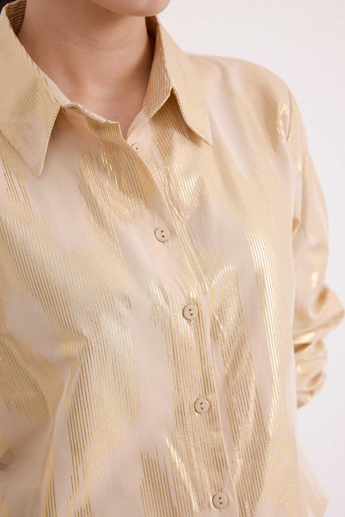 Kadın Bej Gold Varak Desenli Gömlek 20253