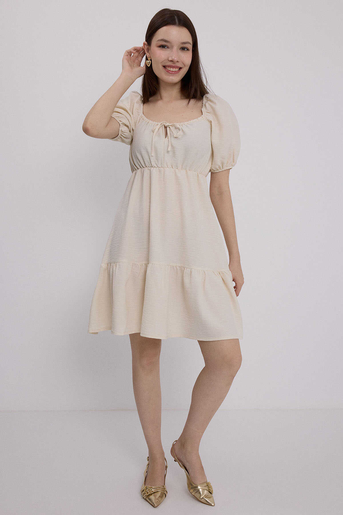 Kadın Bej Kloş Keten Elbise 2351 - Kombin