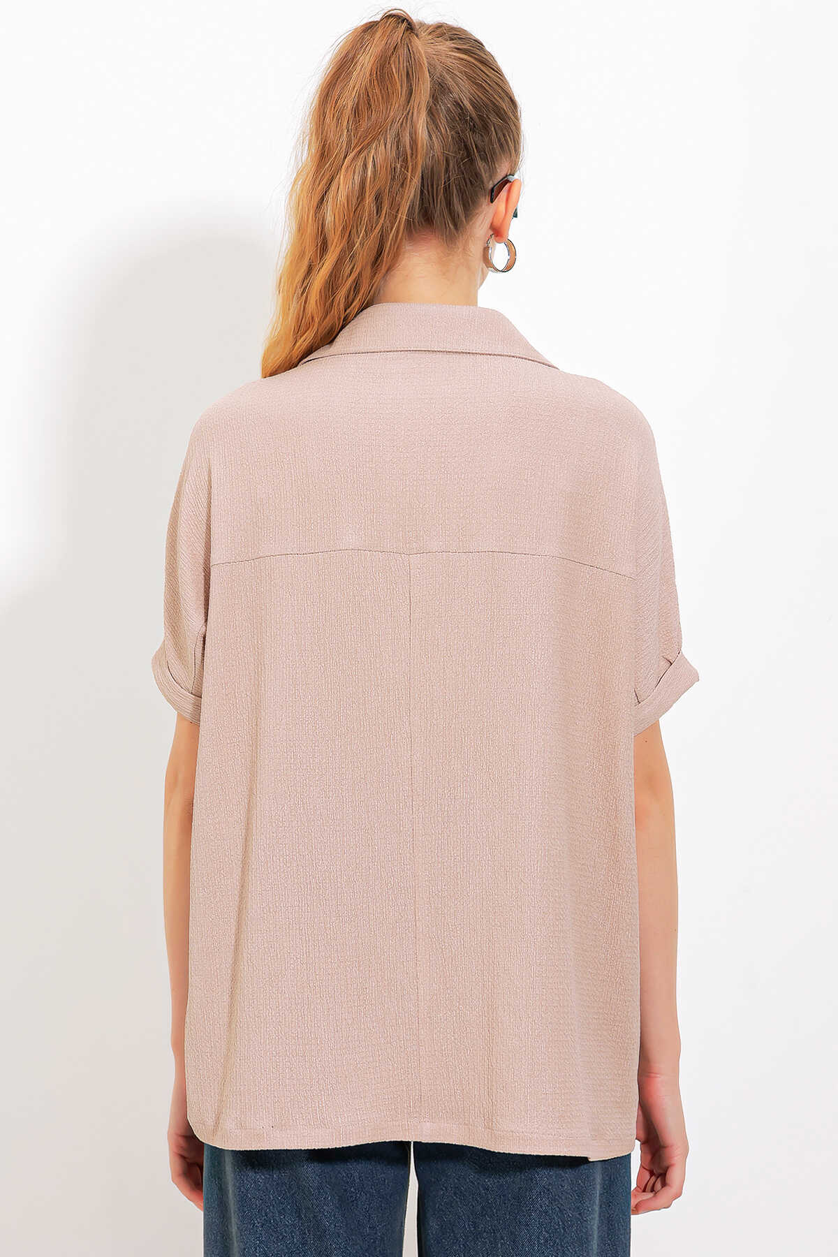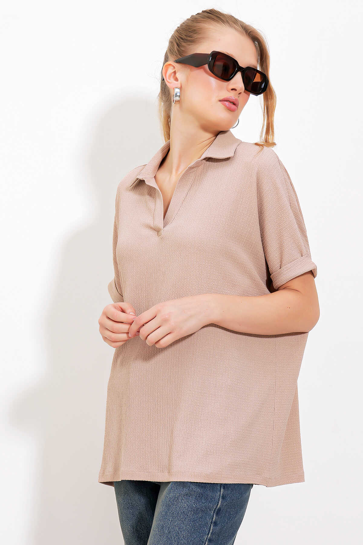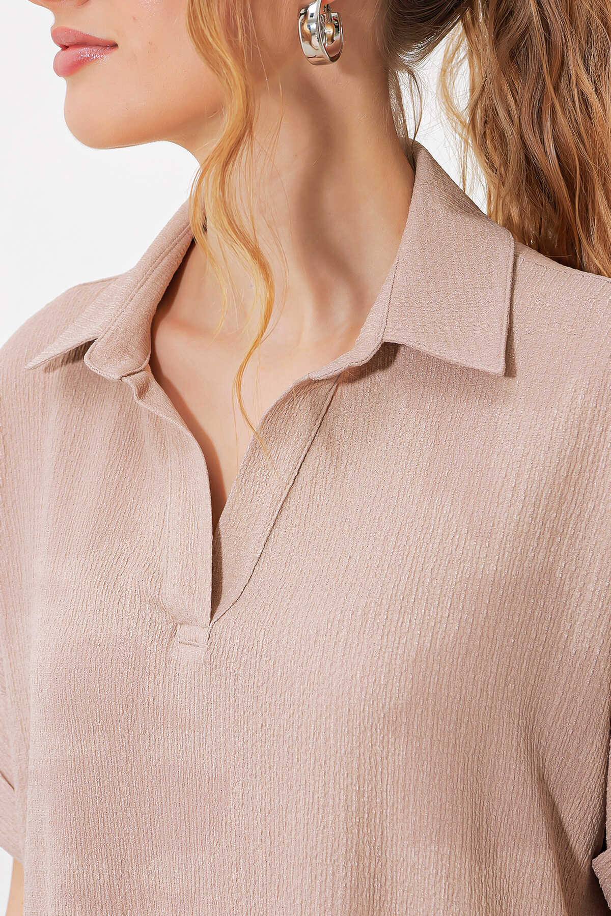 Kadın Bisküvi Oversize Polo Yaka Örme Bluz 0486 - Kombin