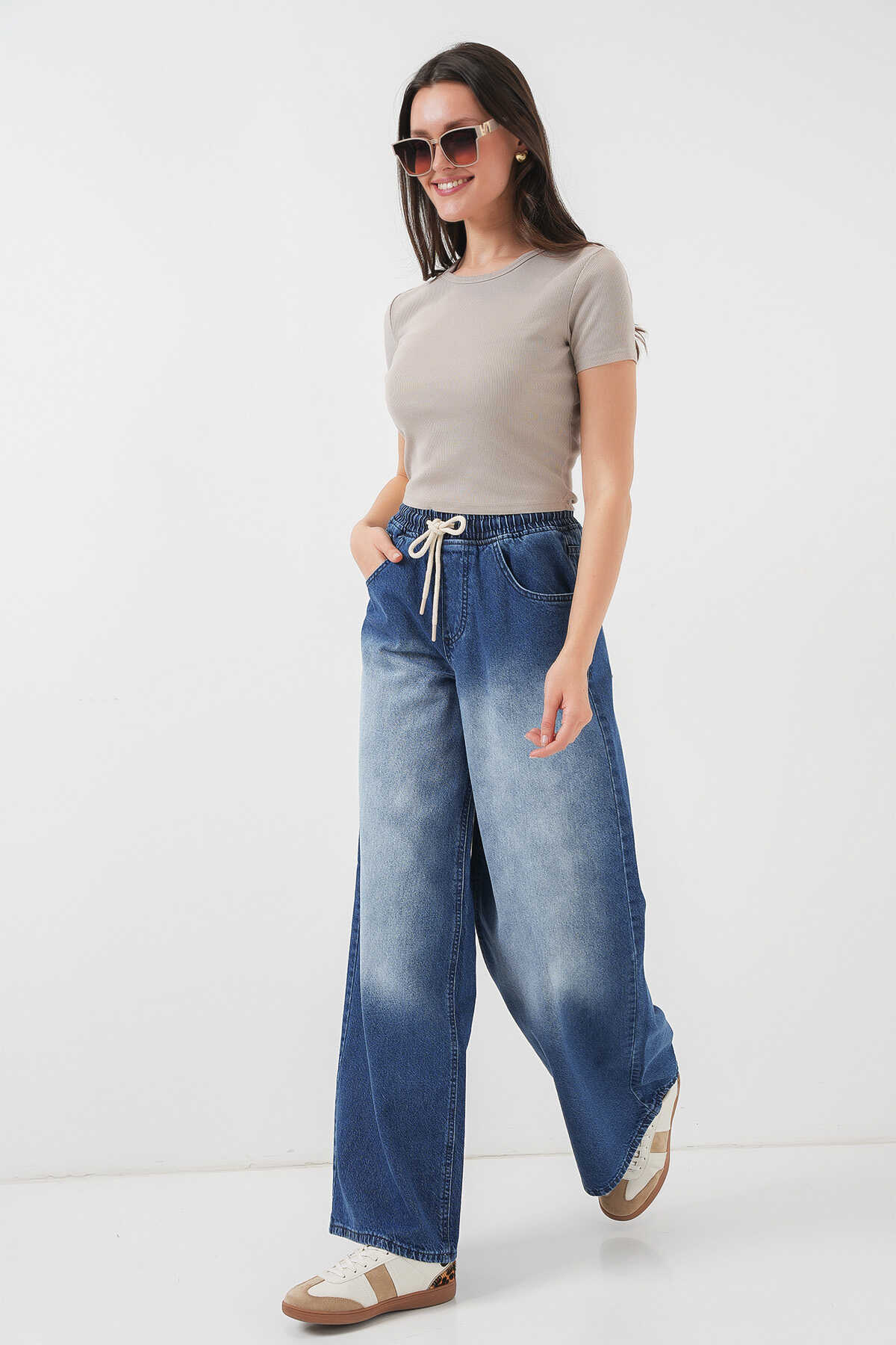 Kadın Bol Paça Kot Pantolon 6705 - Lacivert - Kombin