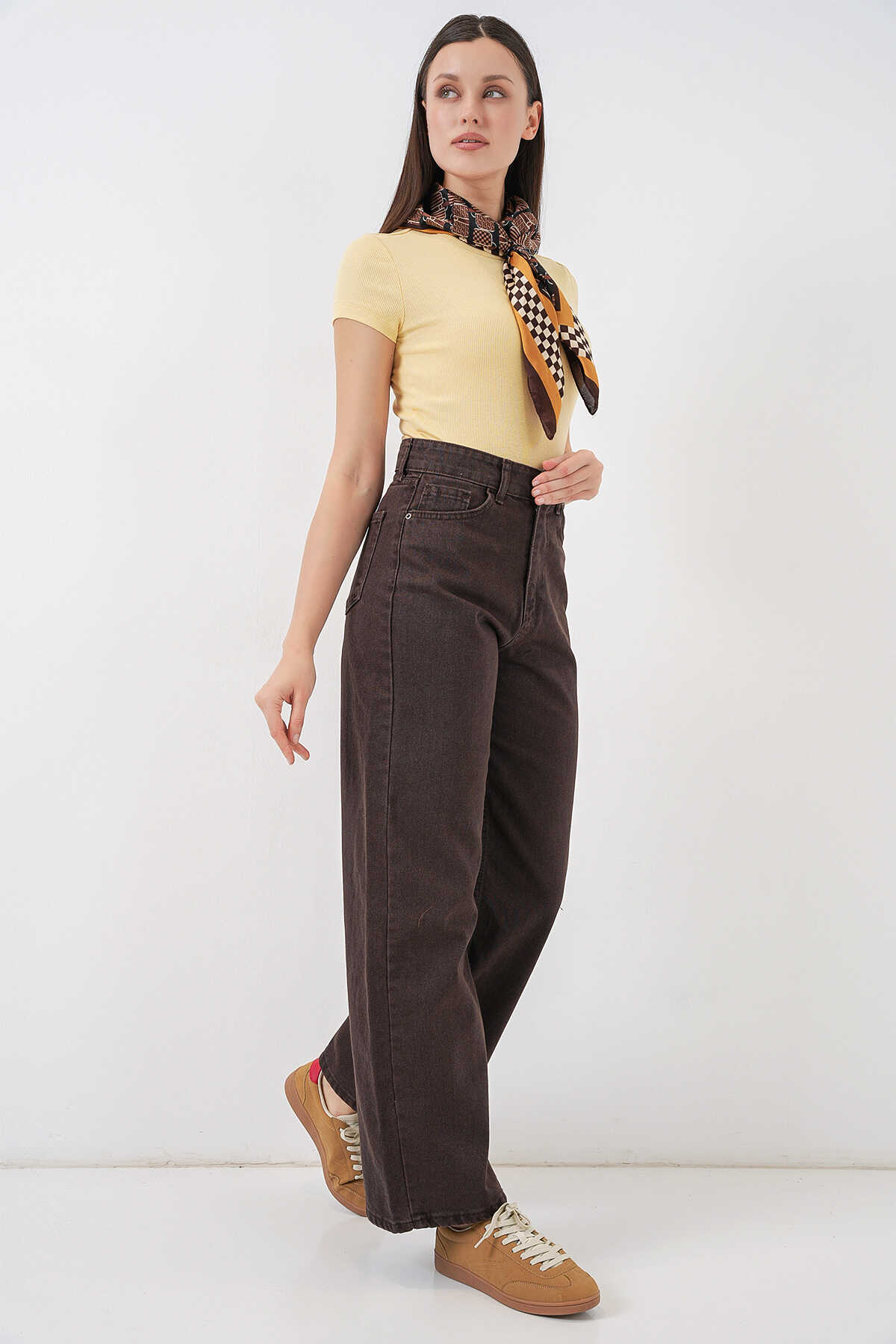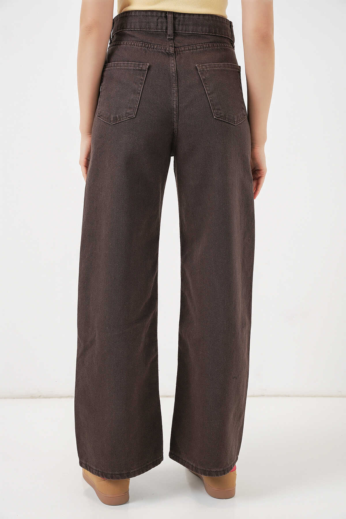 Kadın Bol Paça Yüksek Bel Palazzo Kot Pantolon 6656 - Kahverengi - Kombin