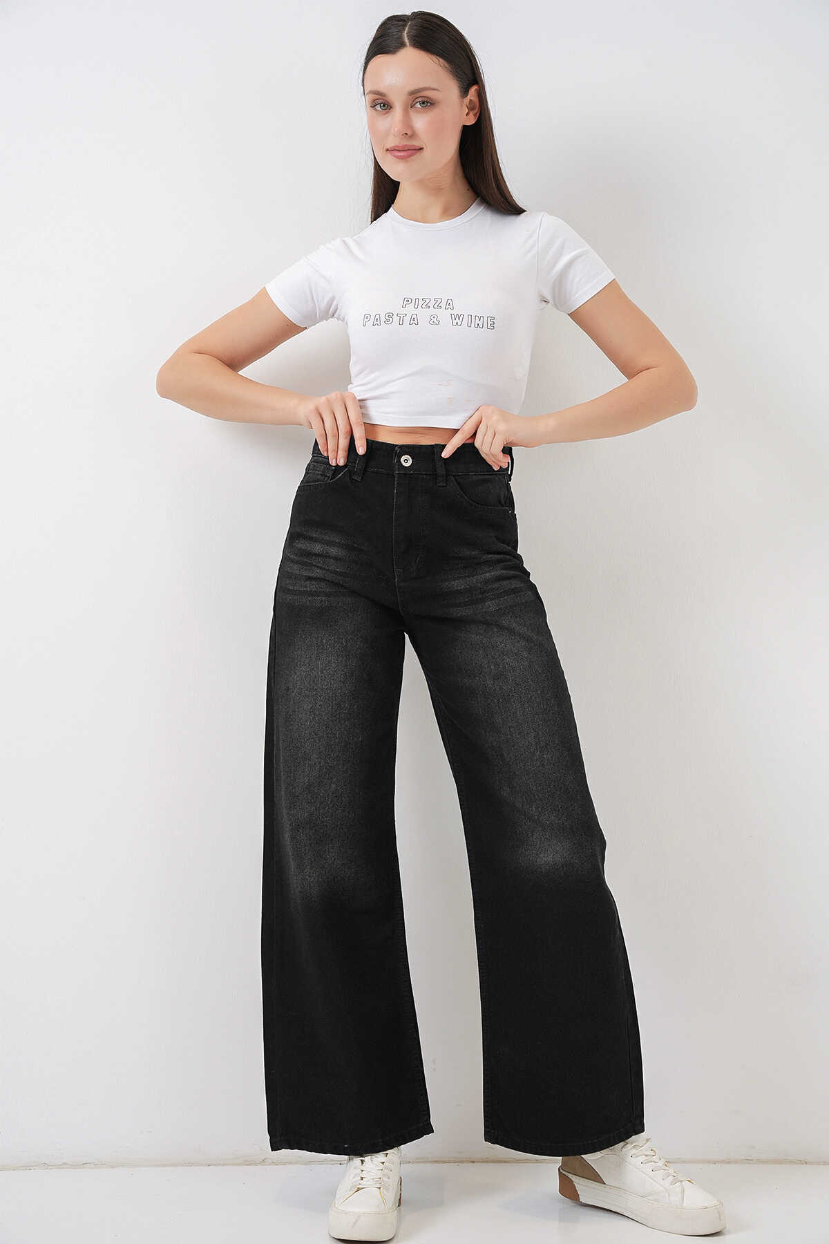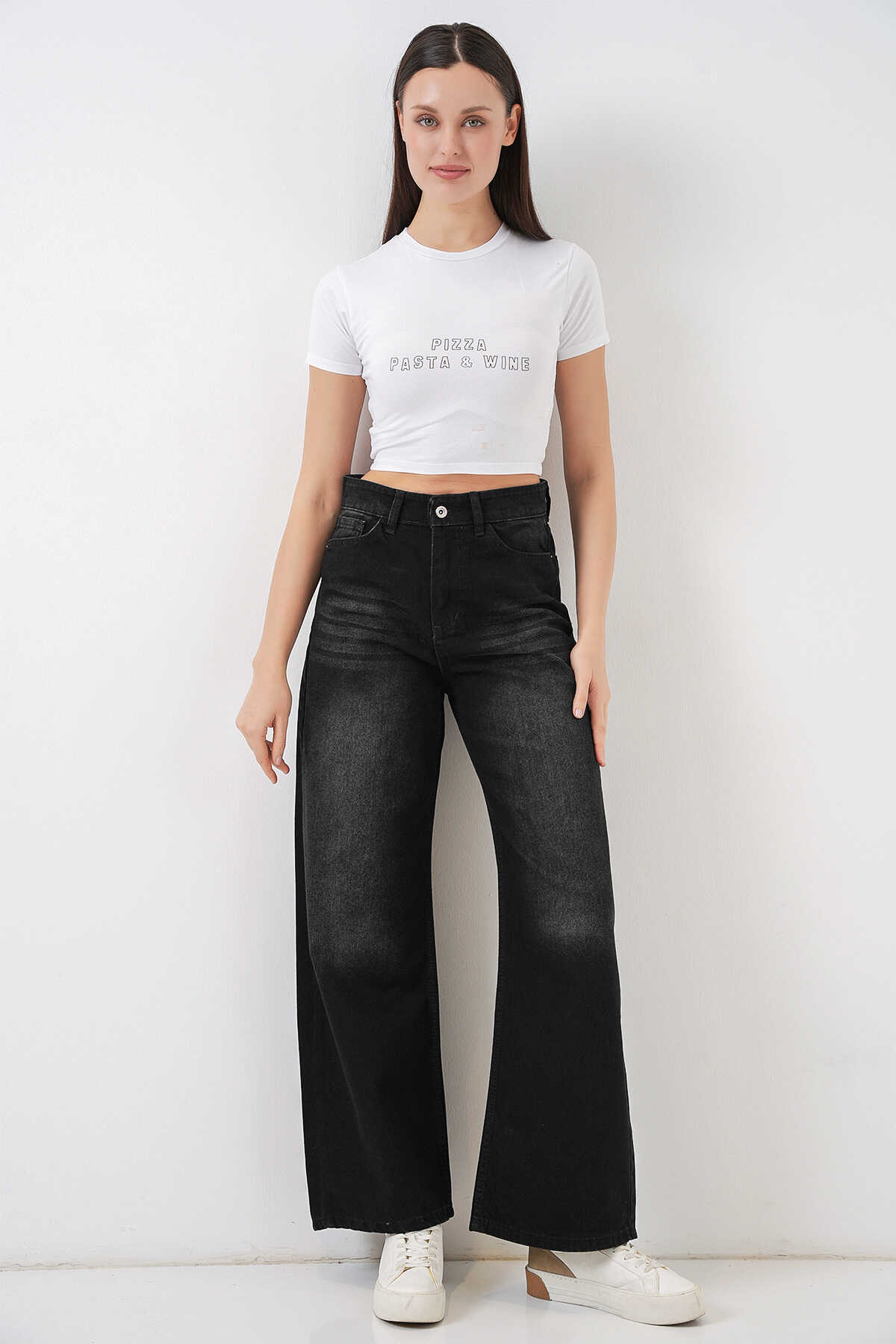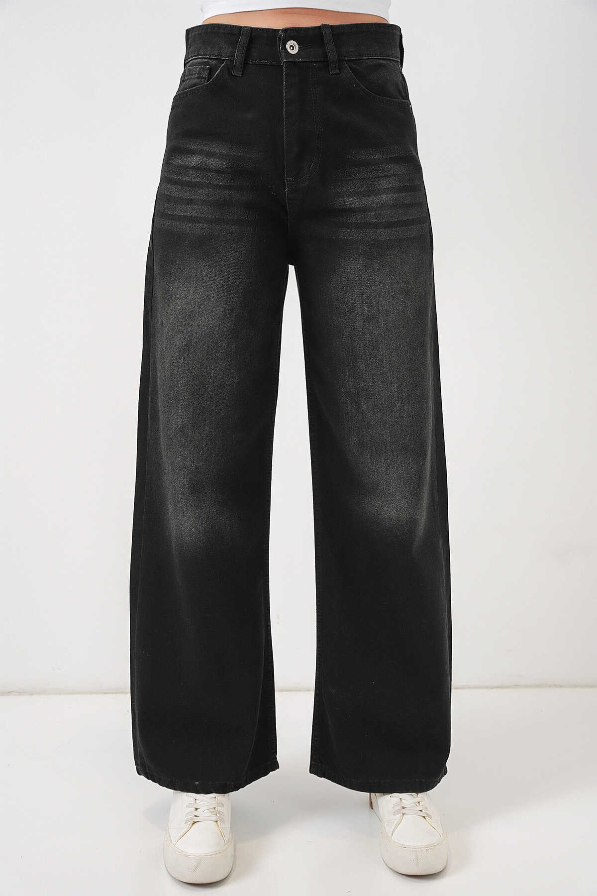 Kadın Bol Paça Yüksek Bel Palazzo Kot Pantolon 6656 - Siyah - Kombin