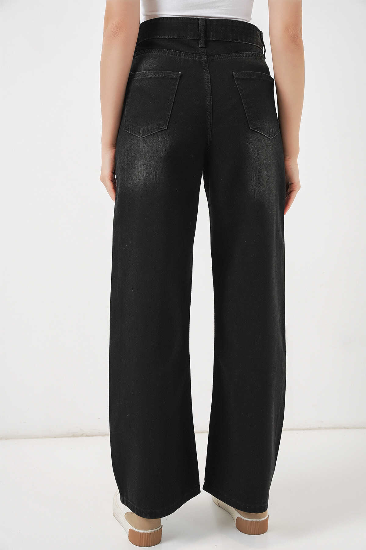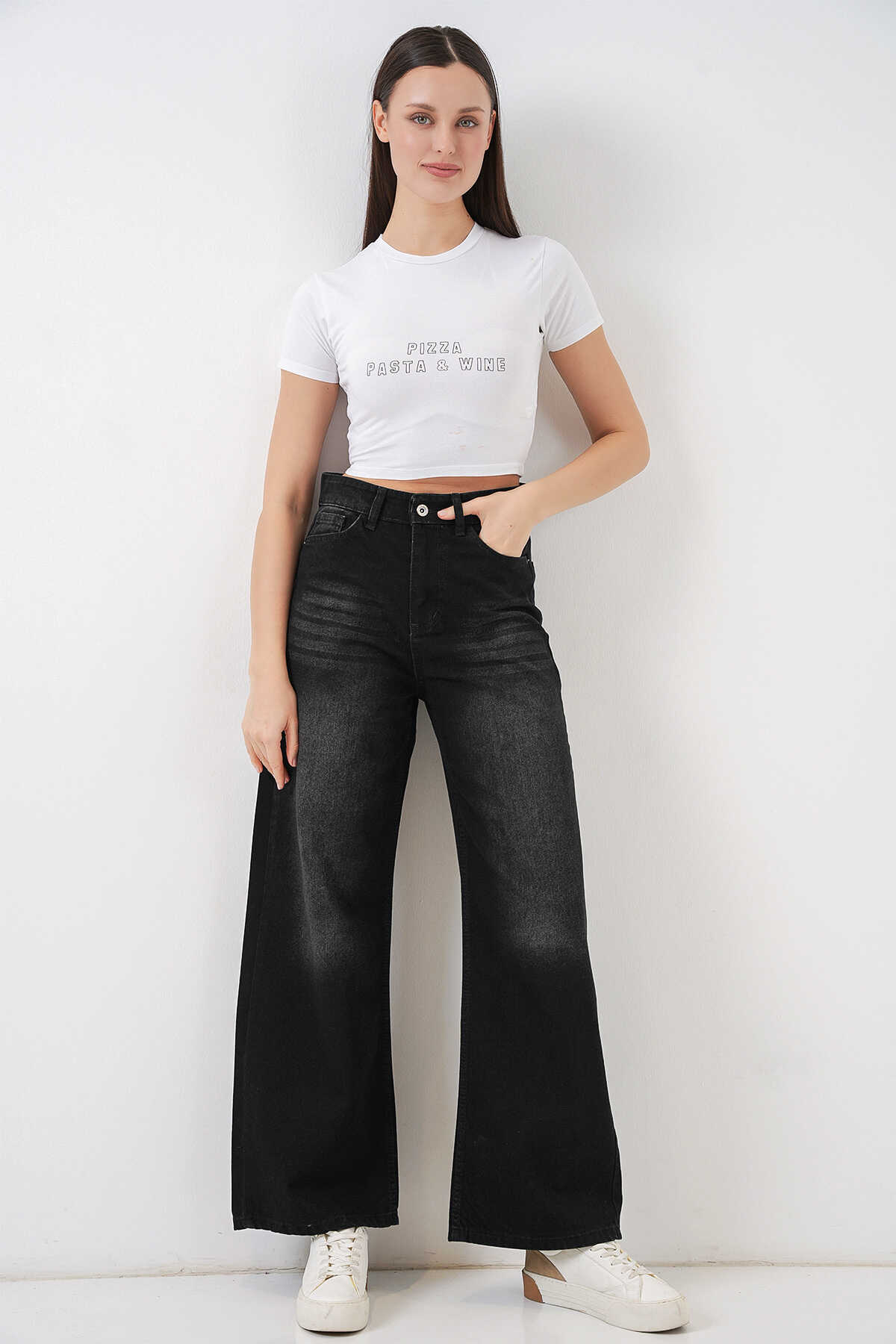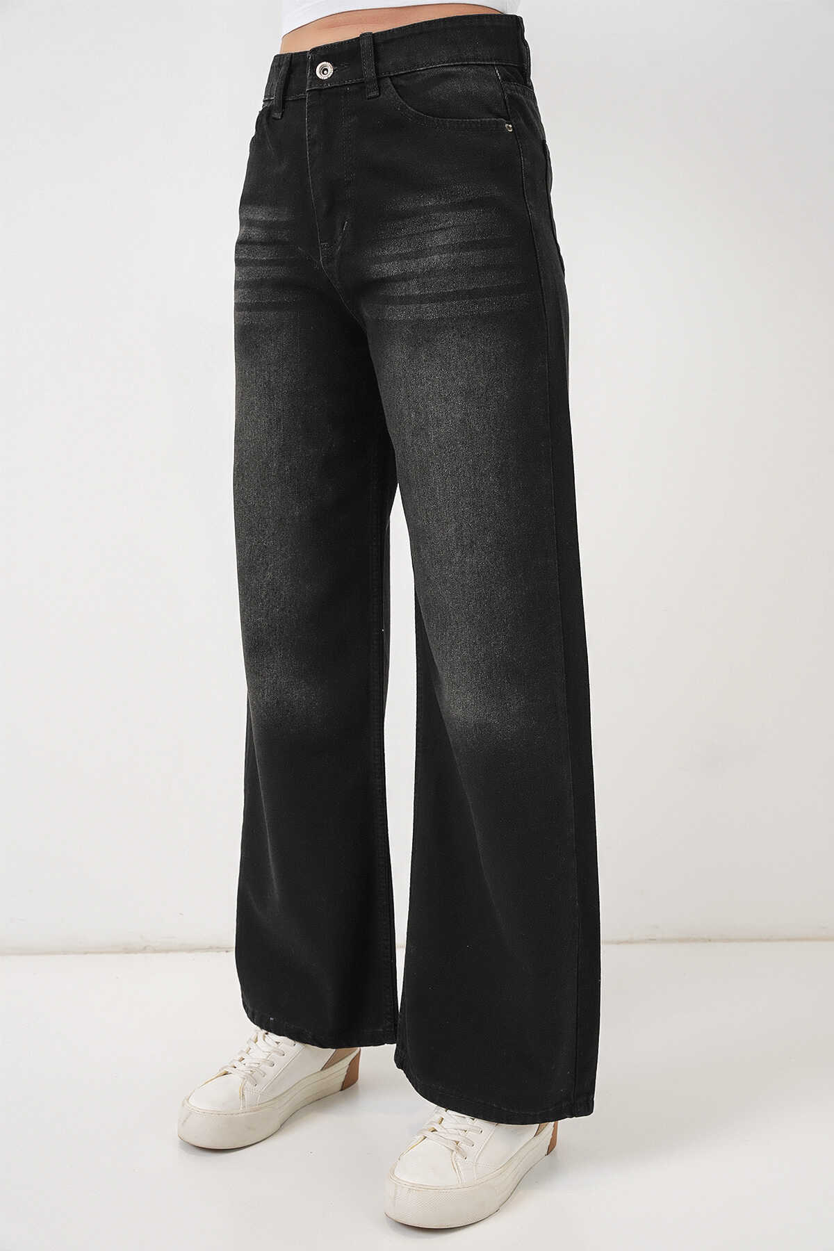 Kadın Bol Paça Yüksek Bel Palazzo Kot Pantolon 6656 - Siyah - Kombin