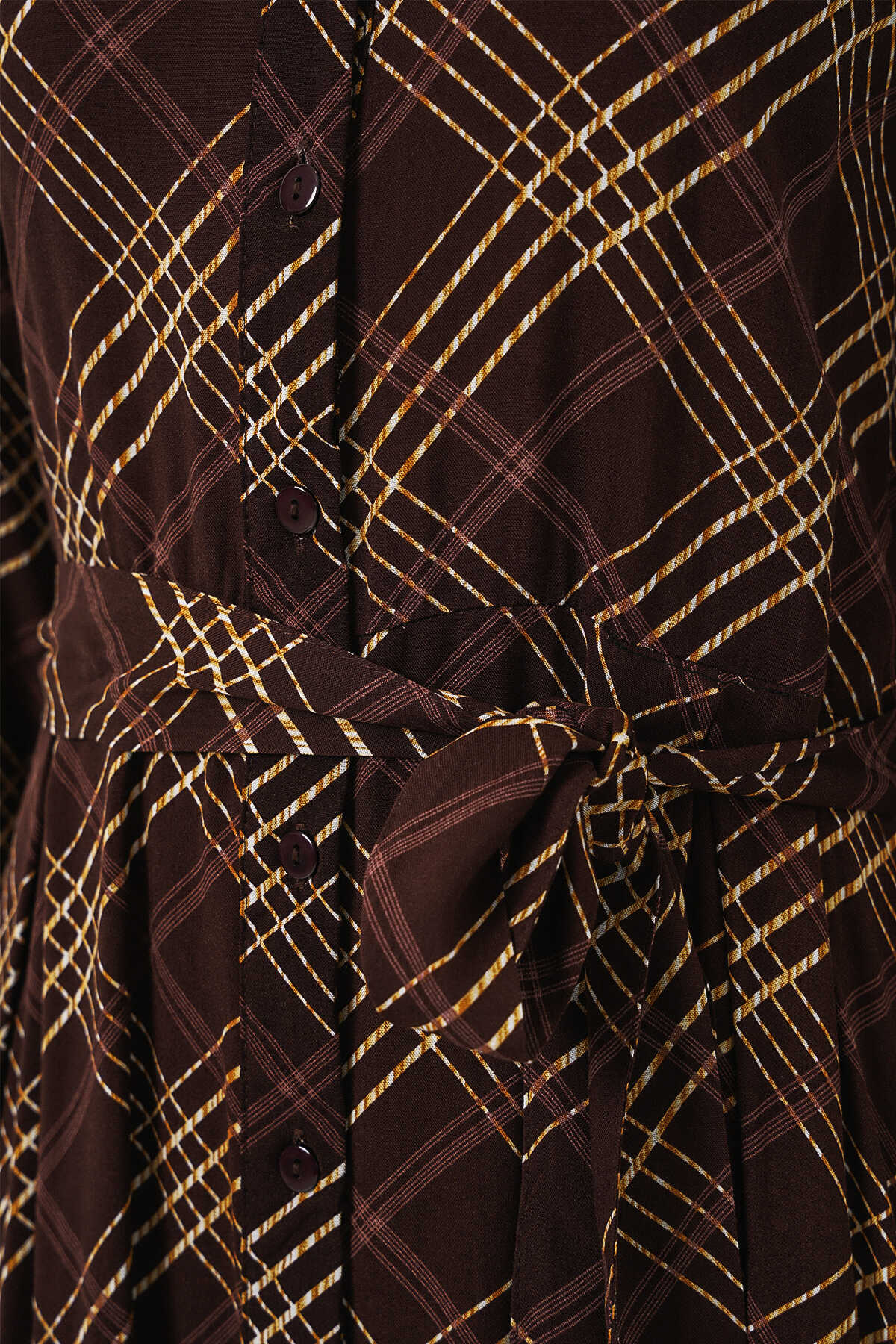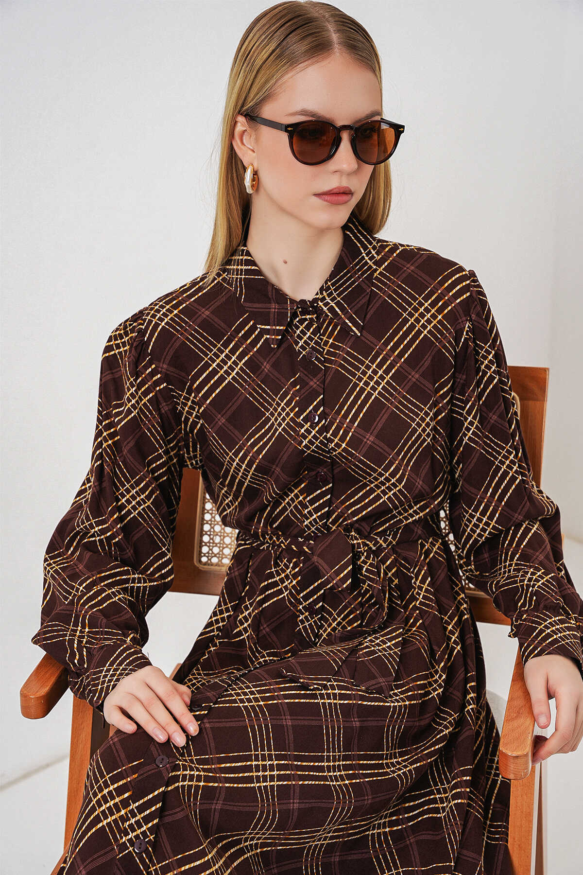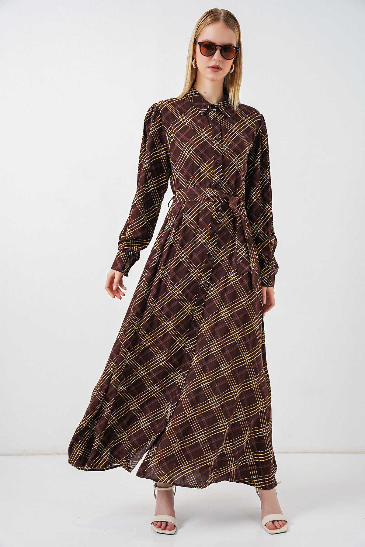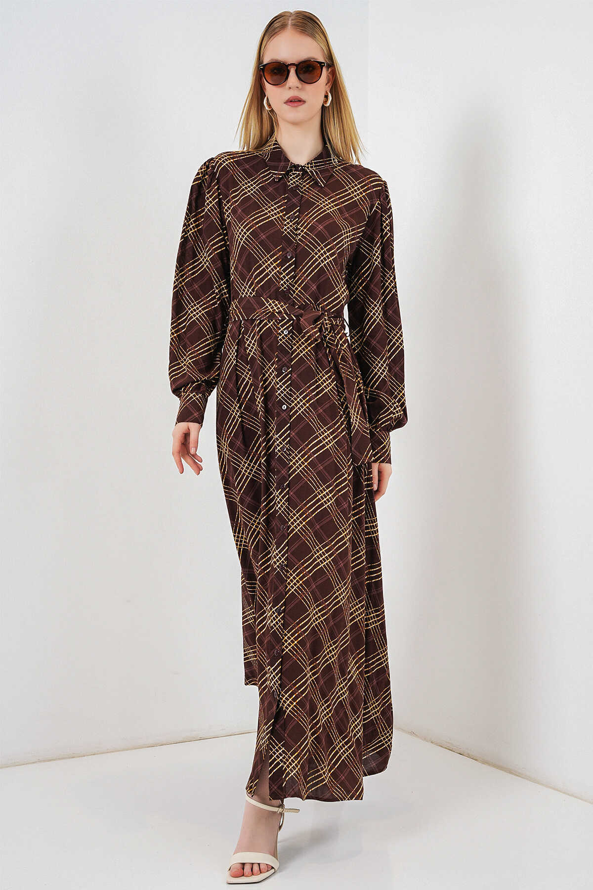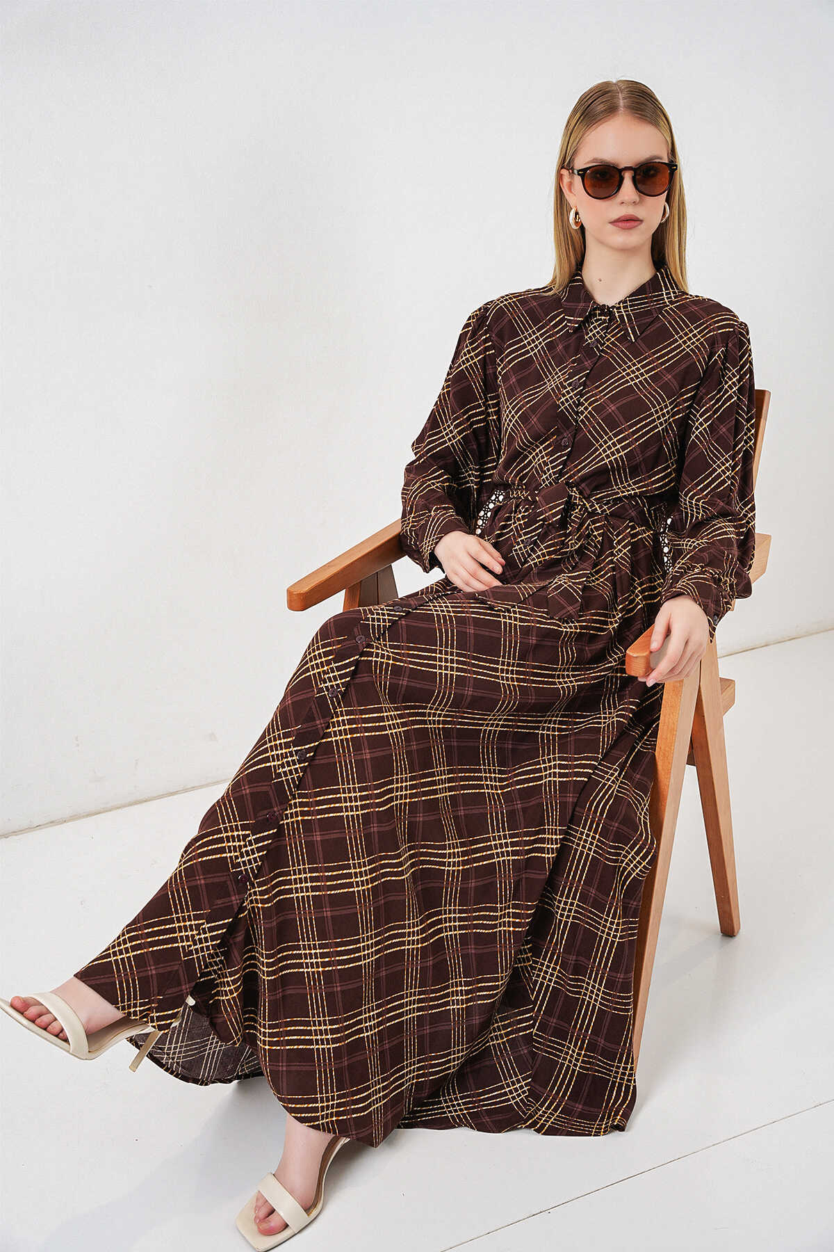 Kadın Boydan Düğmeli Uzun Tesettür Elbise 2588 - Kahverengi - Kombin
