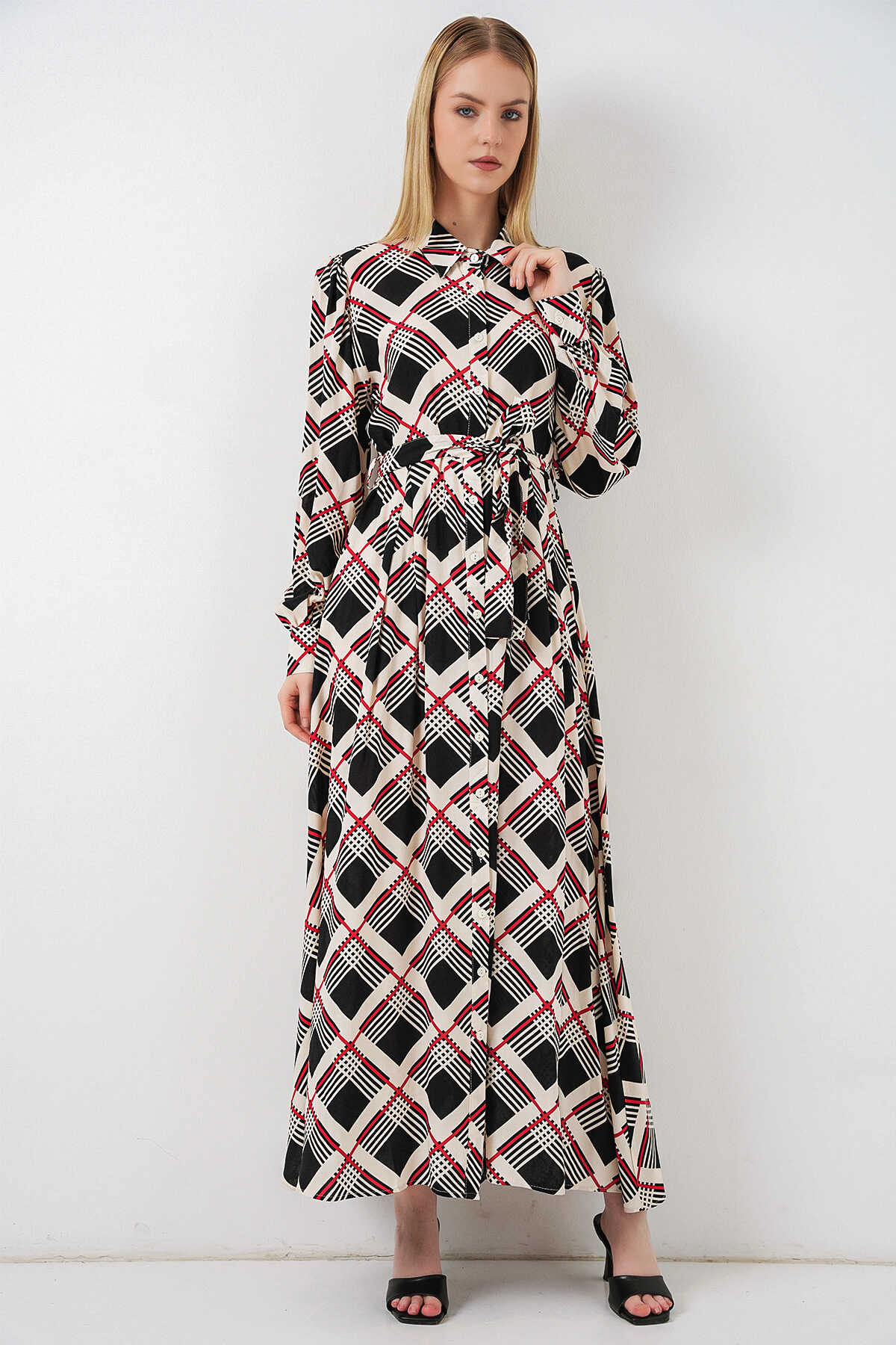 Kadın Boydan Düğmeli Uzun Tesettür Elbise 2588 - Siyah - Bej - Kombin