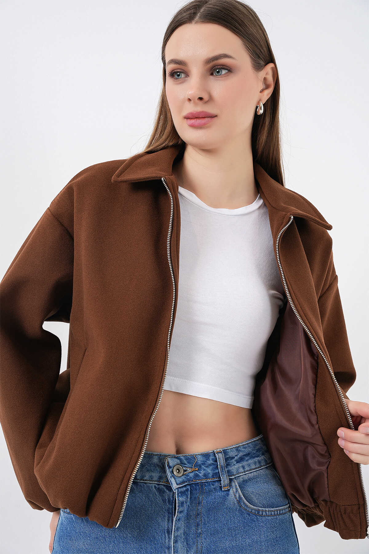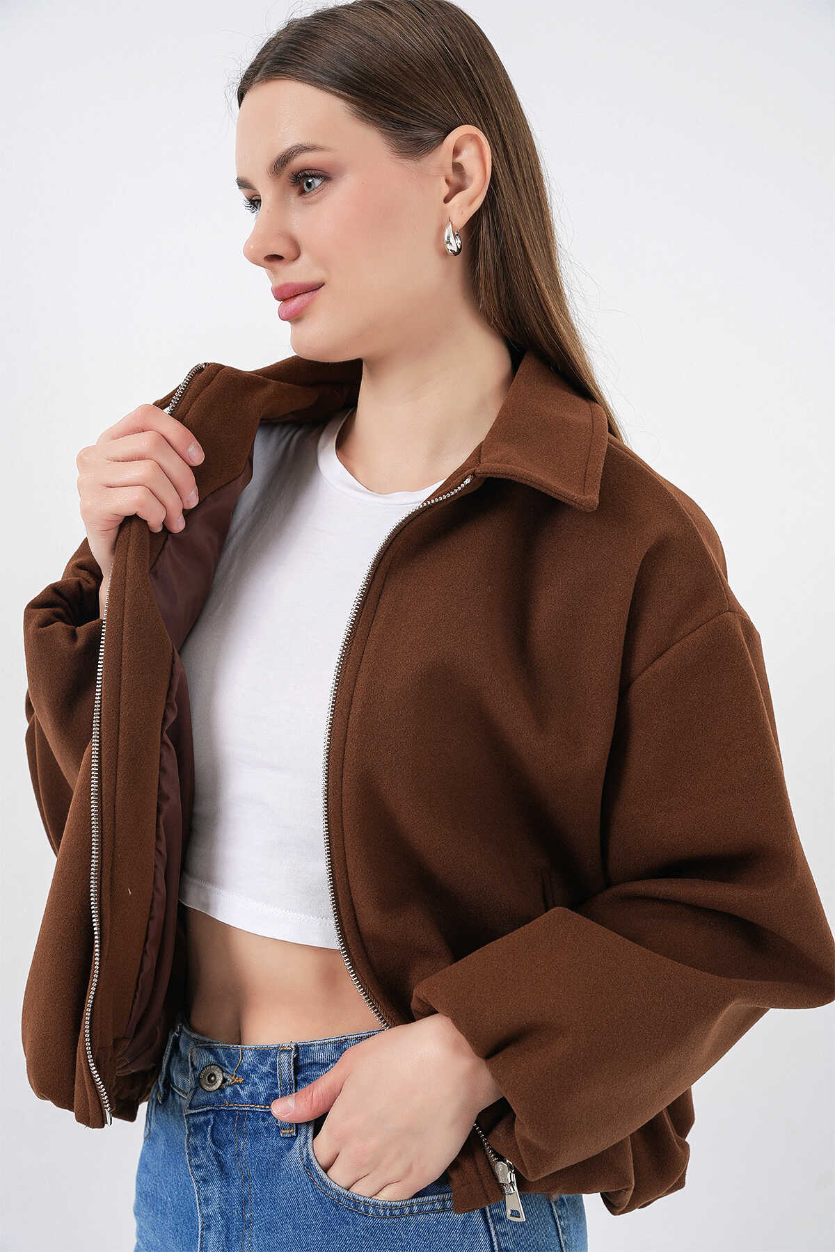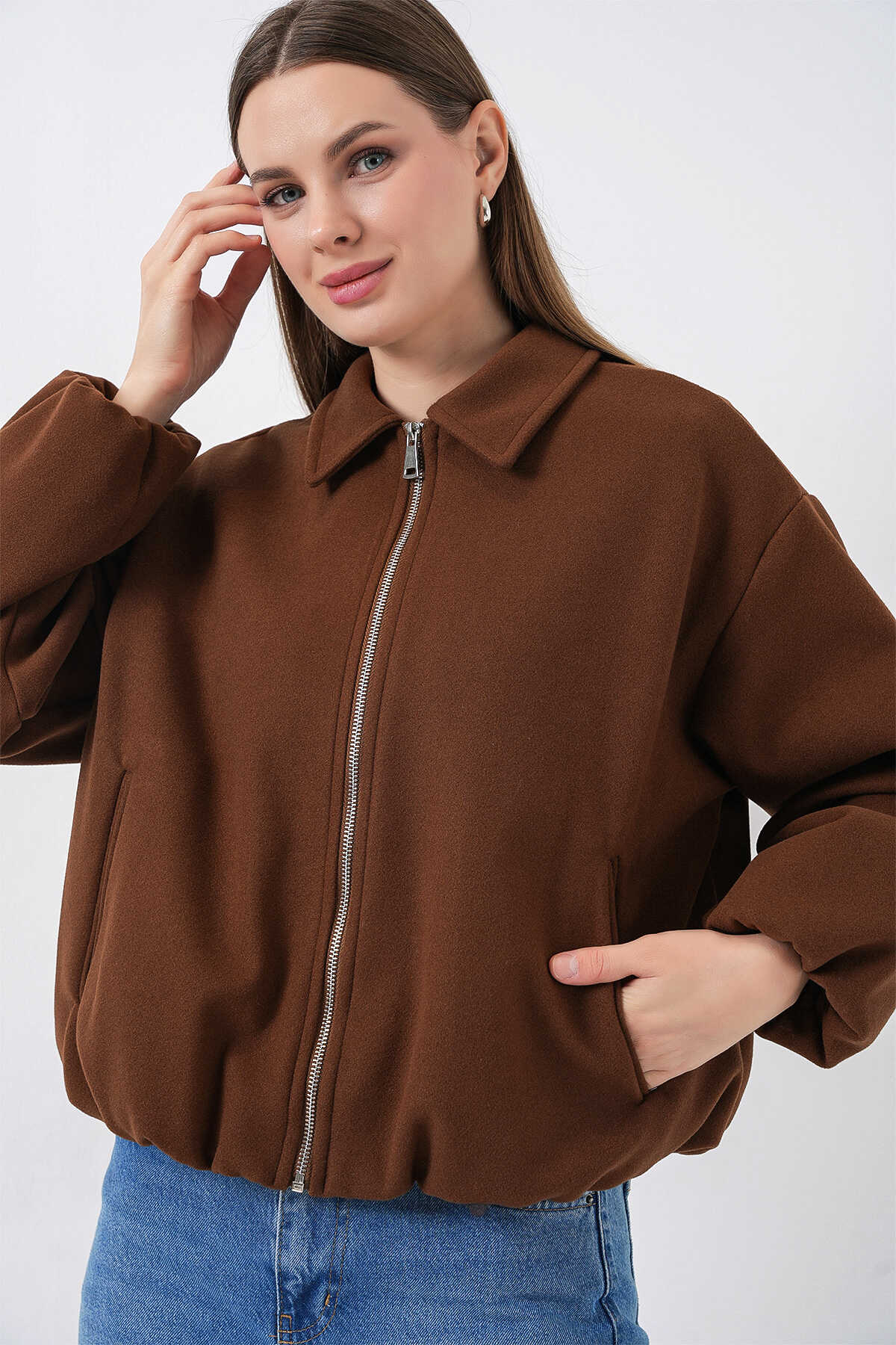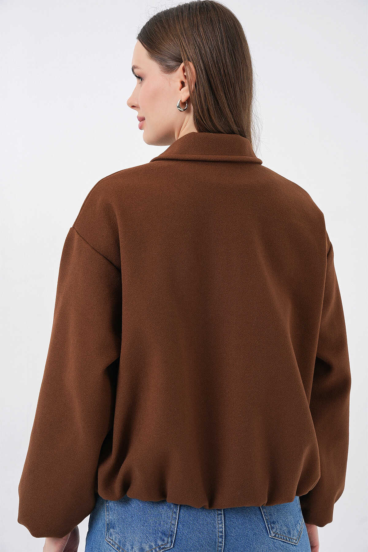 Kadın Büzgülü Oversize Kaşe Ceket 0728 - Sütlü Kahve - Kombin