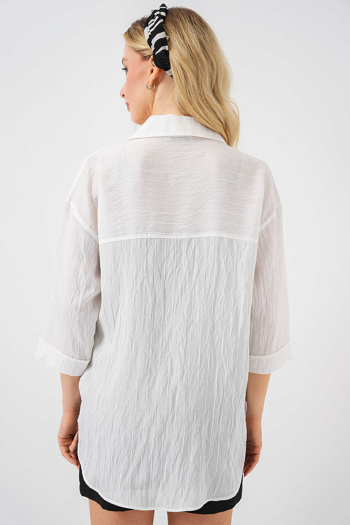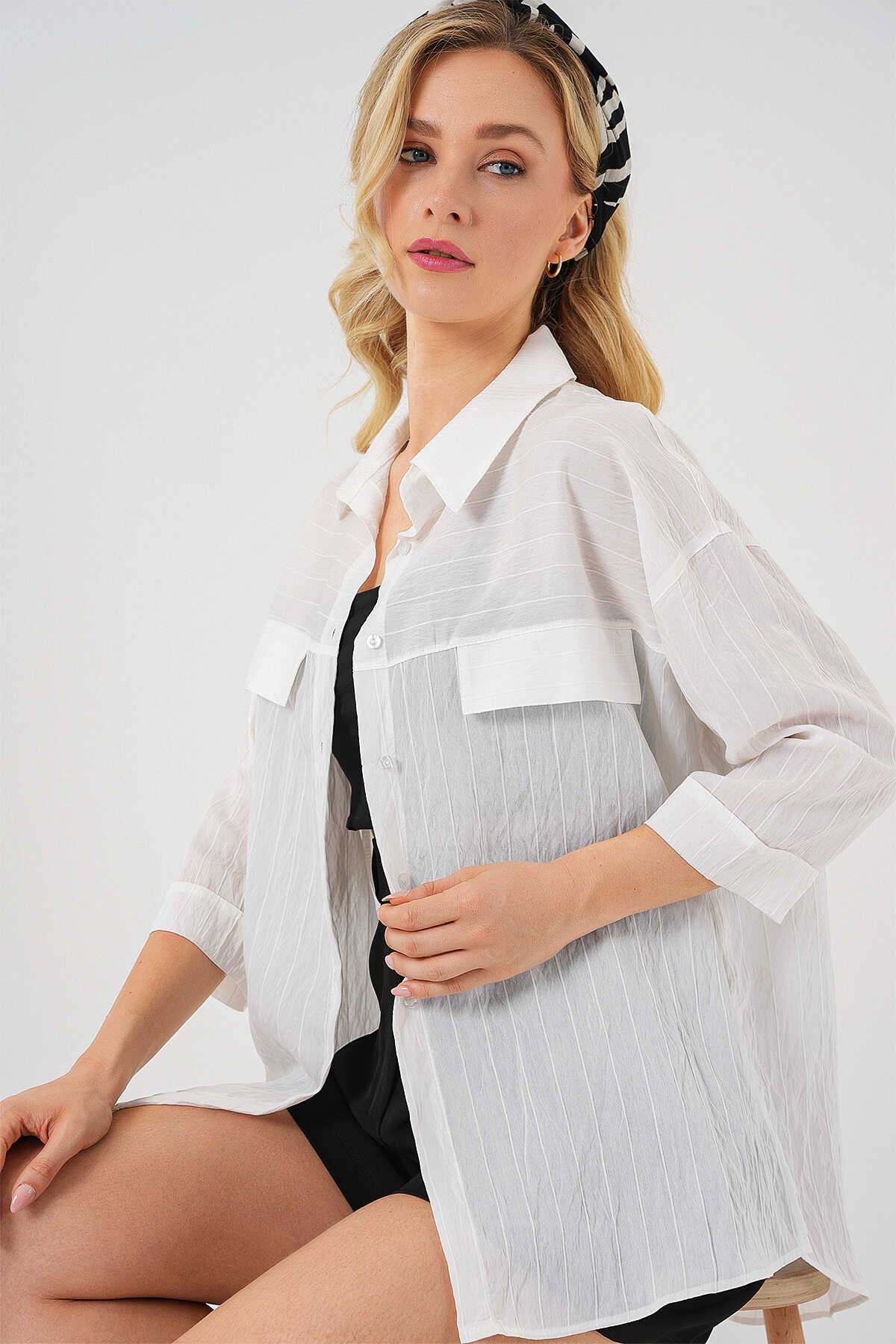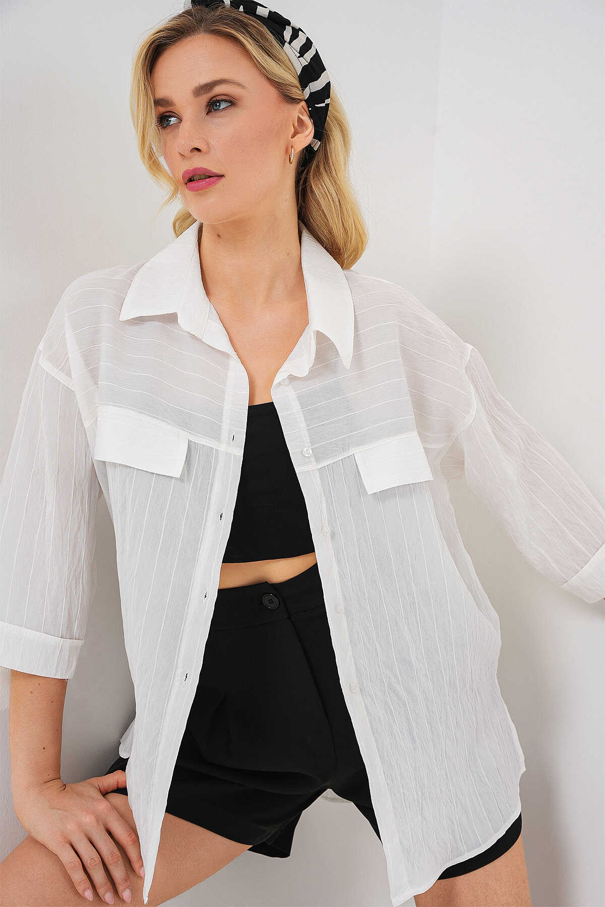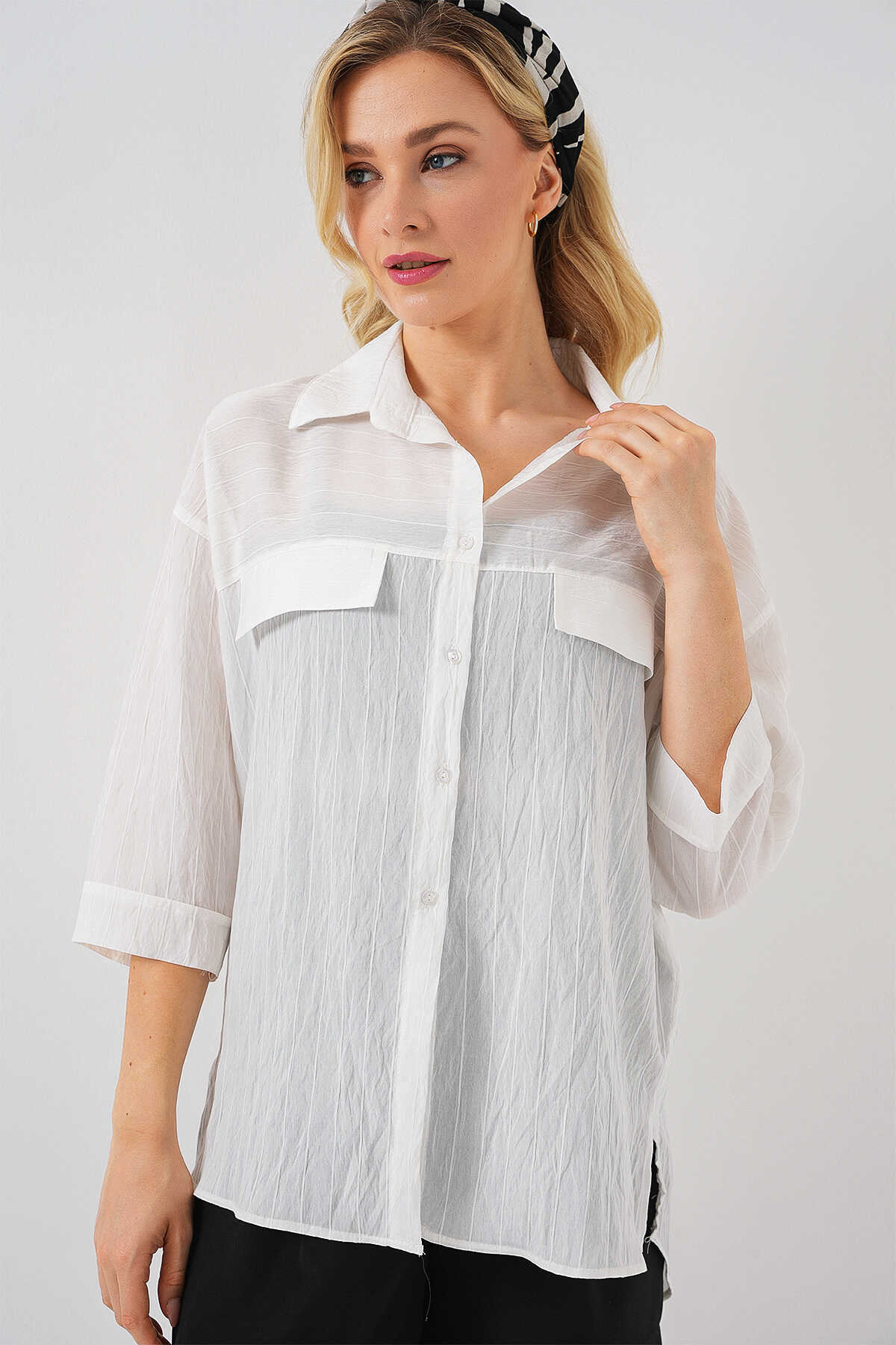 Kadin Cep Detayli Kisa Kol Gömlek