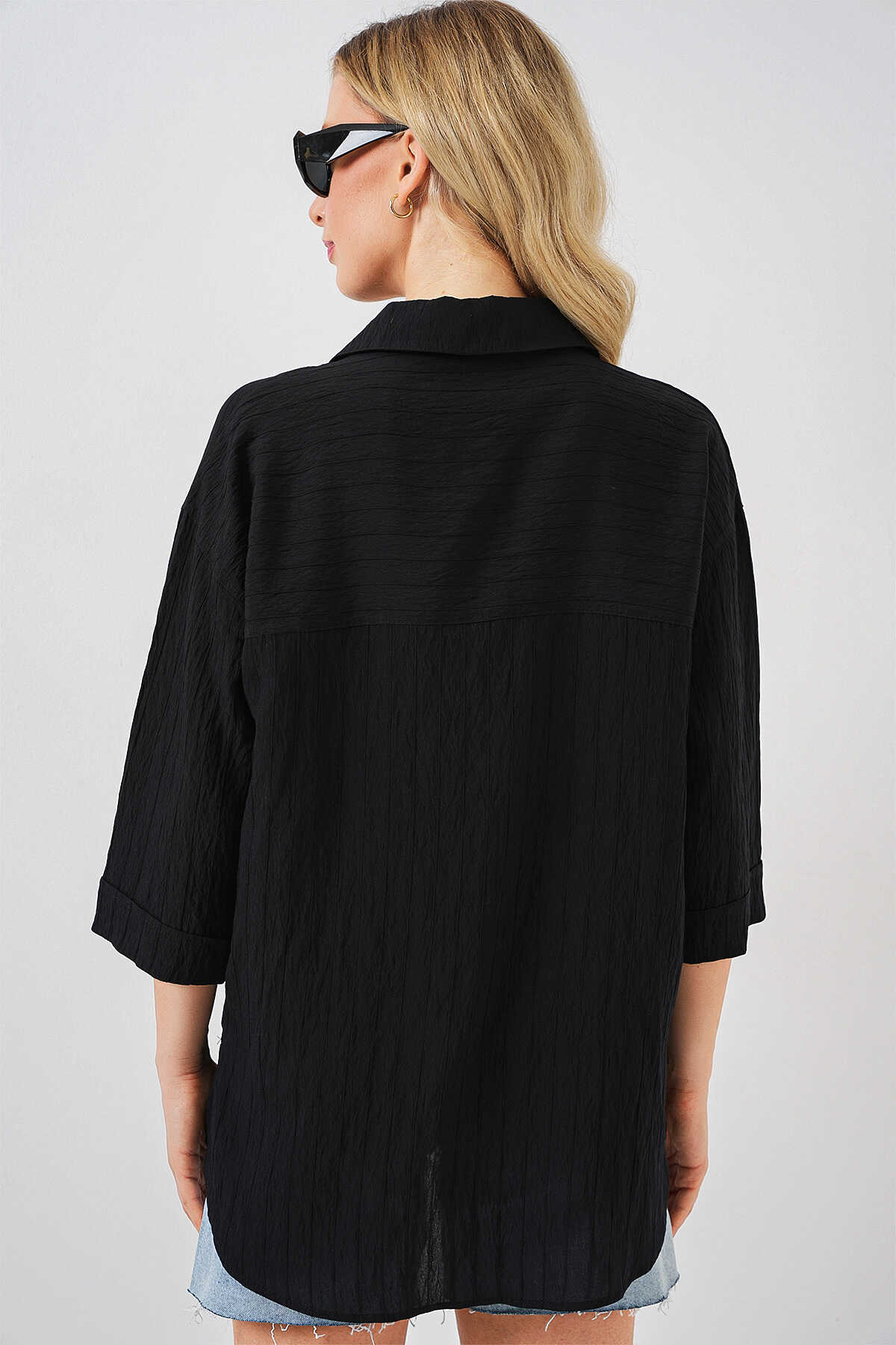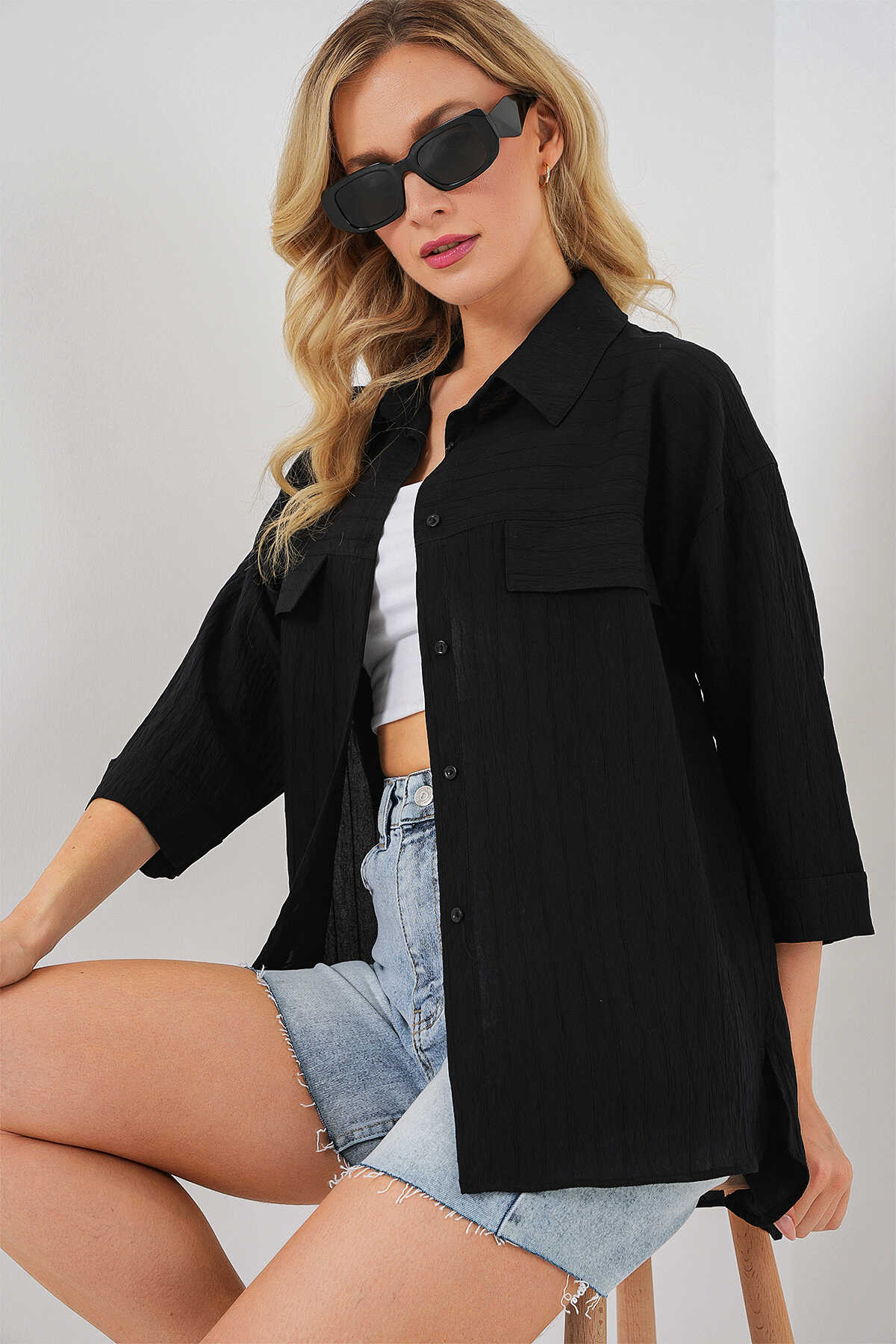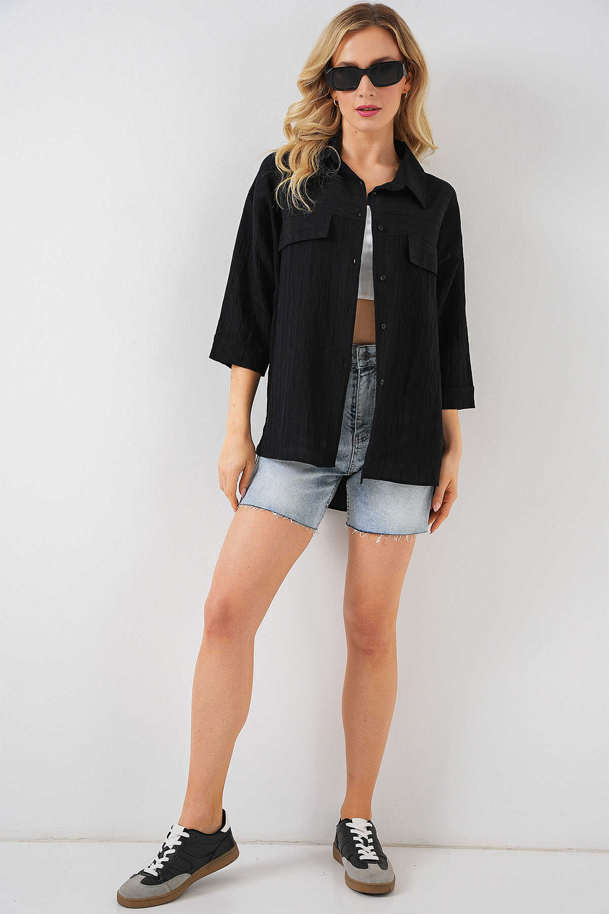 Kadin Cep Detayli Kisa Kol Gömlek