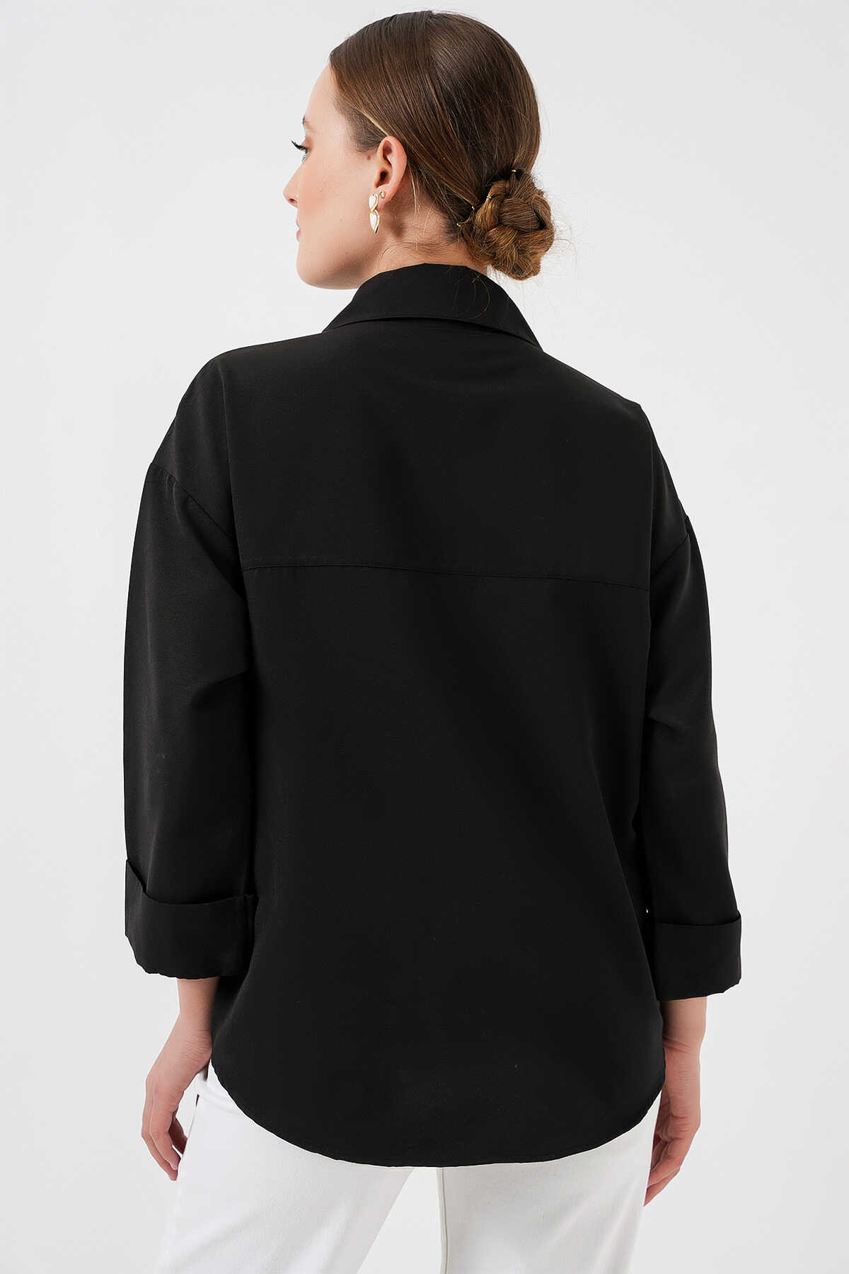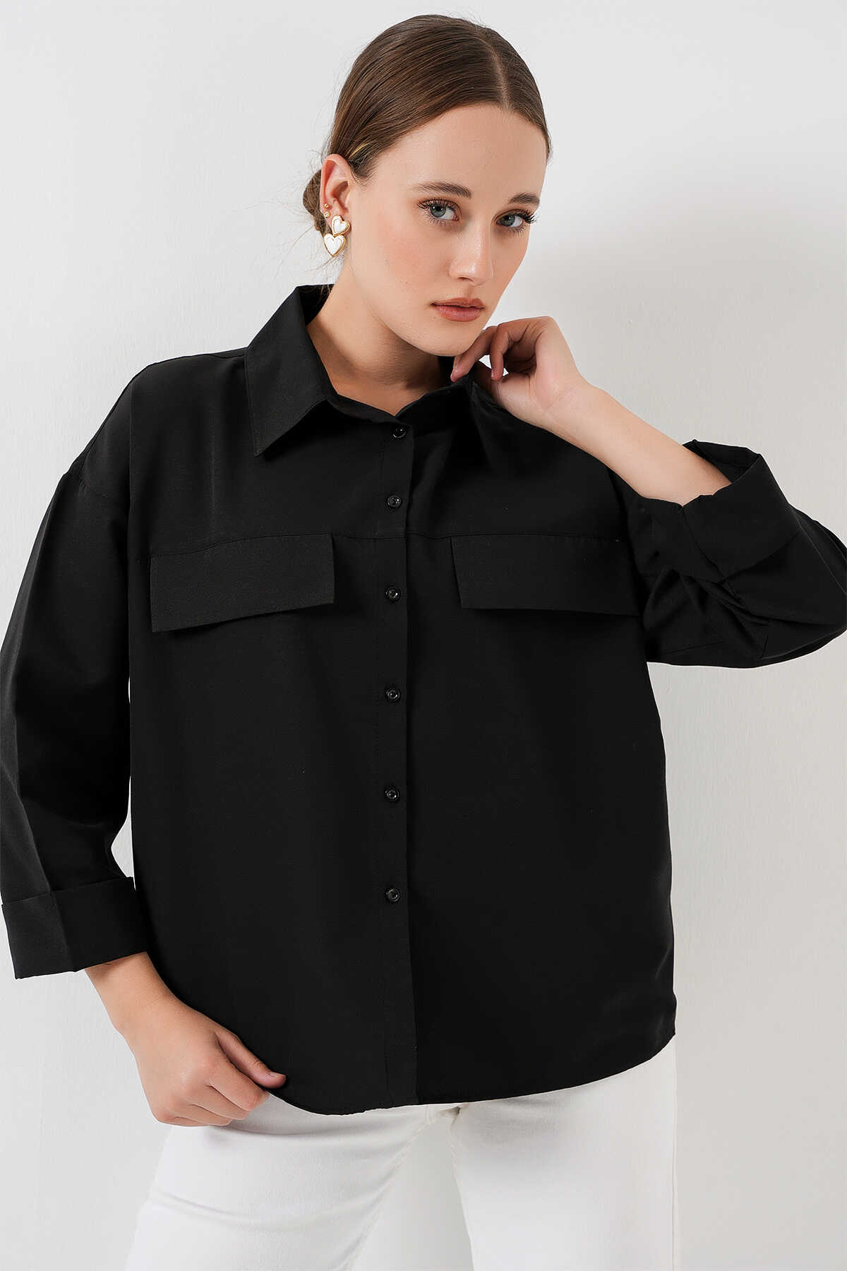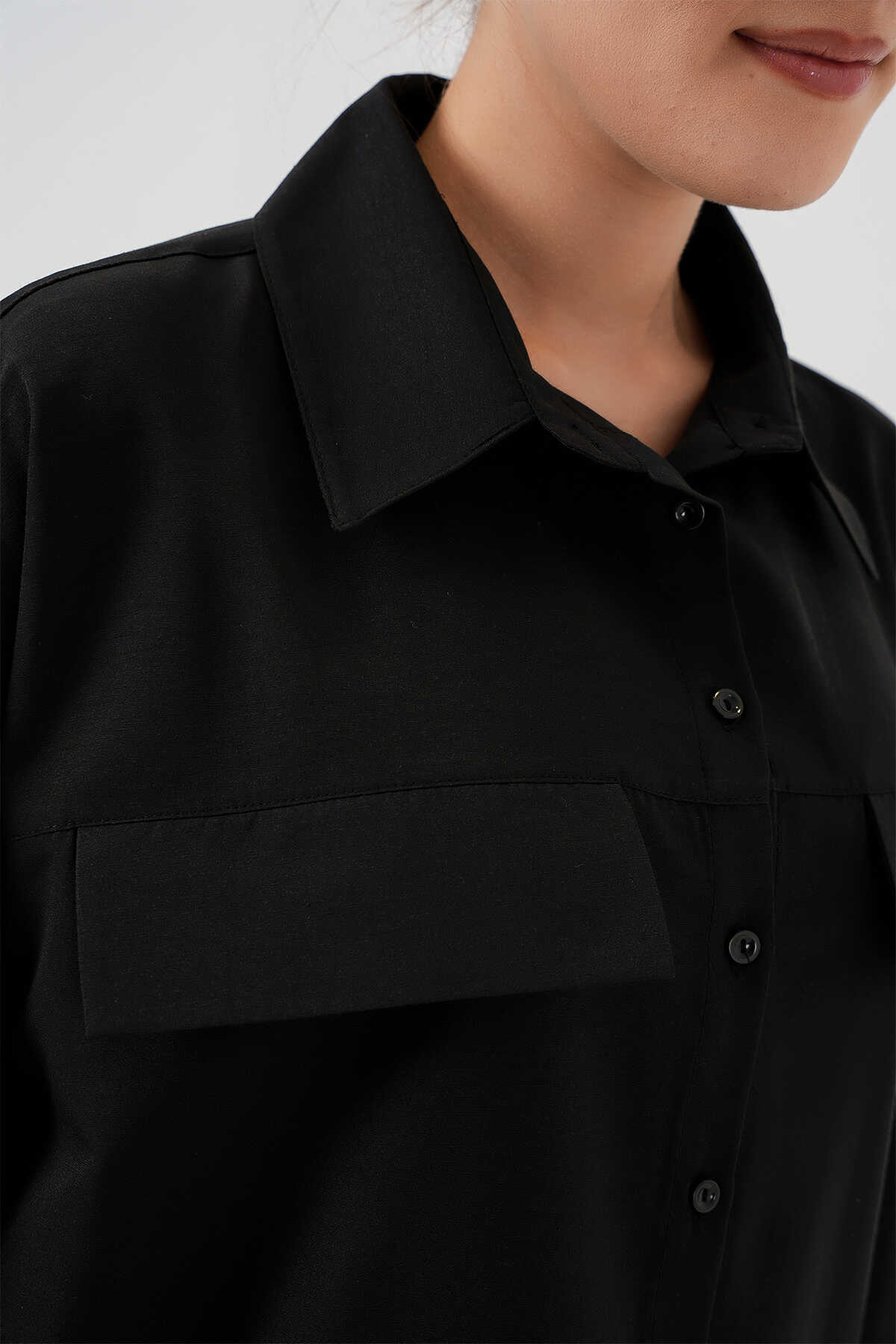 Kadın Cep Detaylı Oversize Gömlek 20313 - Siyah - Kombin