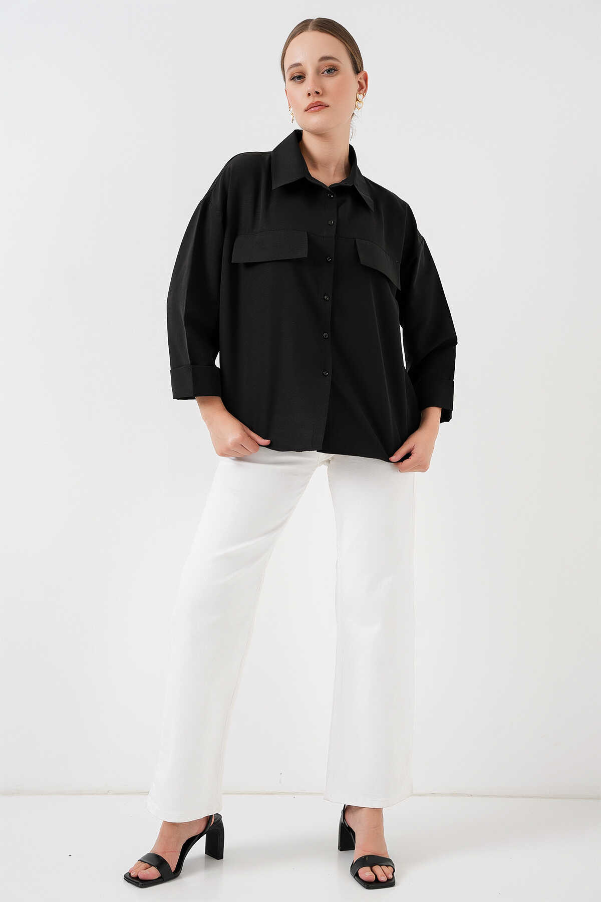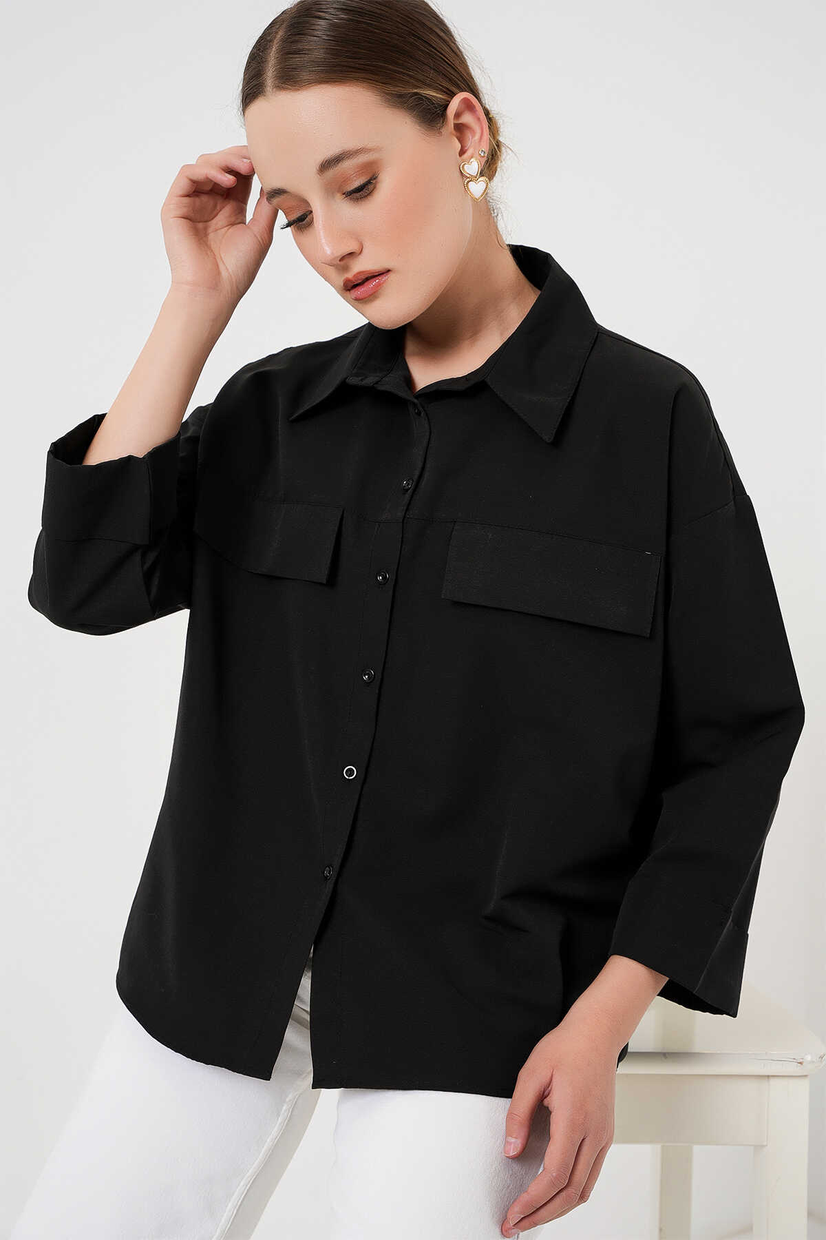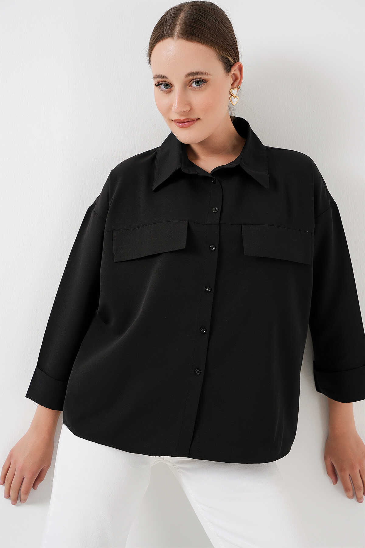 Kadın Cep Detaylı Oversize Gömlek 20313 - Siyah - Kombin
