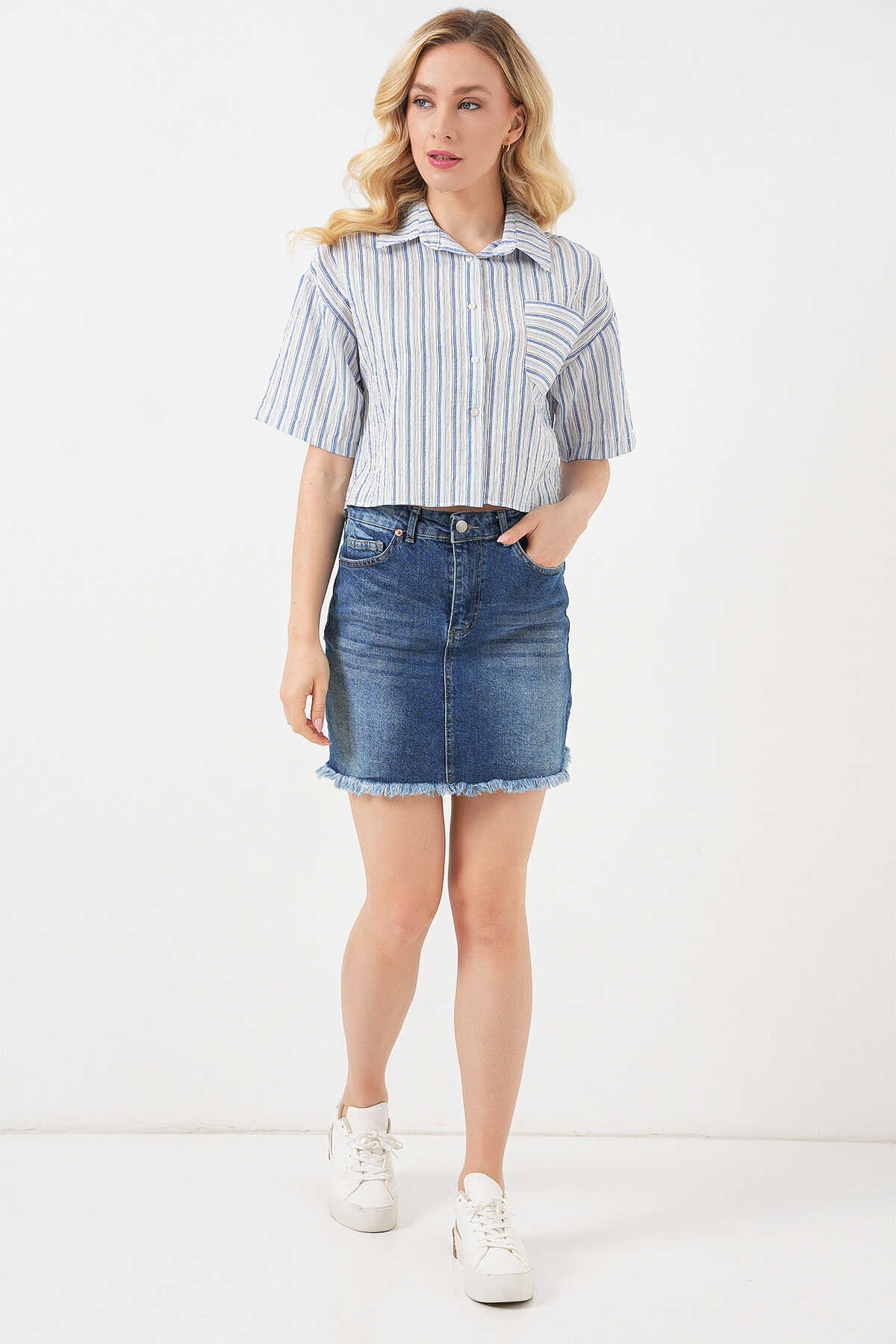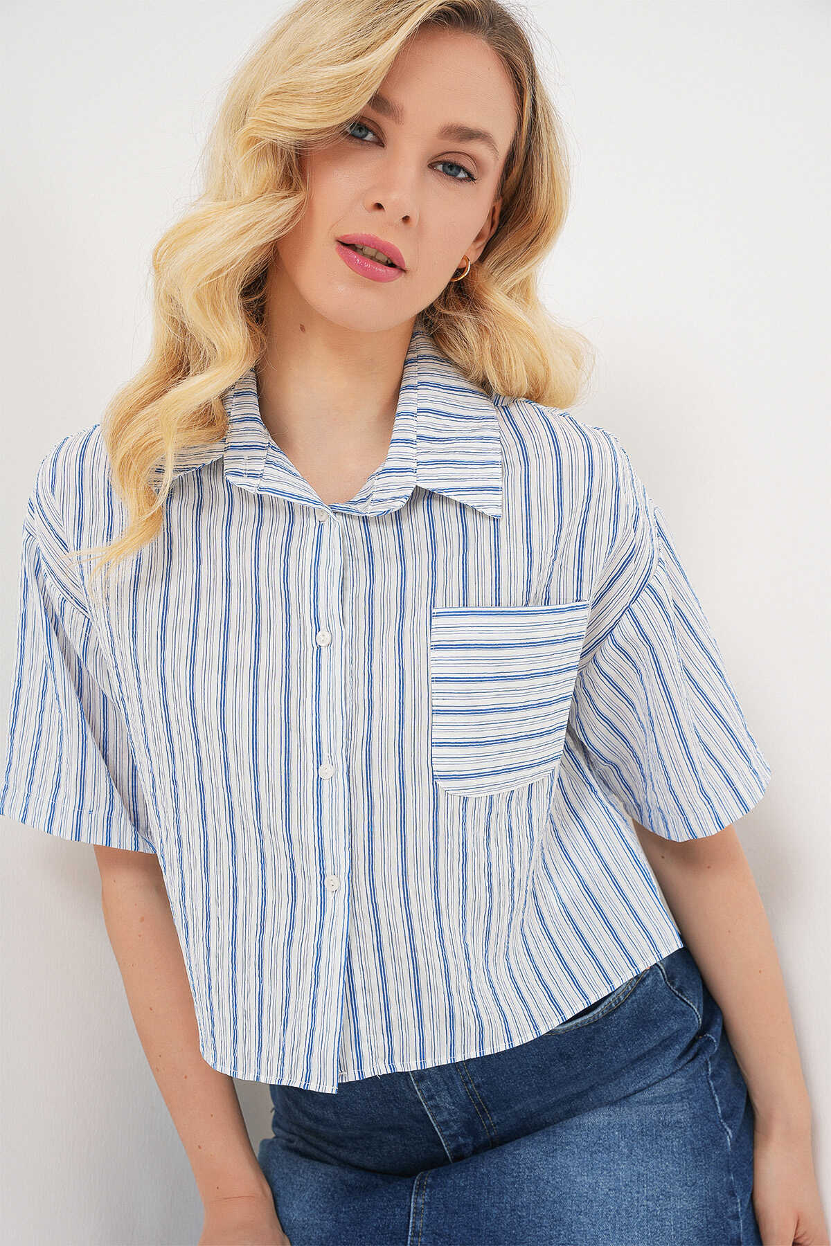 Kadın Çizgili Crop Gömlek 20342 - Mavi - Kombin