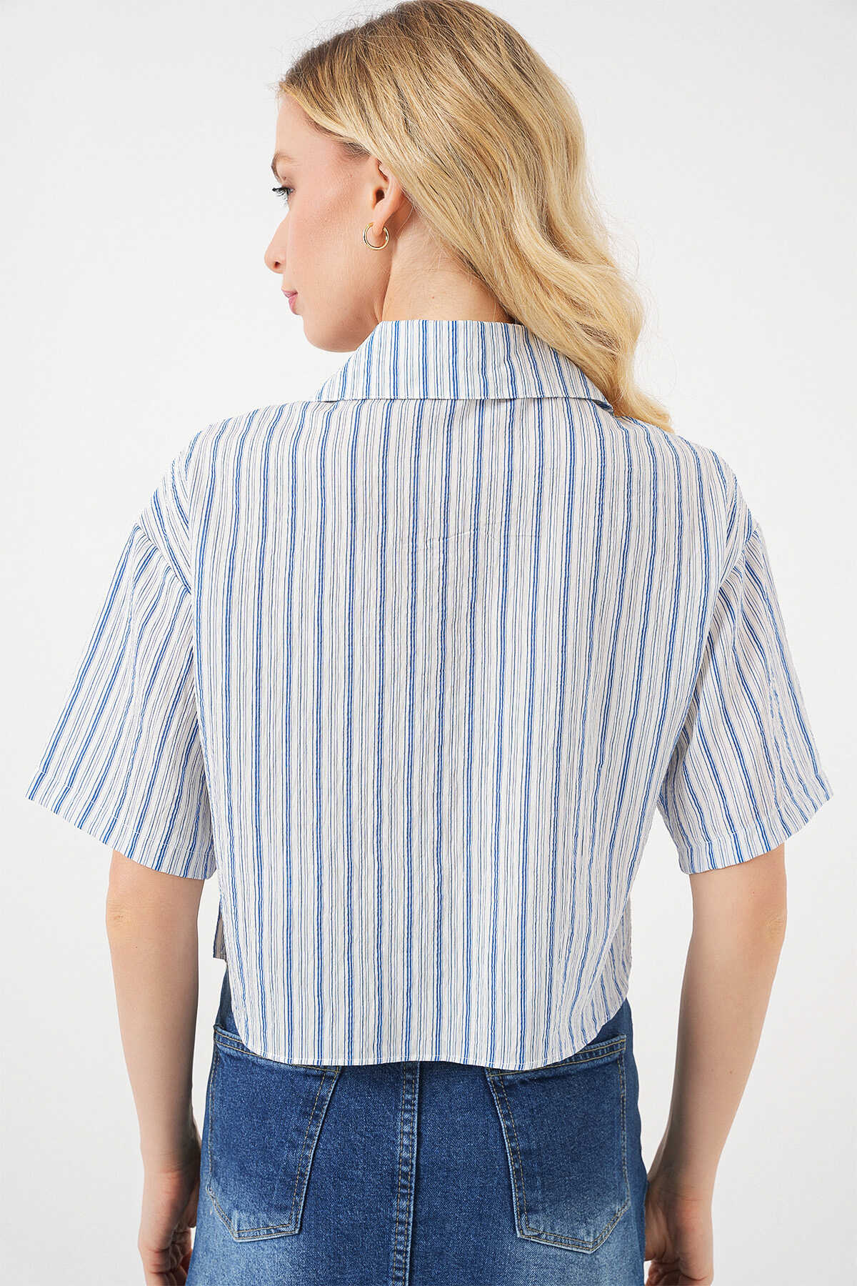 Kadın Çizgili Crop Gömlek 20342 - Mavi