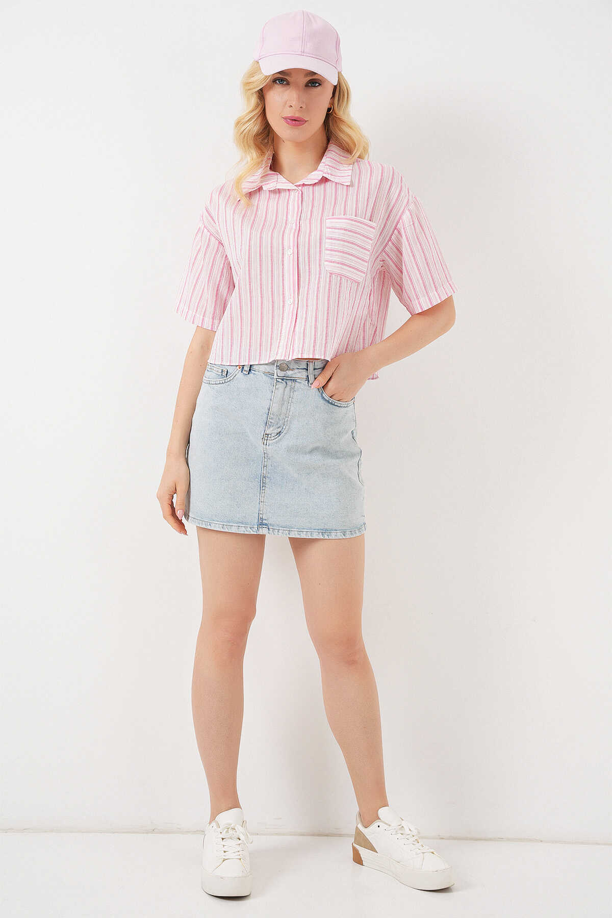 Kadın Çizgili Crop Gömlek 20342 - Pudra - Kombin