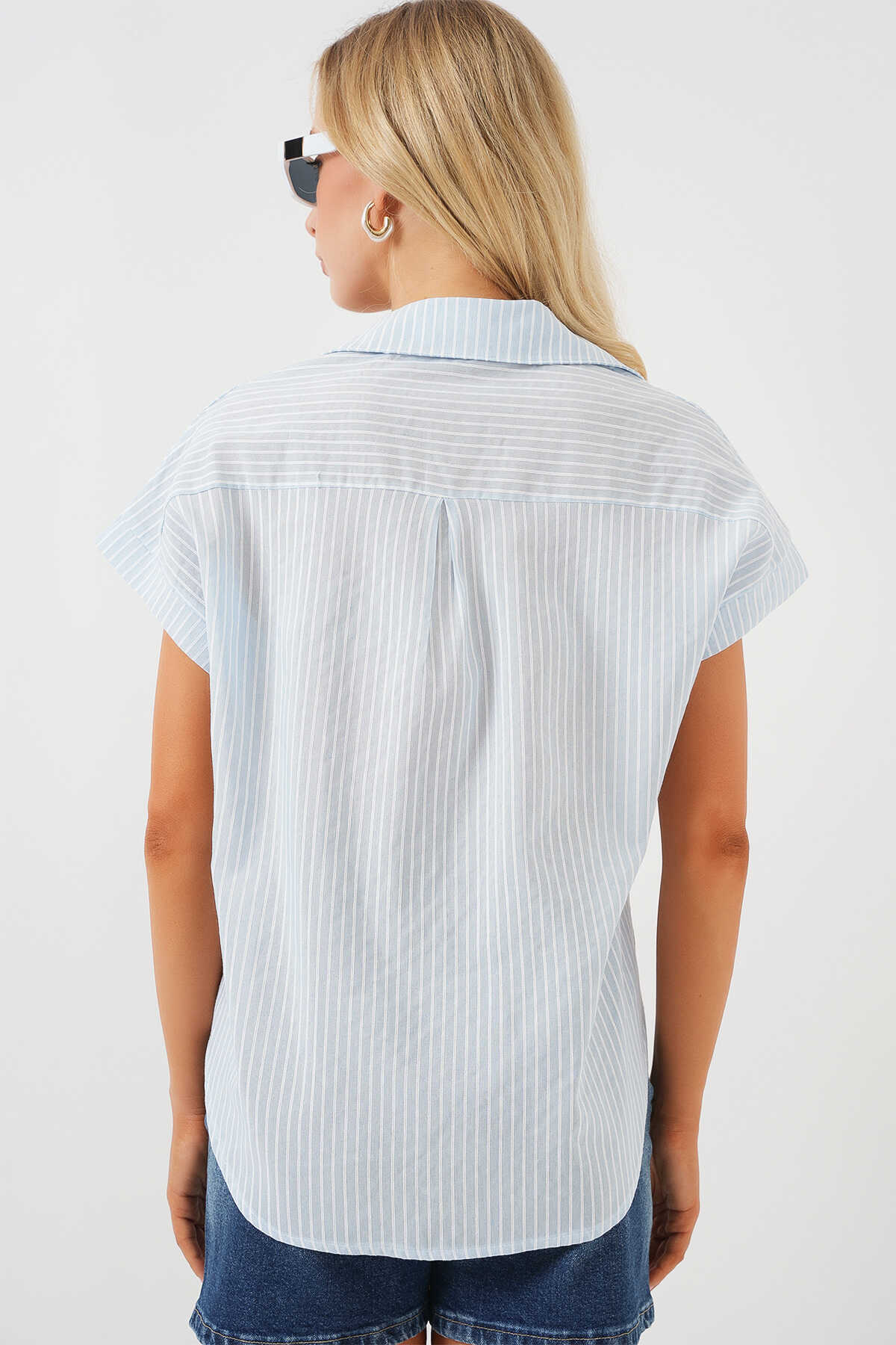 Kadın Çizgili Kısa Kol Gömlek 20324 - Açık Mavi - Kombin