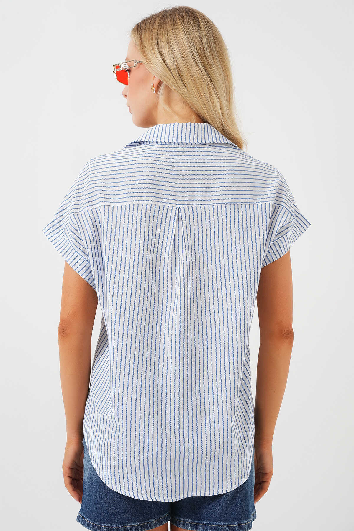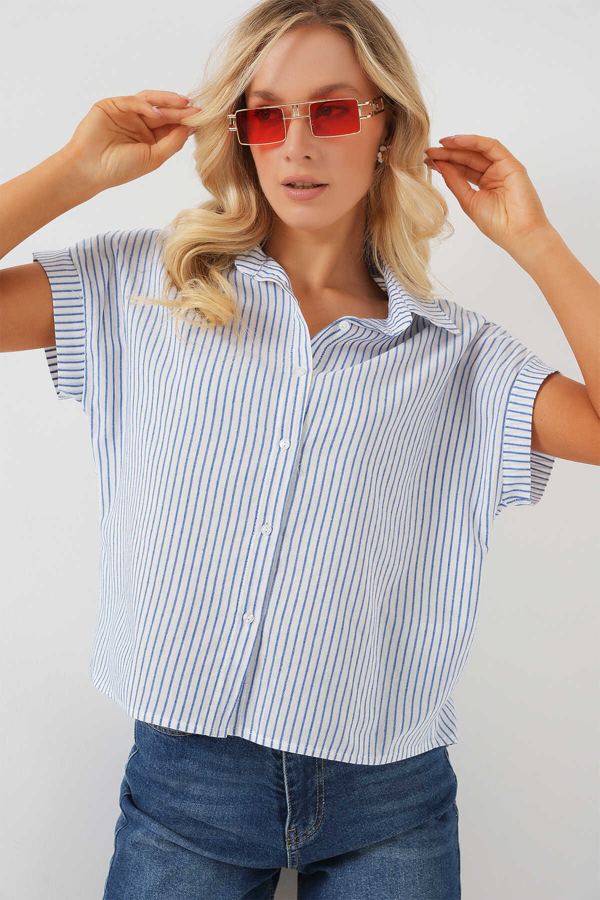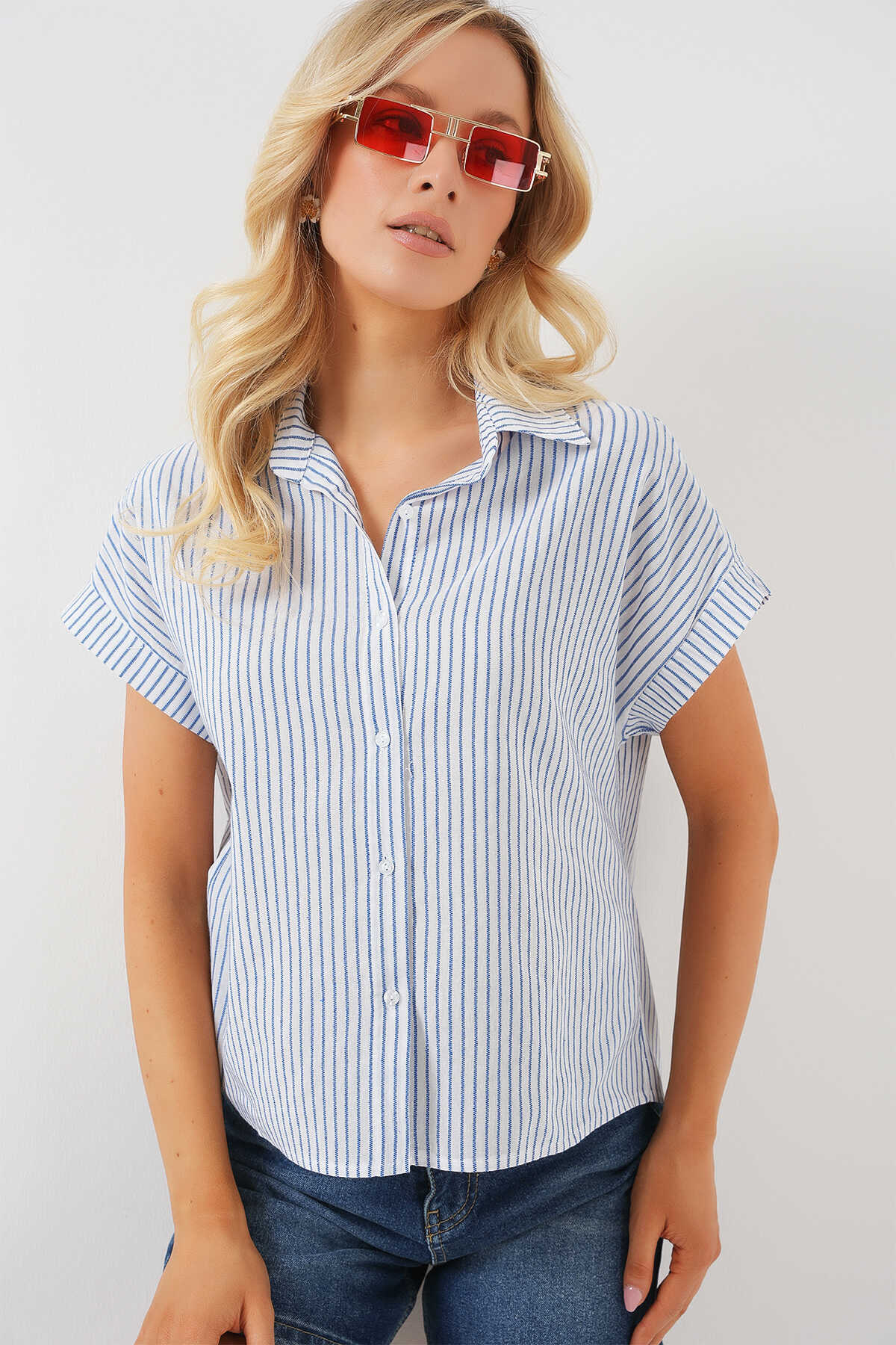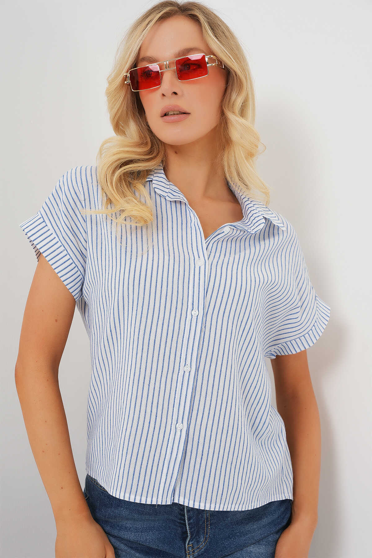 Kadın Çizgili Kısa Kol Gömlek 20324 - Mavi - Kombin