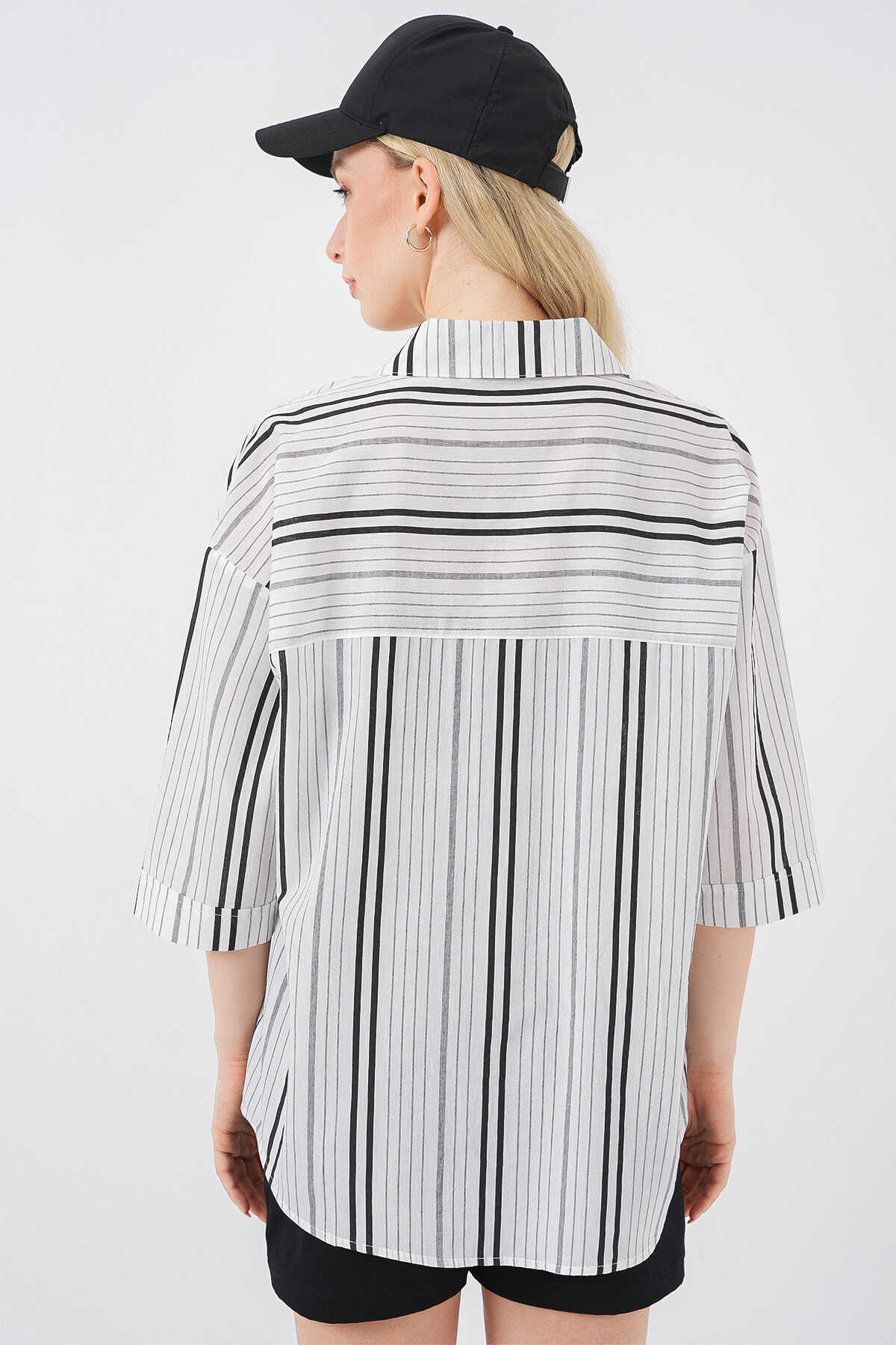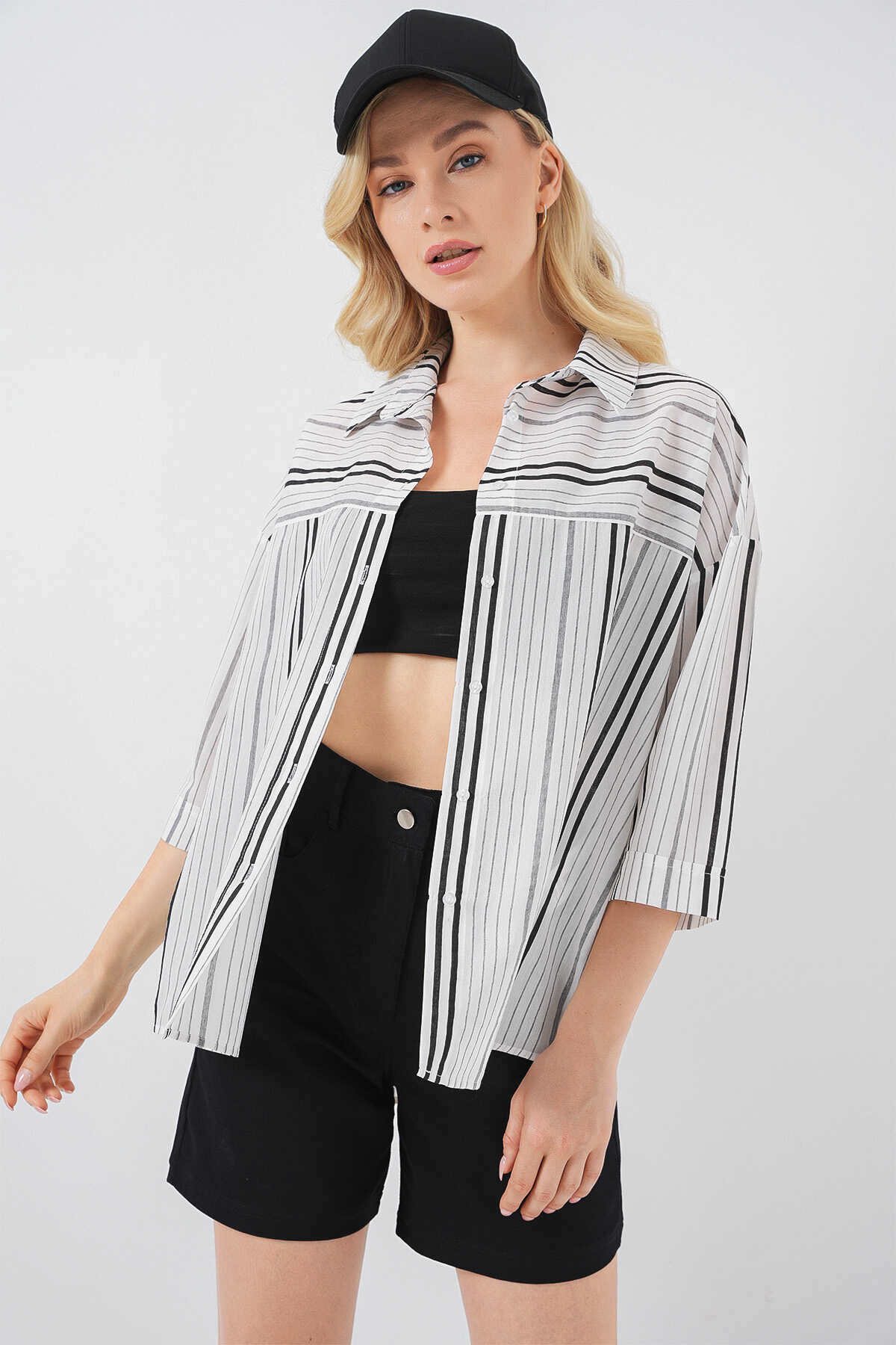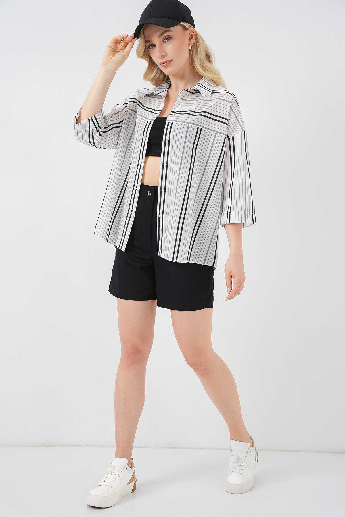 Kadın Çizgili Kısa Kol Gömlek 20344 - Siyah - Taş - Kombin