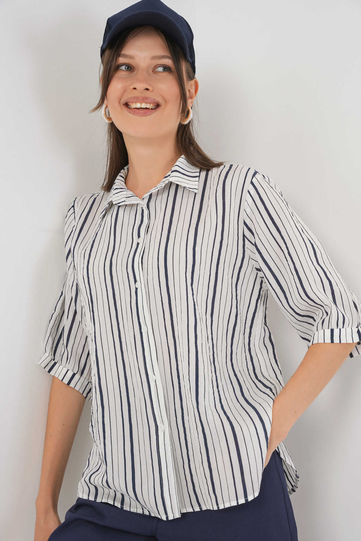 Kadın Çizgili Kısa Kol Gömlek 20345 - F.Lacivert - Kombin