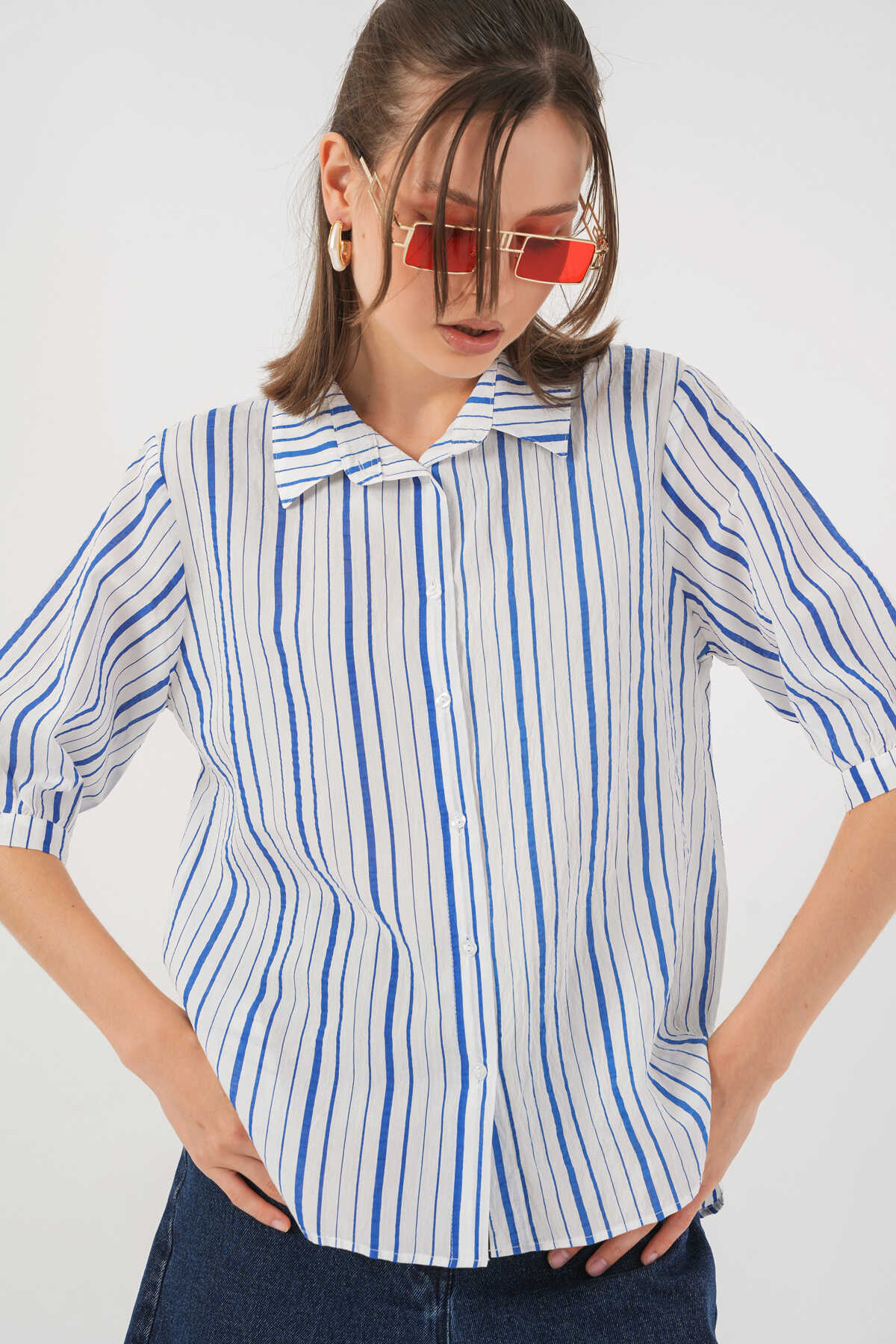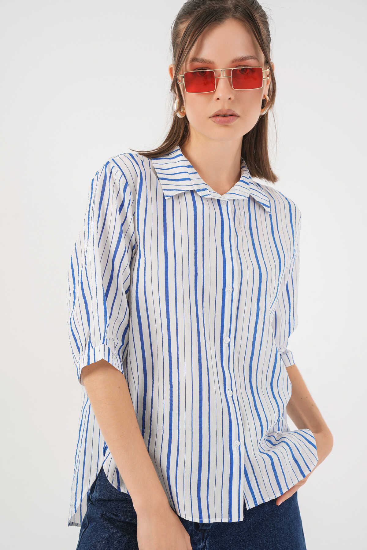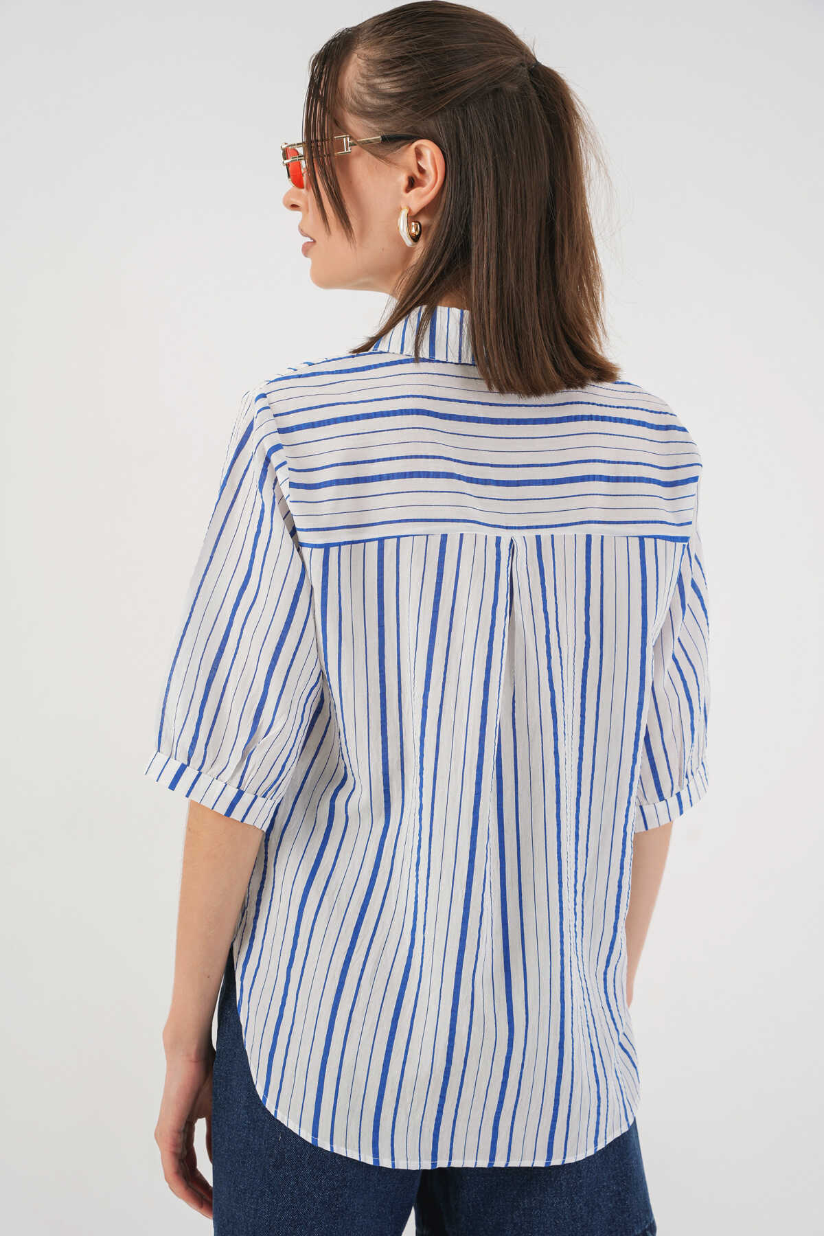 Kadın Çizgili Kısa Kol Gömlek 20345 - Mavi - Kombin
