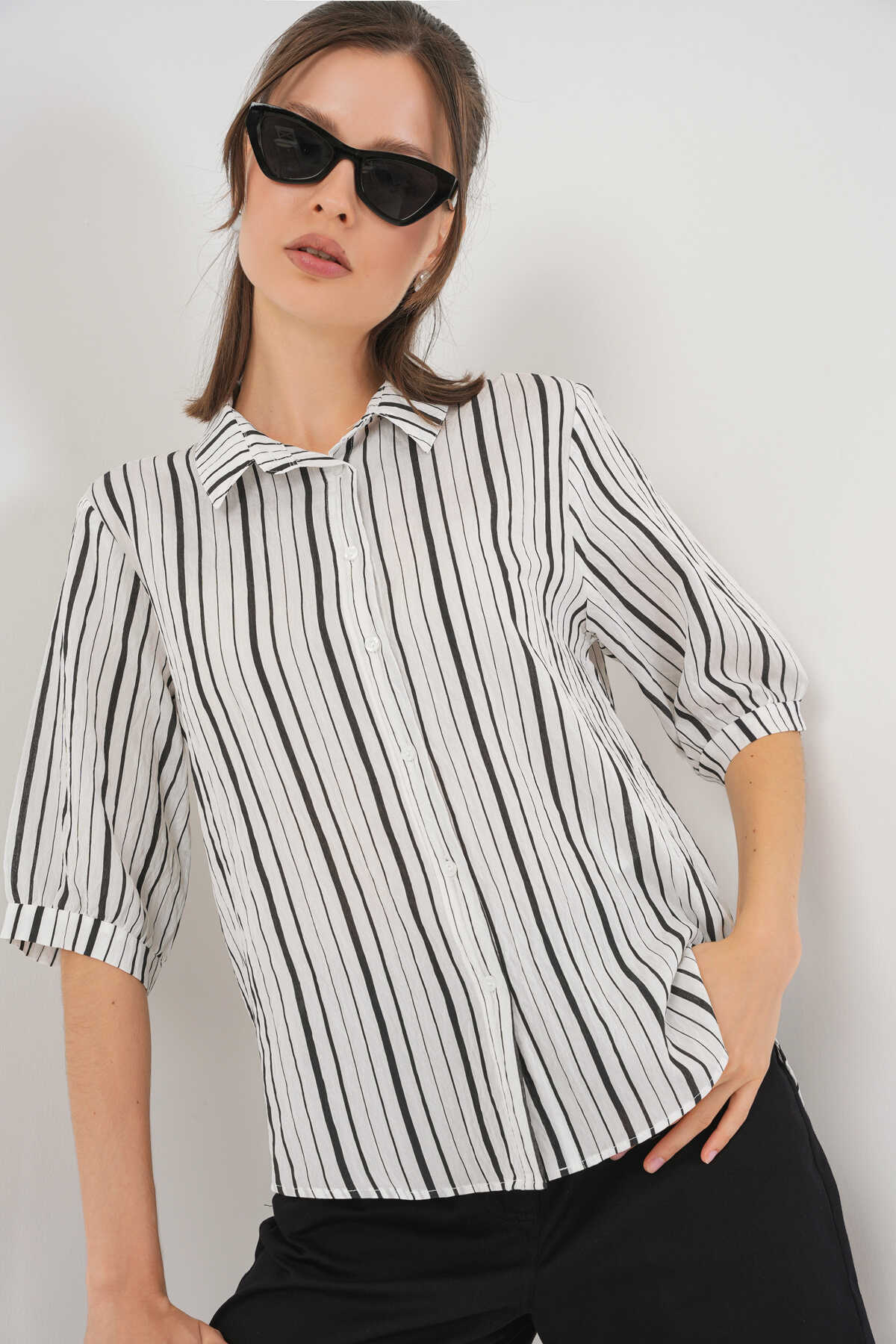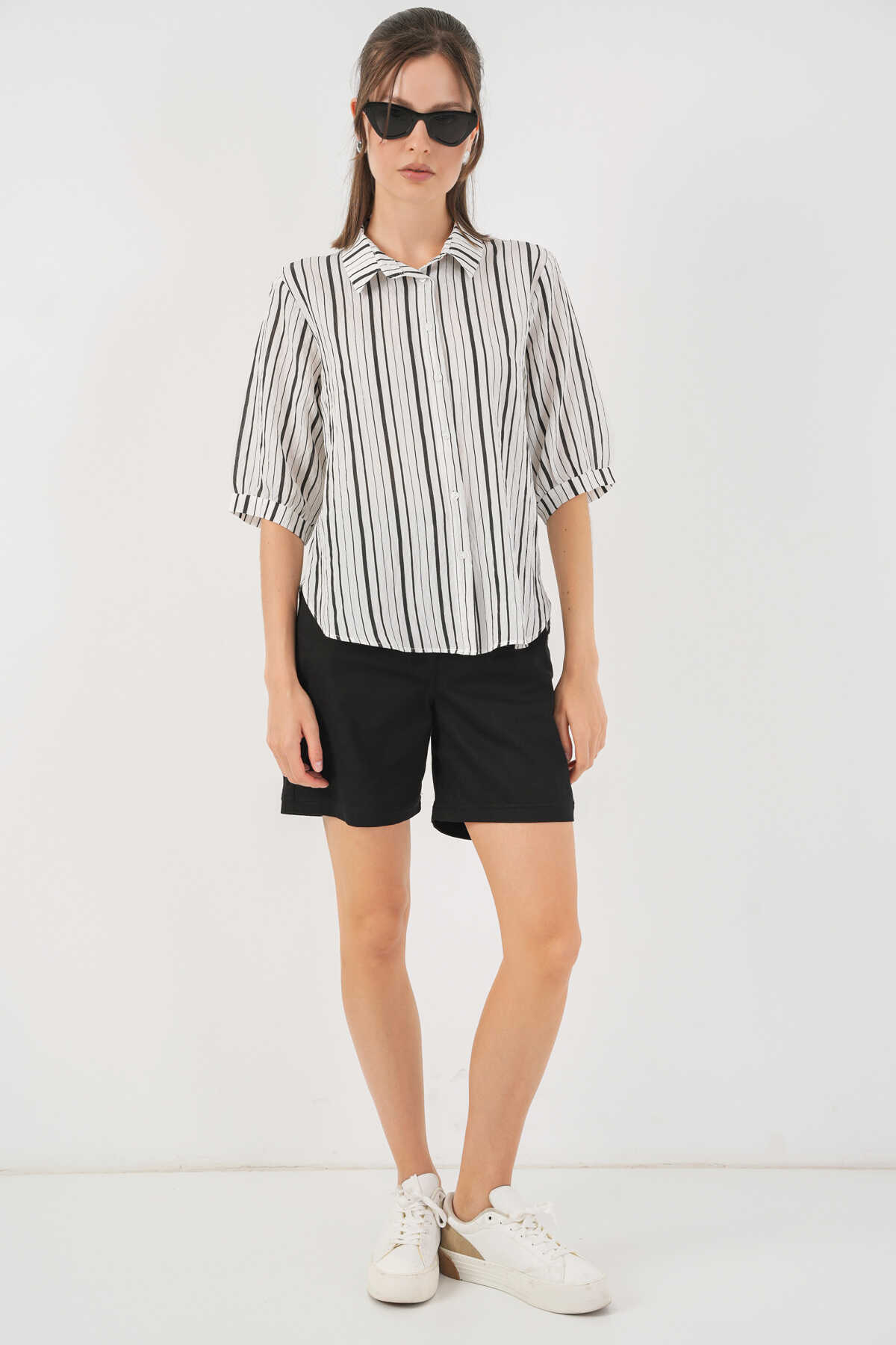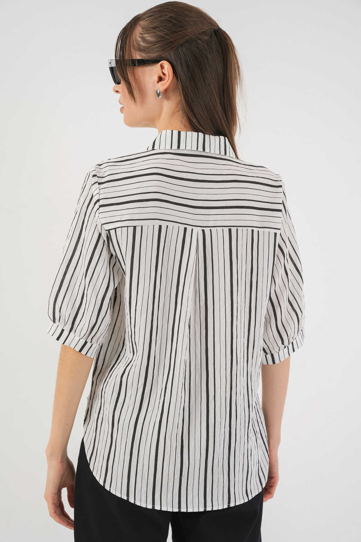 Kadın Çizgili Kısa Kol Gömlek 20345 - Siyah - Kombin