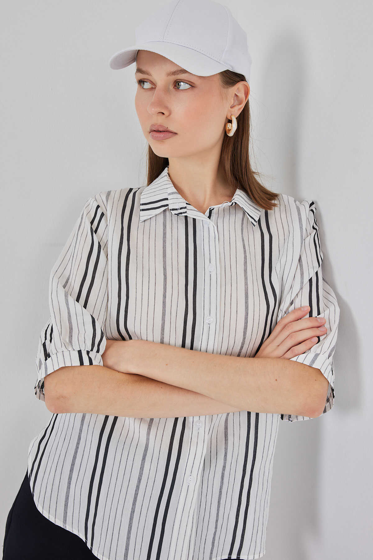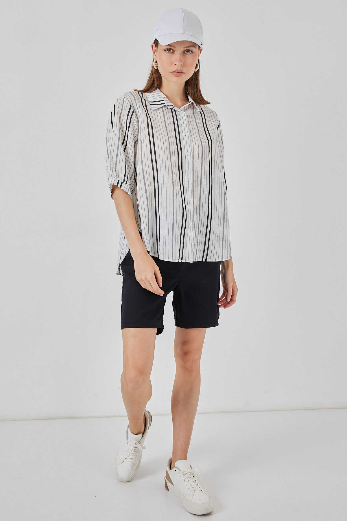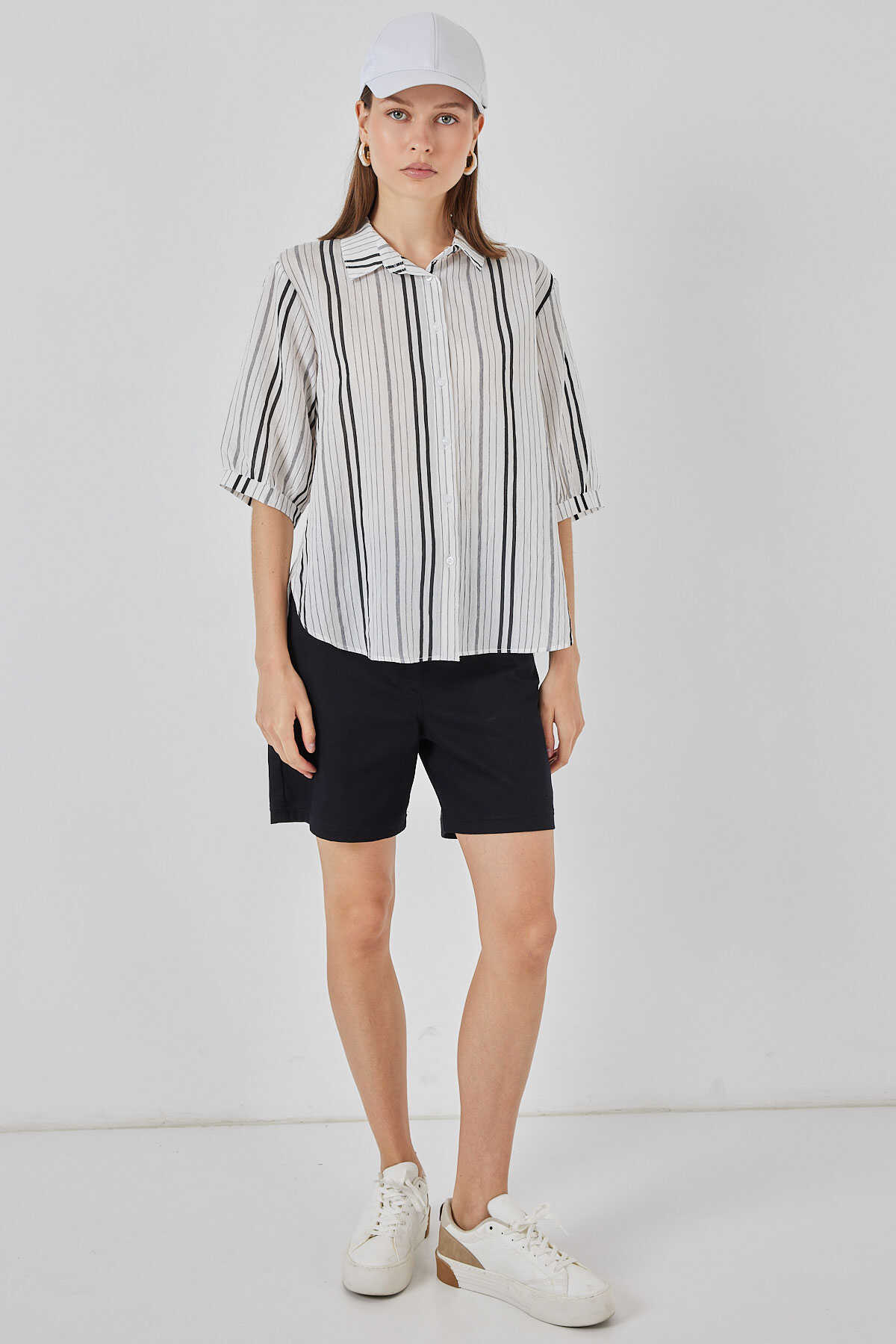 Kadın Çizgili Kısa Kol Gömlek 20345 - Taş - Kombin