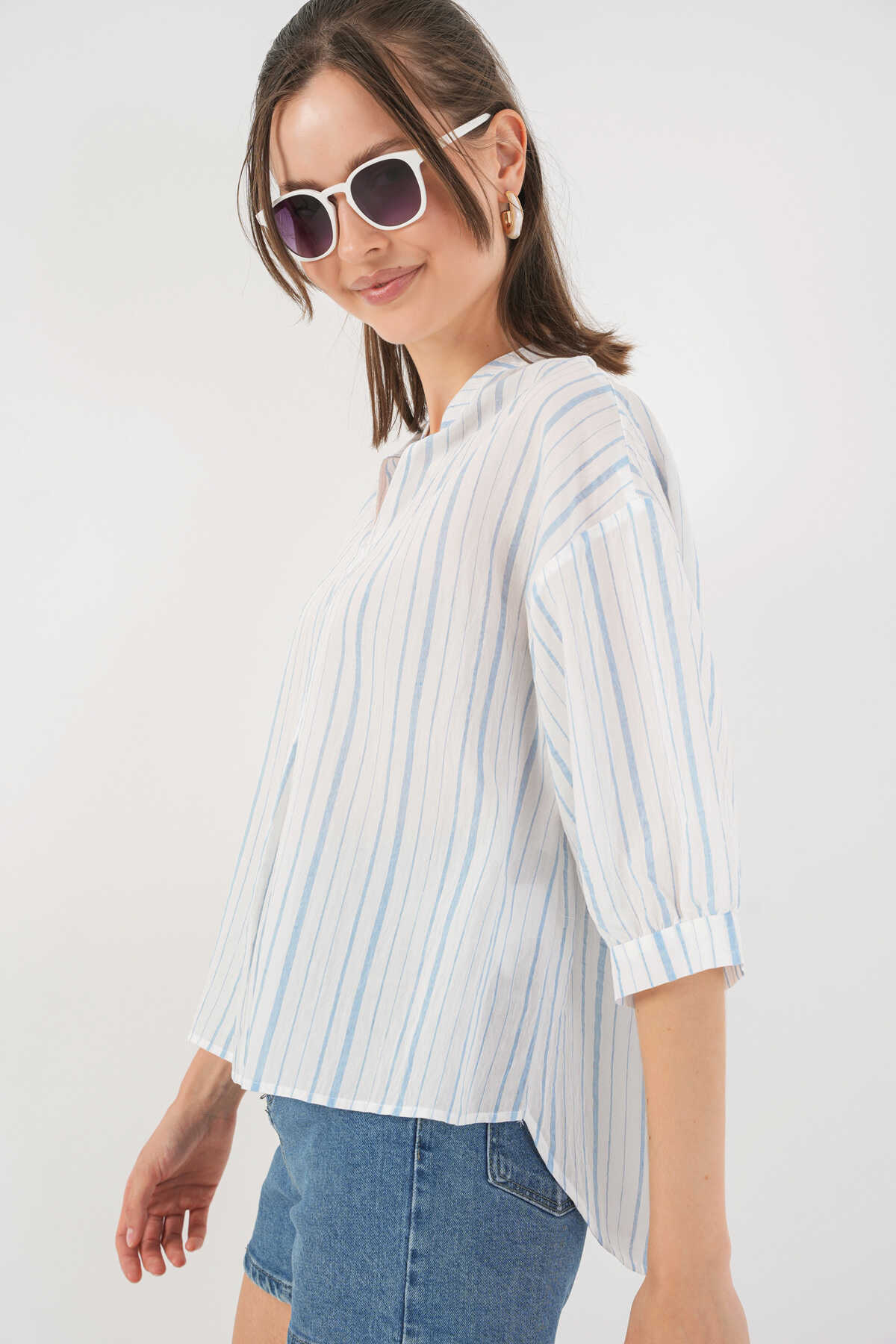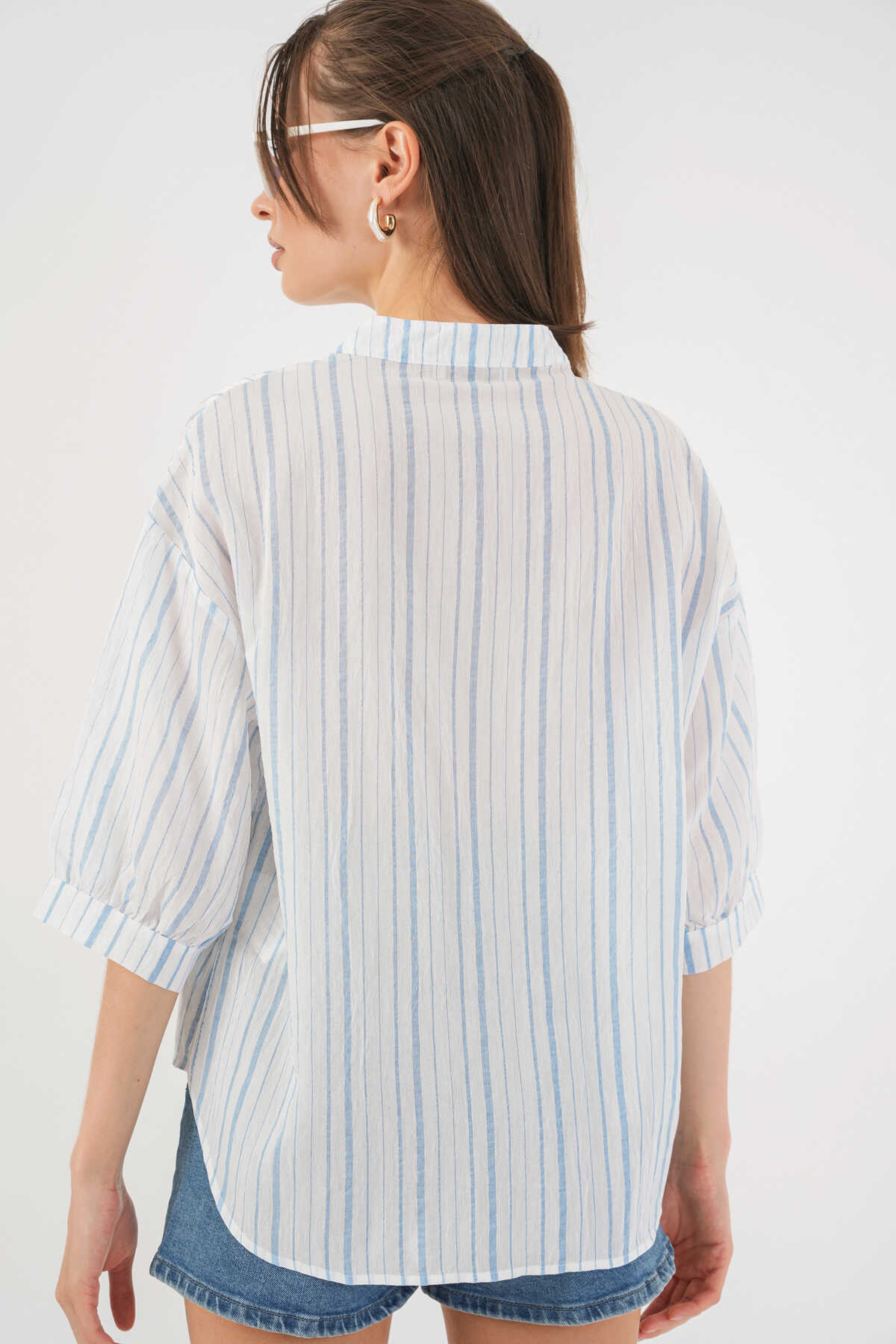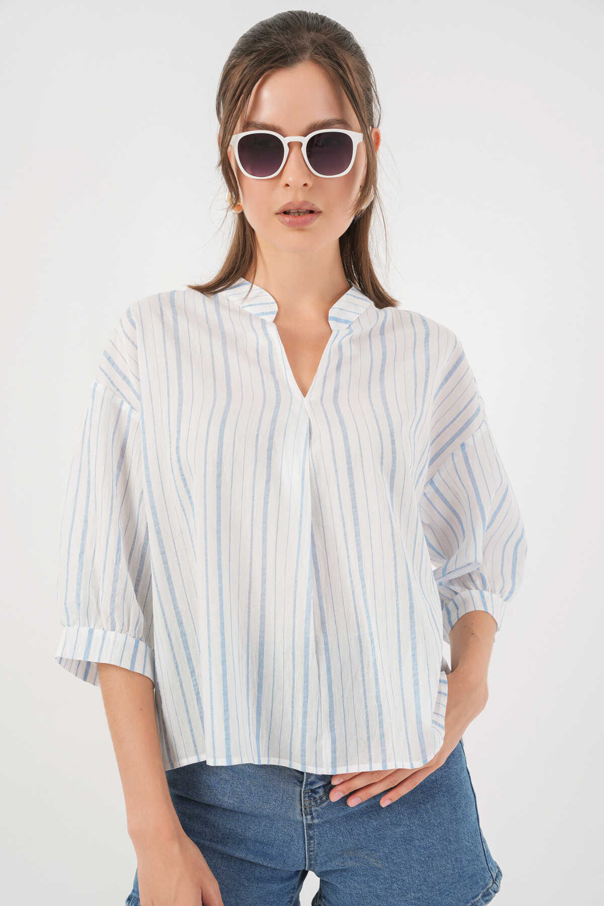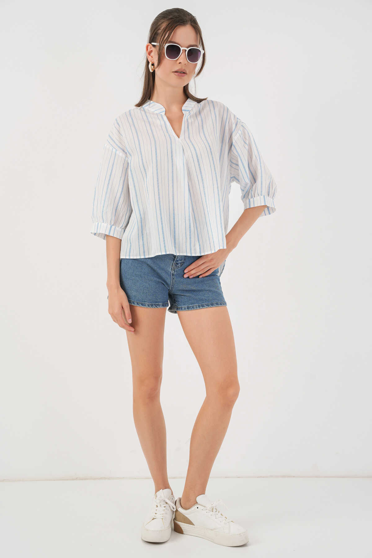 Kadın Çizgili Oversize Bluz 967 - A.Mavi - Kombin