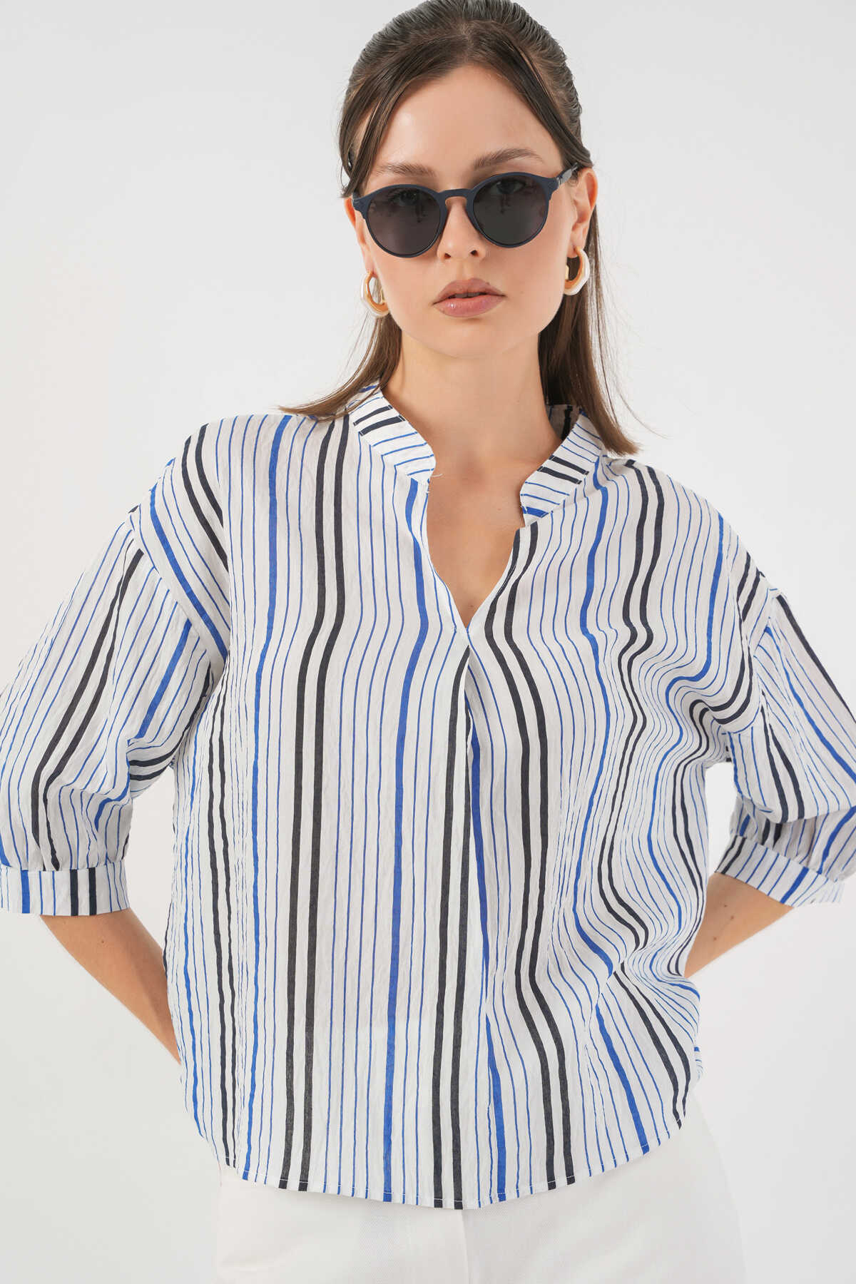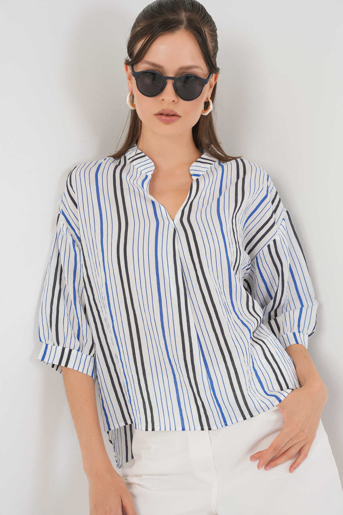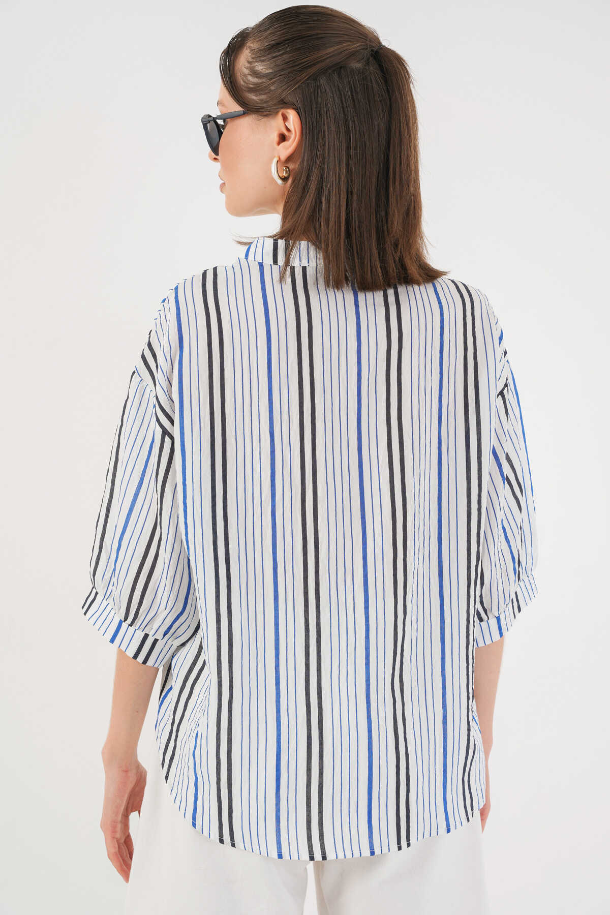 Kadın Çizgili Oversize Bluz 967 - Lacivert - Kombin