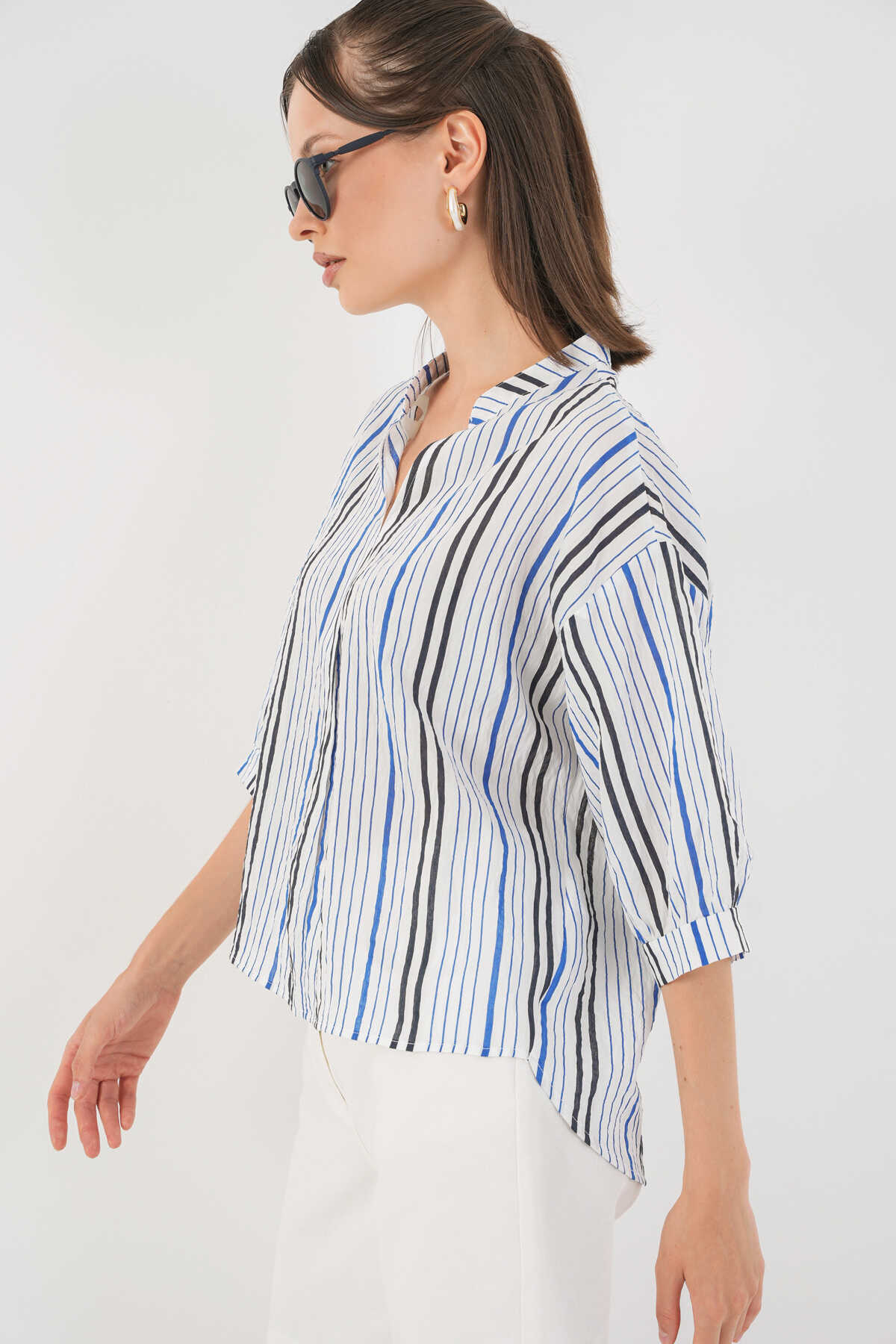 Kadın Çizgili Oversize Bluz 967 - Lacivert