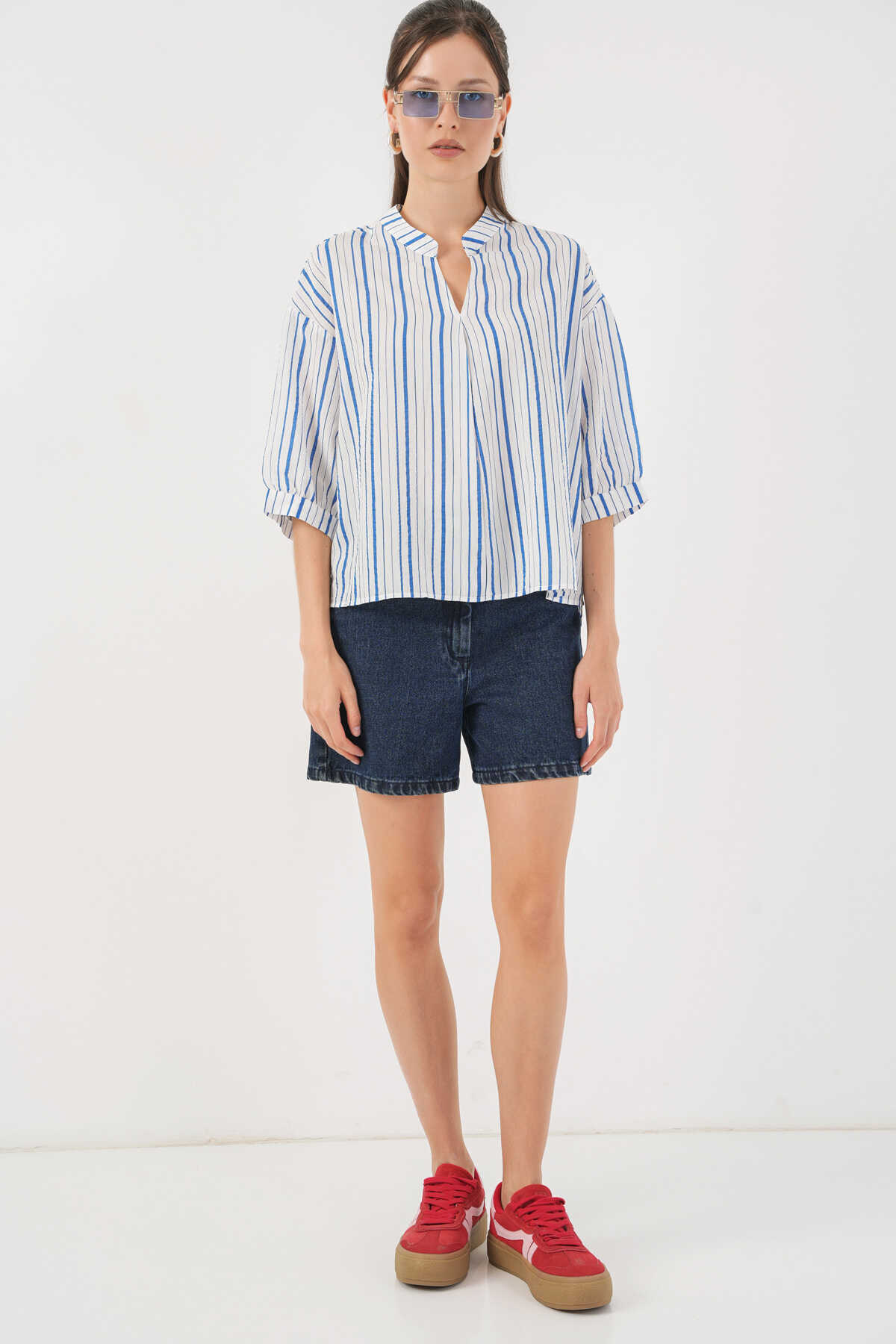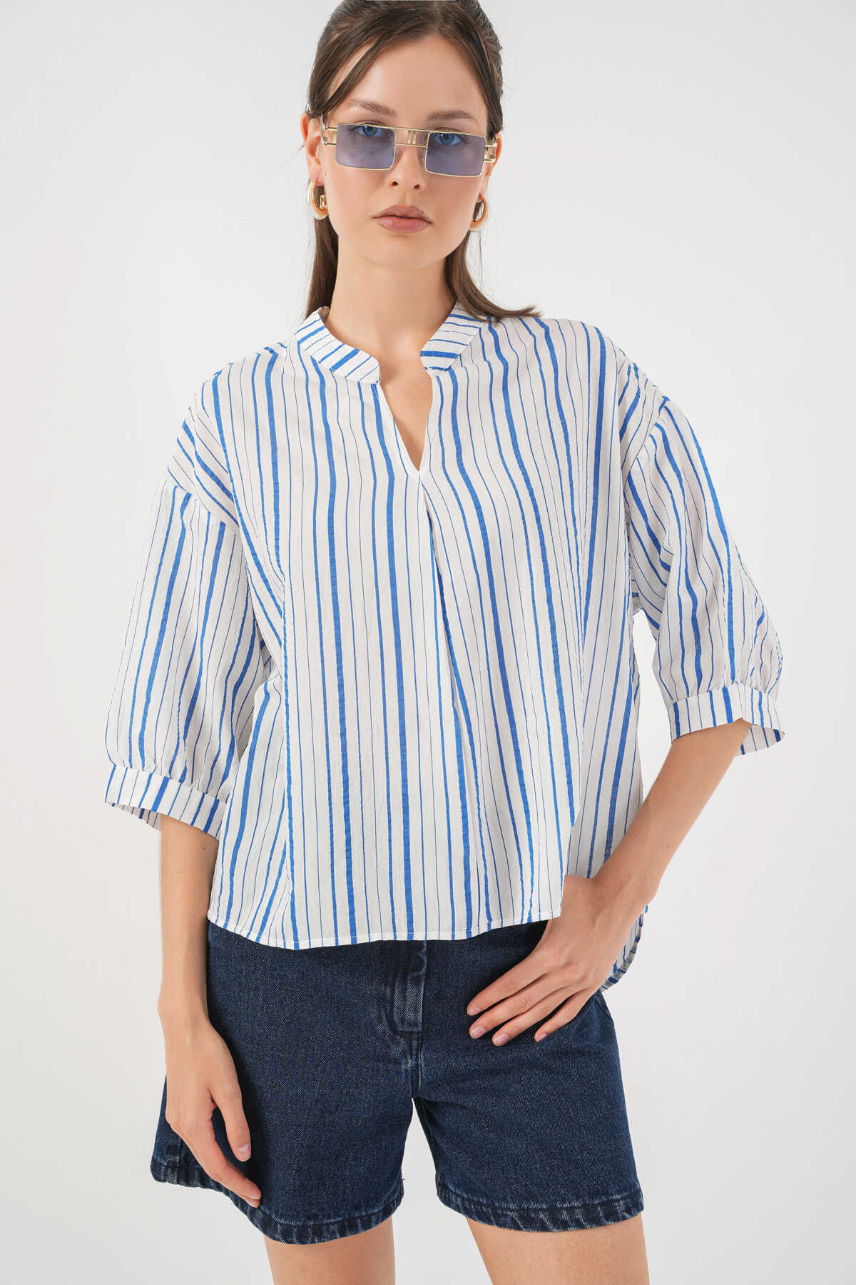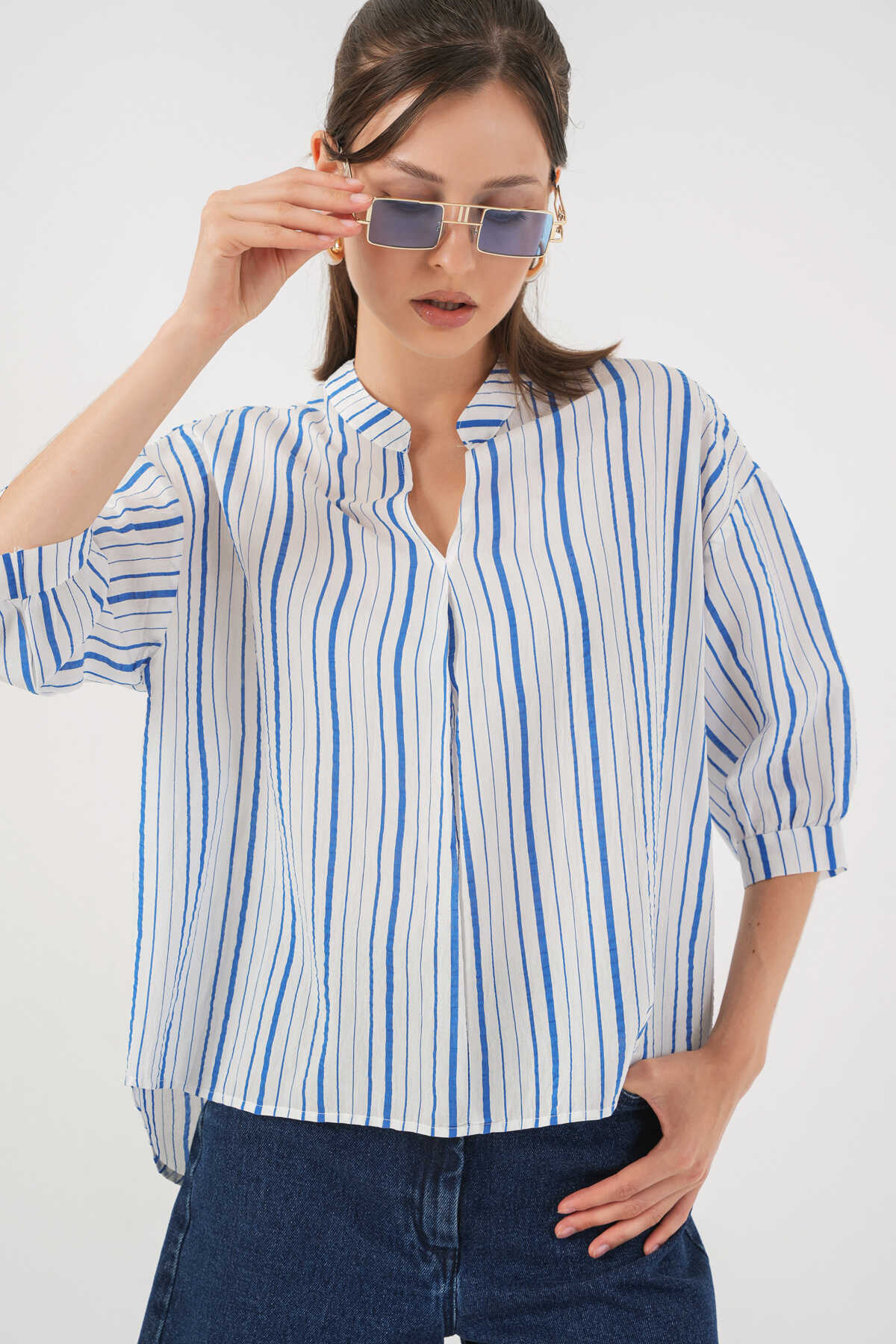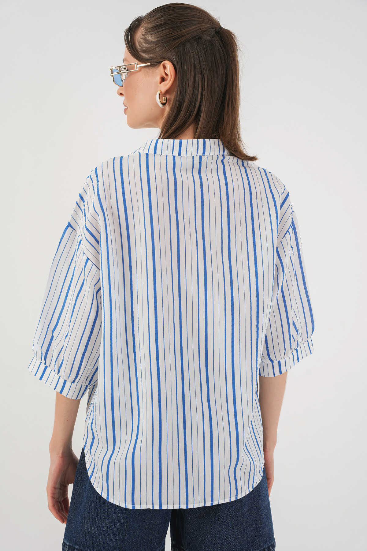 Kadın Çizgili Oversize Bluz 967 - Mavi - Kombin