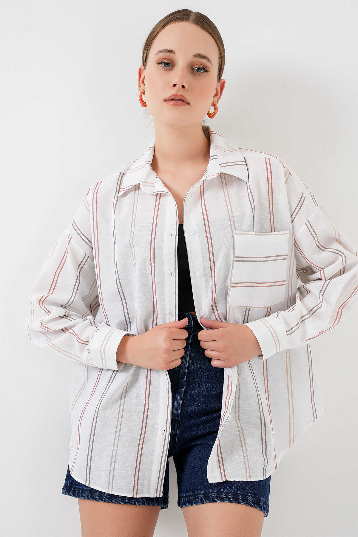 Kadın Çizgili Oversize Gömlek 20278 - B.Beyaz - Kombin