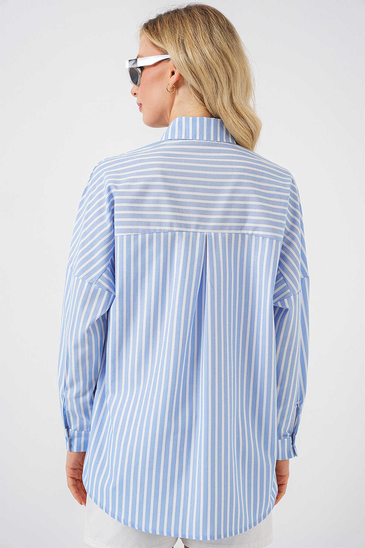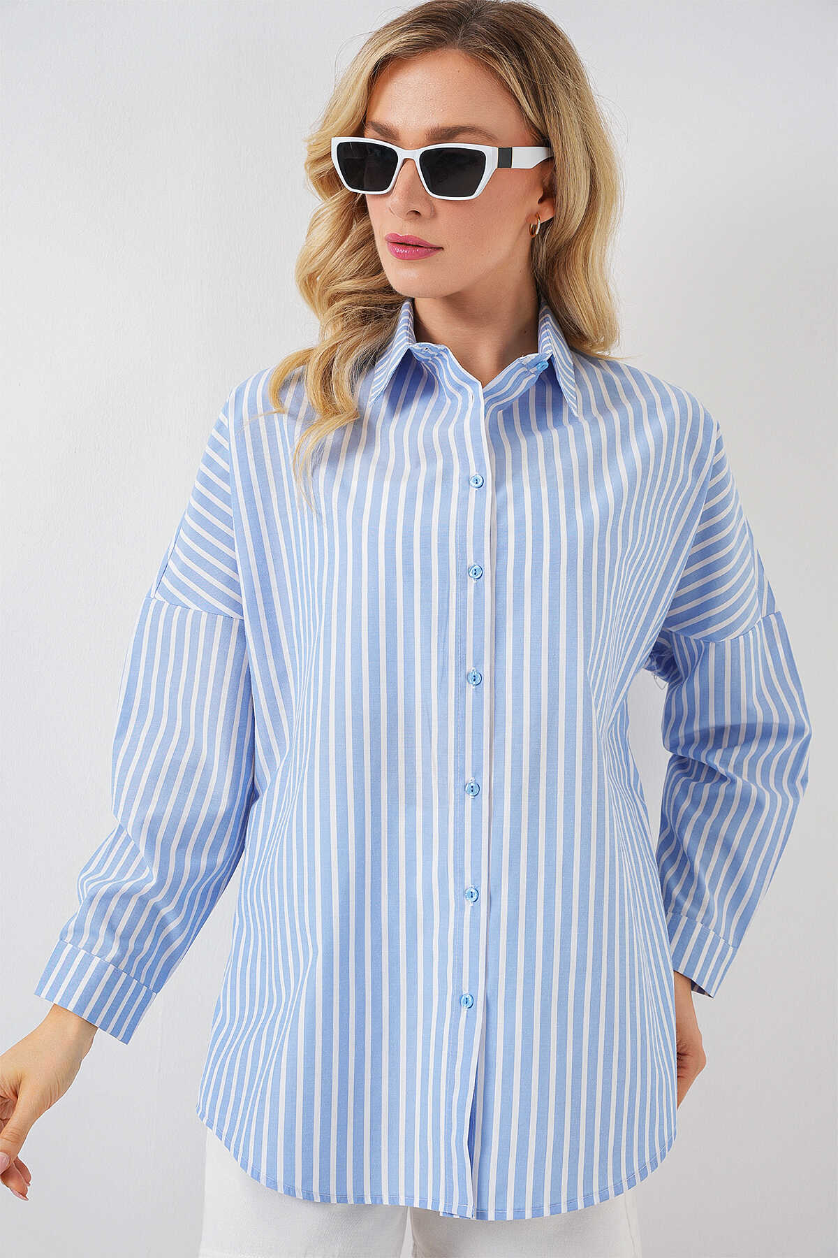 Kadın Çizgili Oversize Gömlek 20332 - B.Mavi - Kombin